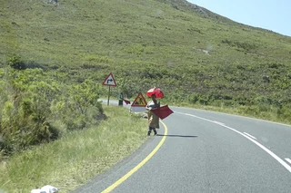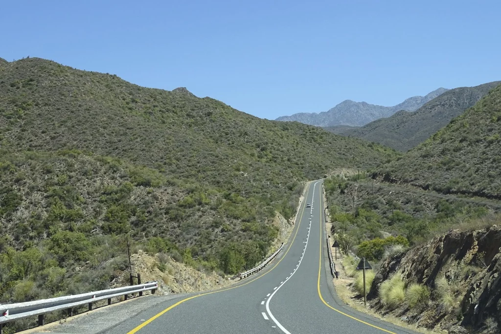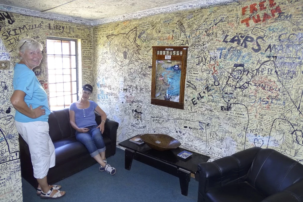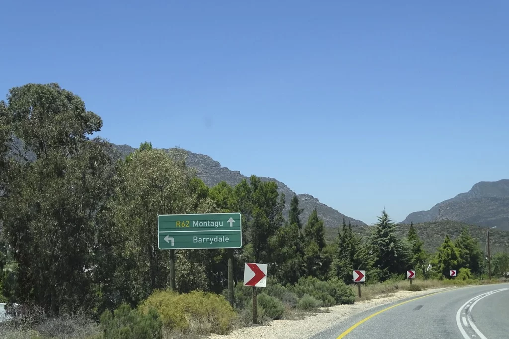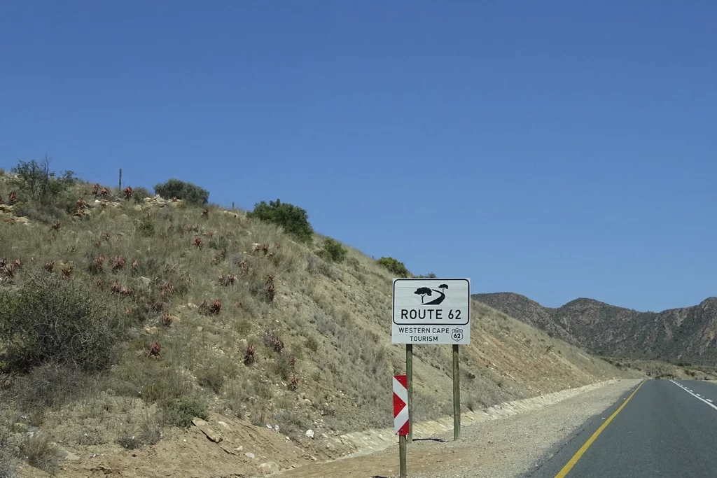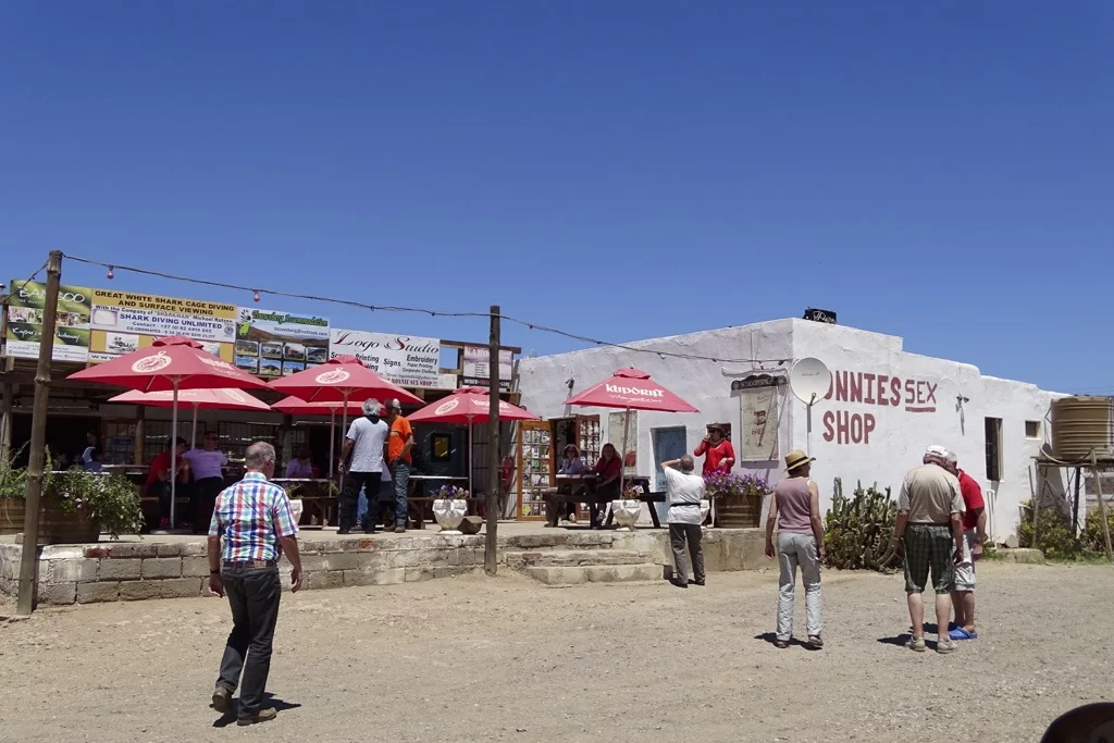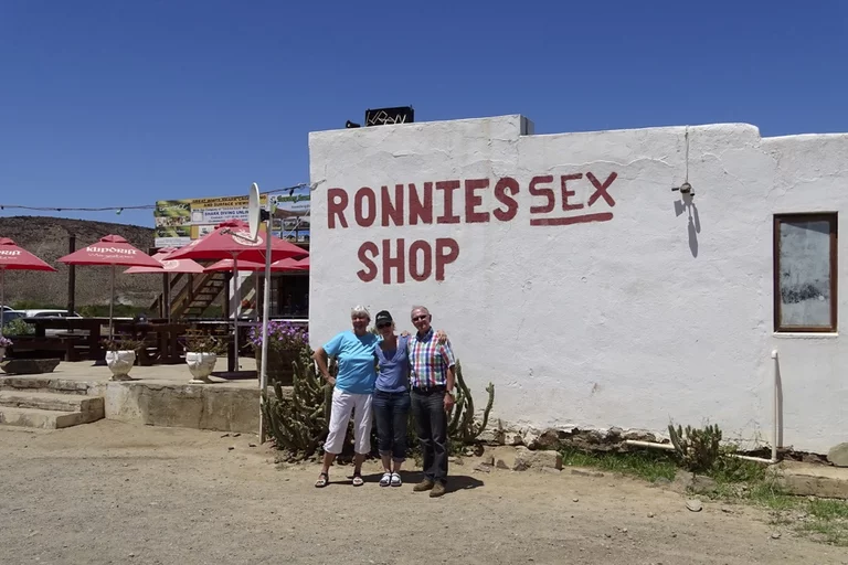 Die Strecke führt uns über die Route 62 (fast so berühmt wie die Route 66 in den USA) durch die Klein Karoo (kein Schreibfehler) in Richtung Franschhoek und Stellenbosch, den beiden wohl bekanntesten Orten des Weinanbaugebiets nahe Kapstadt. Die Sonne meinte es noch einmal richtig gut mit uns, denn das Thermometer kletterte im Tagesverlauf bis auf 39°. Die Strecke schwingt durch die Berge der Karoo und bietet immer wieder herrliche Ausblicke auf diese trockene, hügelige Landschaft. Natürlich ist ein Stop an Ronnie's Sex Shop obligatorisch, und wie immer war auch heute dort der Teufel los. Eigentlich war es vor vielen Jahren einmal nichts weiter als ein Coffee Shop am Straßenrand, bis irgend ein Witzbold auf die Idee kam, mit der Spraydose dem Namen des Shops das Wort Sex hinzuzufügen. Seit dem brummt der Laden. Wie heisst es so schön." Sex sells!!!".