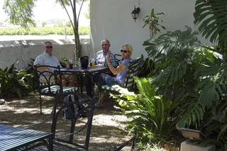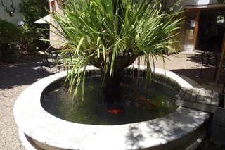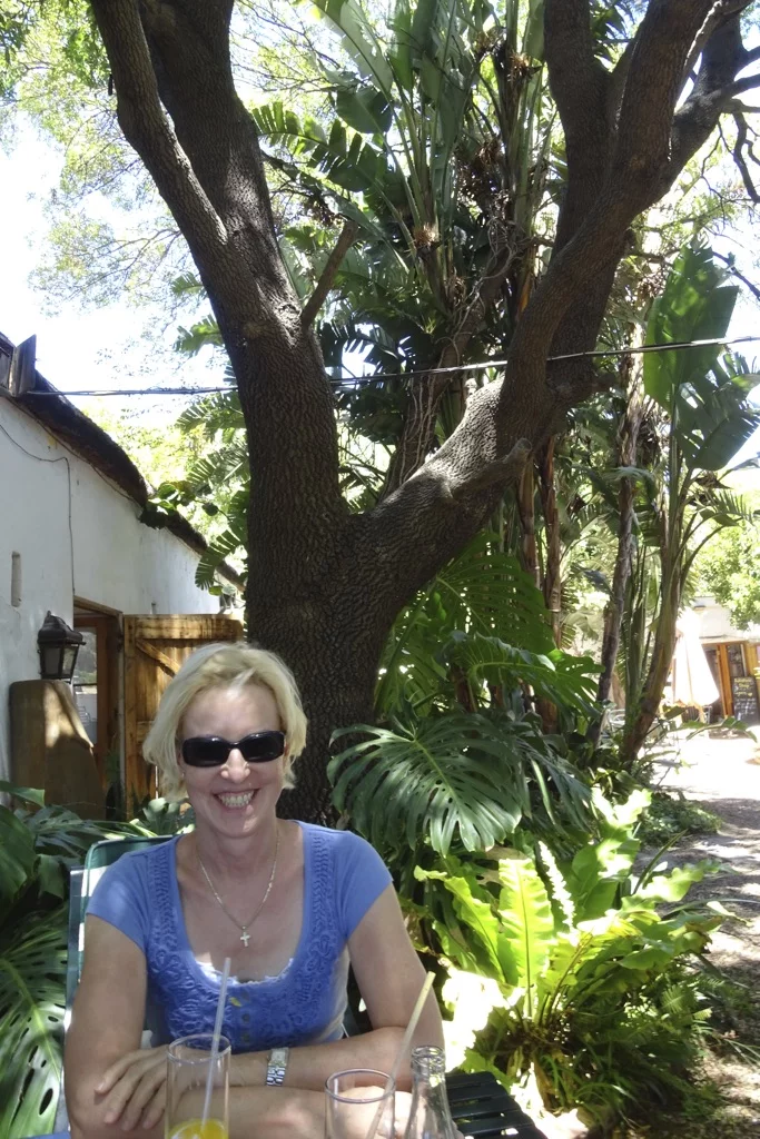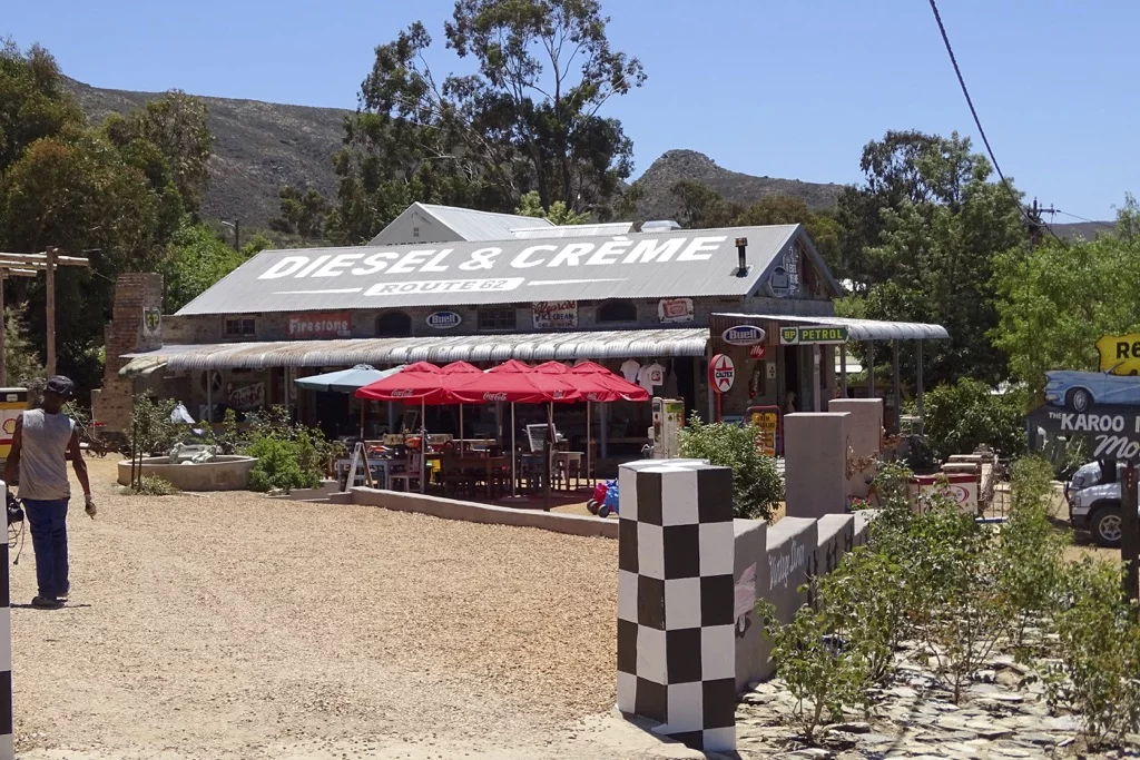 Am Ortseingang von Barrydale haben wir dann ein Schild zu einem kleinen Restaurant mit Namen Oude Kombuis gesehen. Da es bereits Mittag war, sind wir auch gleich für einen kurzen Mittagstop eingekehrt. Mal wieder hatten wir den richtigen Riecher, denn zu dem Restaurant gehörte ein wunderschöner Garten mit schattenspendenden Bäumen, freilaufenden Hühnern und einem alten Brunnen mit Fontäne in dem einige Koi-Karpfen gemütlich ihre Runden zogen.
