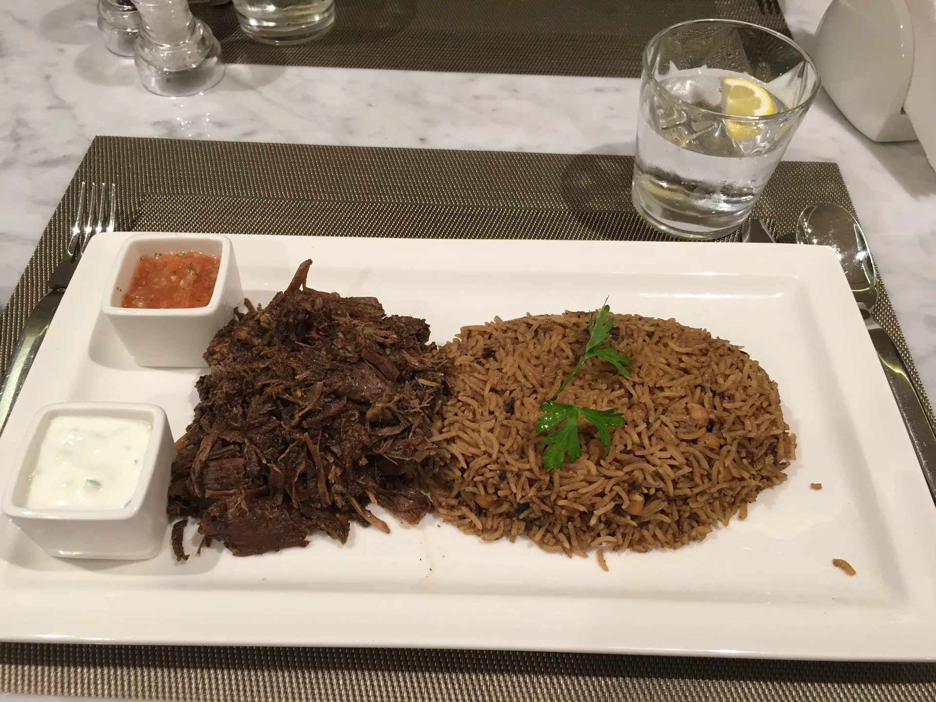 Nach einer kurzen Pause im Hotel gab es dann unser erstes omanisches Abendessen in einem sehr schönen, aber auch seeehr kalten Restaurant in der Stadt. Eigentlich wollten wir an der Rezeption nur einen Tip bekommen, wo man in der Nähe etwas zu essen bekommt. Das Ergebnis war der kostenlose Transport mit dem Hotel-Shuttle und die Reservierung im Restaurant.