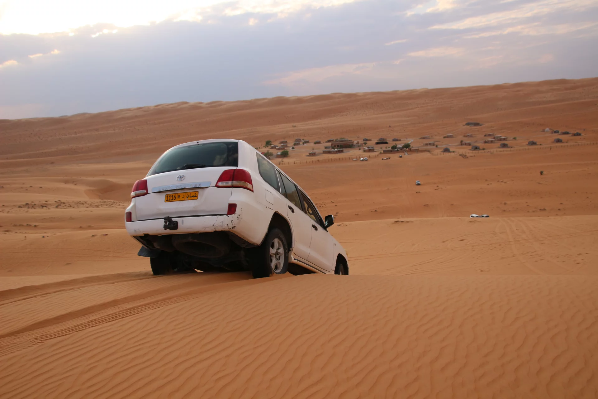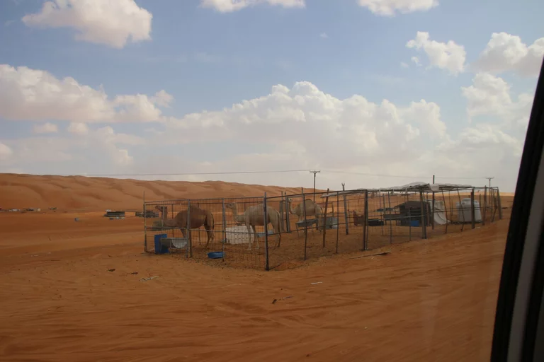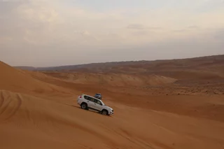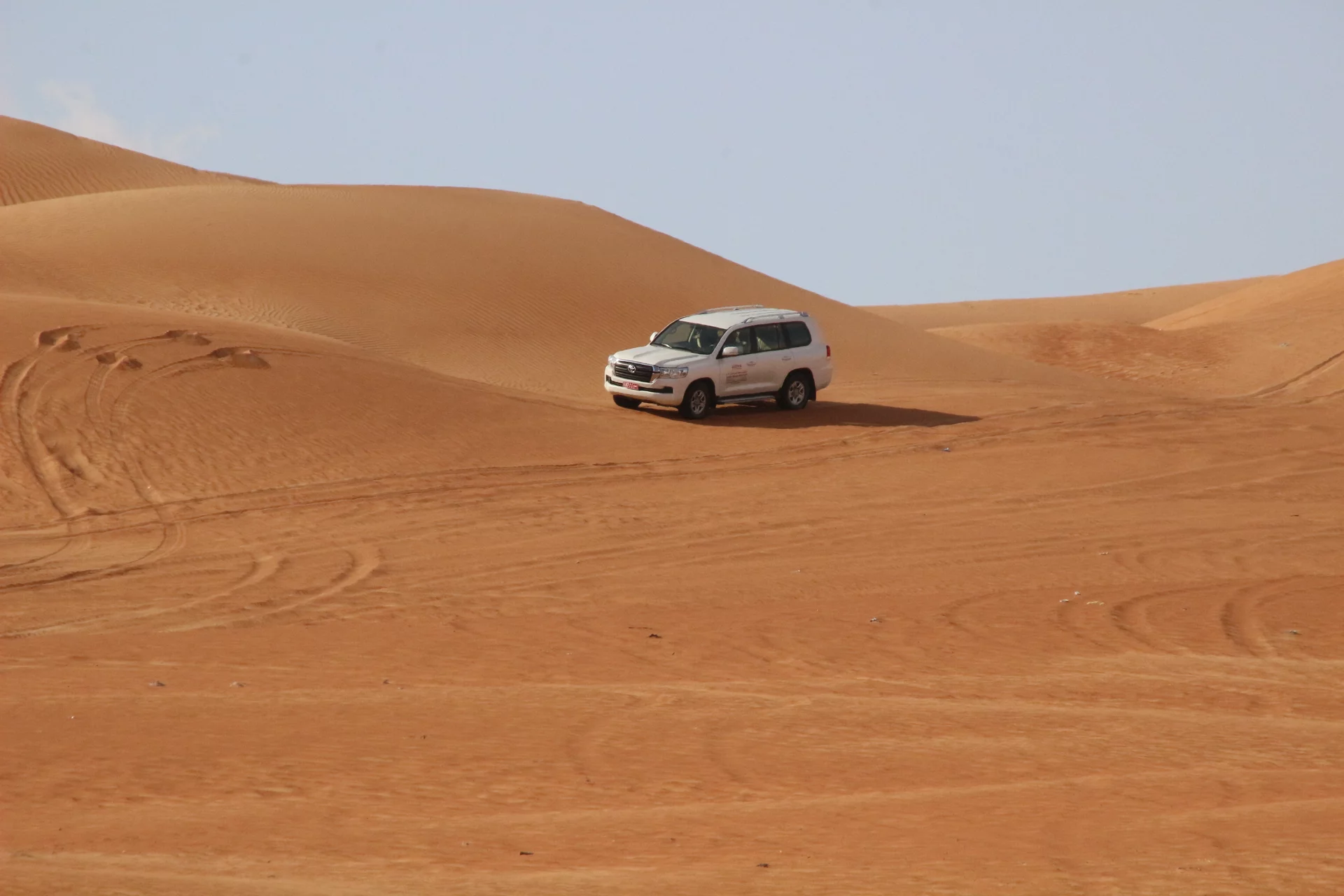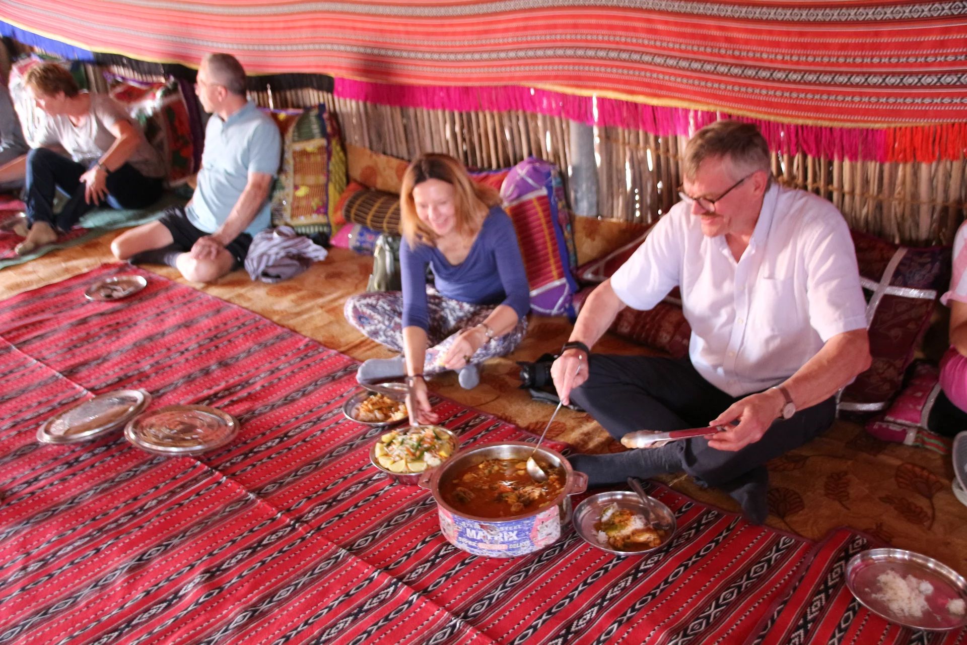 Das richtige Abenteuer begann dann gegen Mittag. An einer Tankstelle vor den Toren der Wüste in der Stadt Biddiyah wurden zunächst die Fahrzeuge gewechselt. Mit großmotorigen Allradfahrzeugen ging es dann zunächst in die Wüste zu einem Beduinen Camp. Nach einem herzlichen Empfang, traditionell mit Datteln und omanischem Kaffee oder Tee, gab es ein leckeres Mittagessen. Danach ging es weiter zum Safari Desert Camp, unserer Unterkunft für eine Nacht. Auf dem Weg dorthin bekamen wir bereits einen kleinen Vorgeschmack darauf, was es heißt, durch die Dünen zu “heizen”.