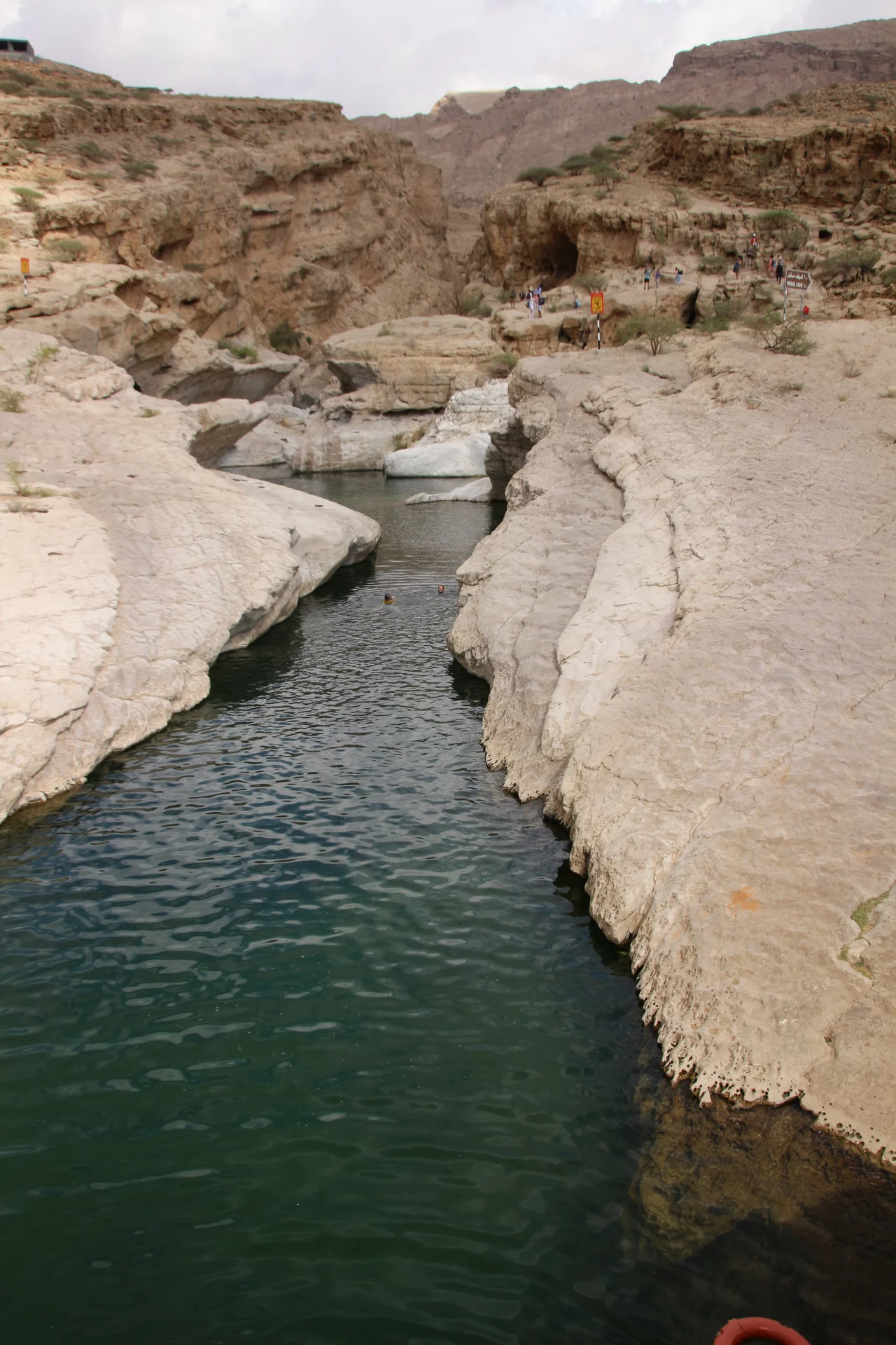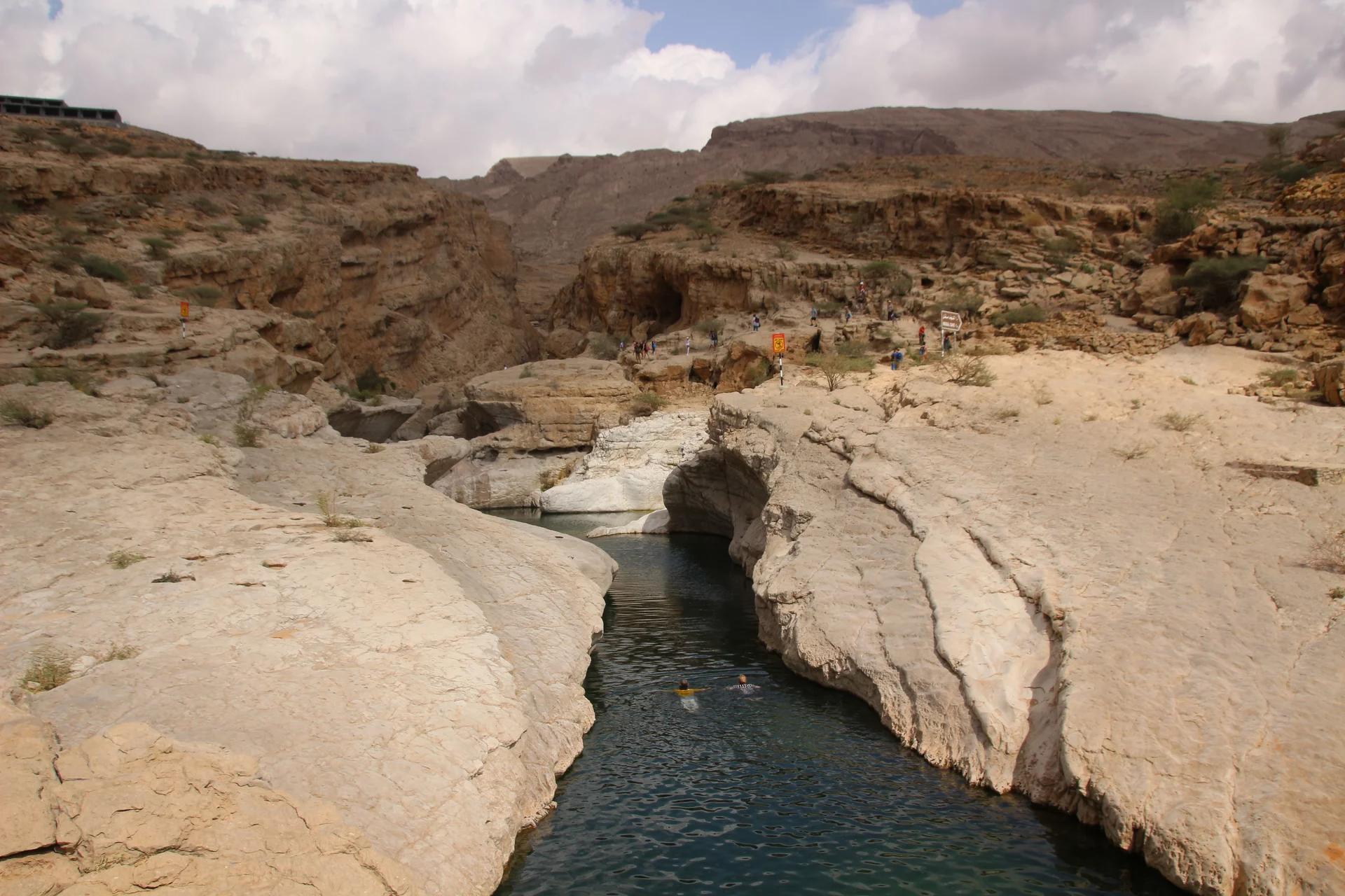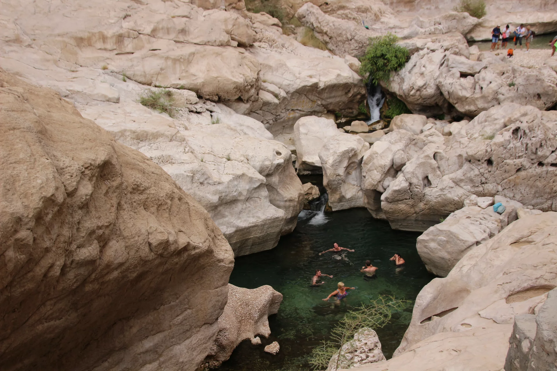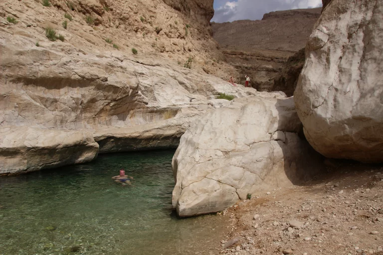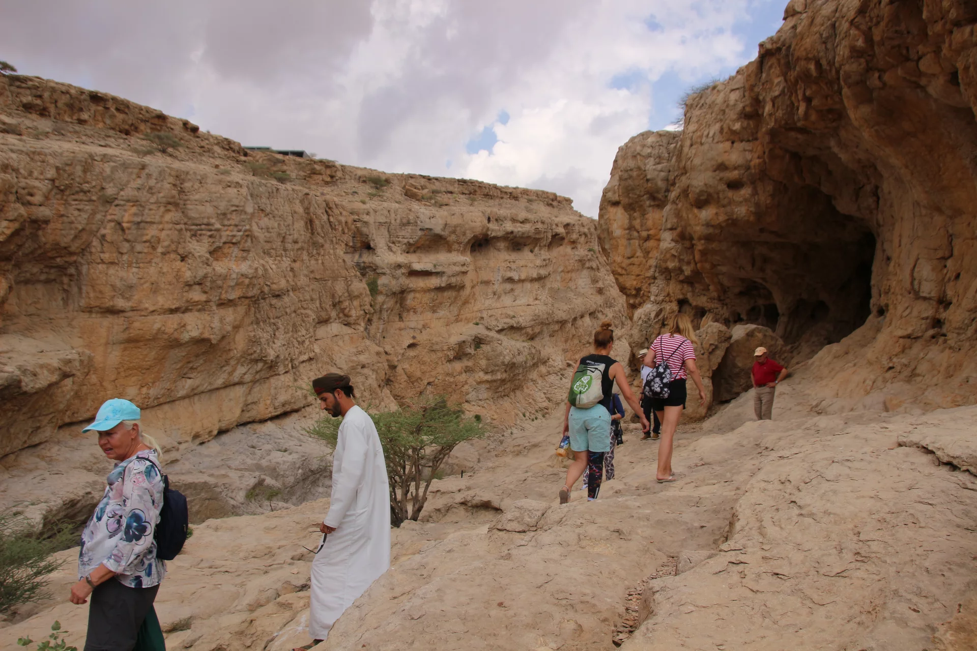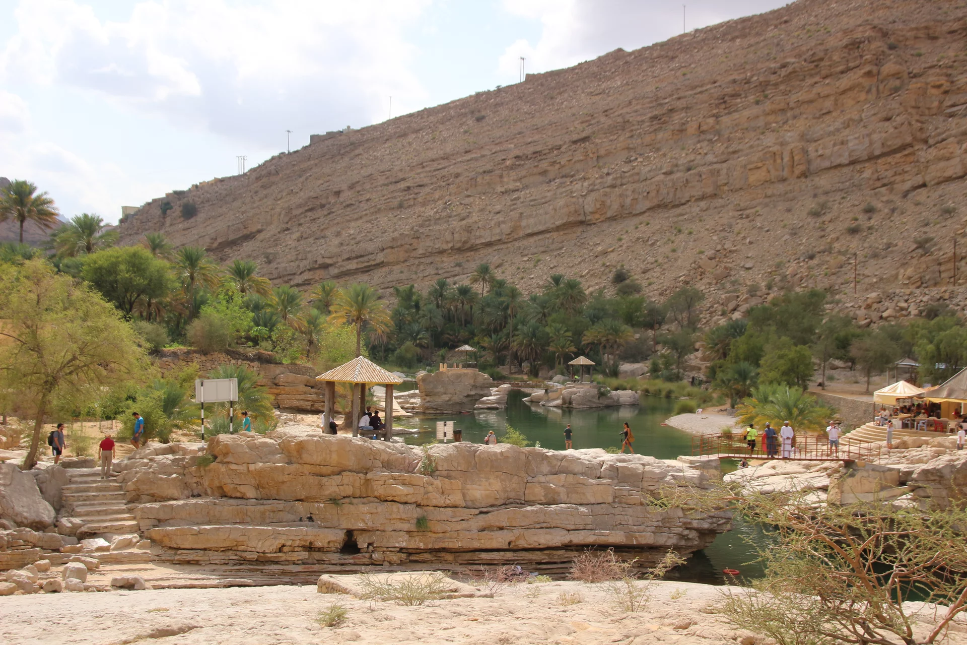 Das Wetter war leider ein wenig gemischt heute morgen. Mehr Wolken als Sonne, jedoch angenehme 28°C. Aber das Wadi Bani Khalid war trotzdem ein tolles Erlebnis. Mit steil aufragende Felswänden, wunderschönen Palmenhainen und natürlichen Pools mit azurblauen Wasser, wenn denn die Sonne scheint. Ein farbenfroher Kontrast zu den ockerfarbigen Sanddünen, die wir am Nachmittag noch besuchen sollten.Schon der Weg zur Badestelle war spektakulär. Das gilt für die wunderschöne Umgebung, aber auch für den etwa 20 Minuten Fußweg vom Parkplatz dort hin. Es ist eine ziemliche Kletterei durch die Felsen, bis man die Badestelle erreicht. Aber es hat sich gelohnt!!