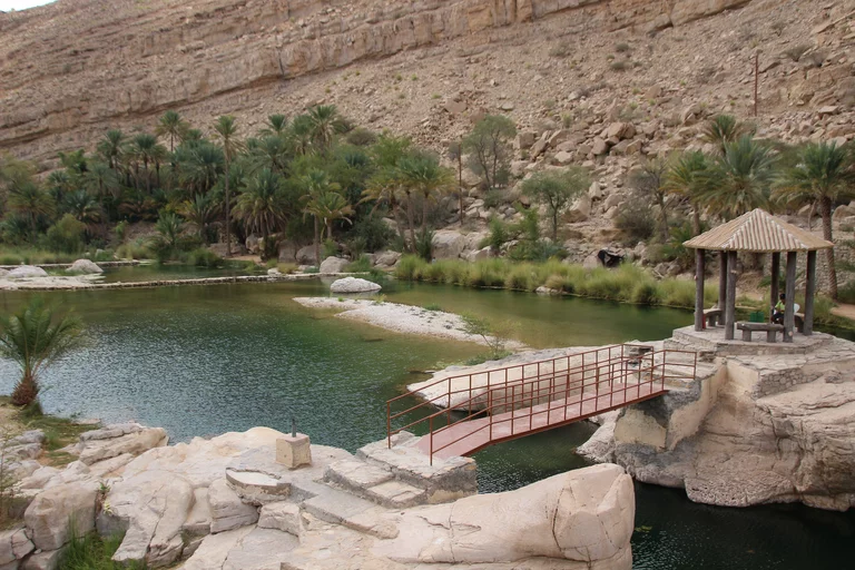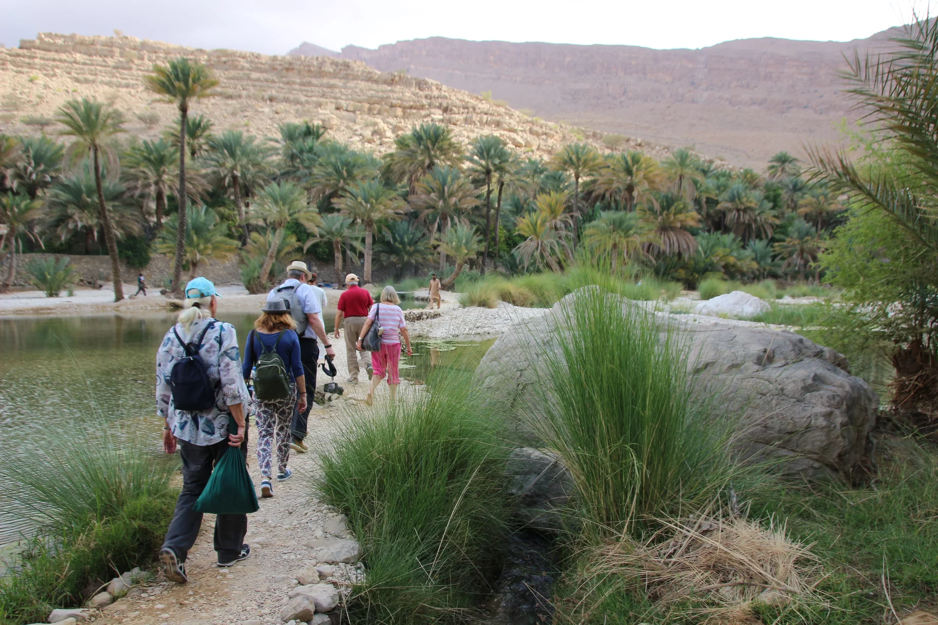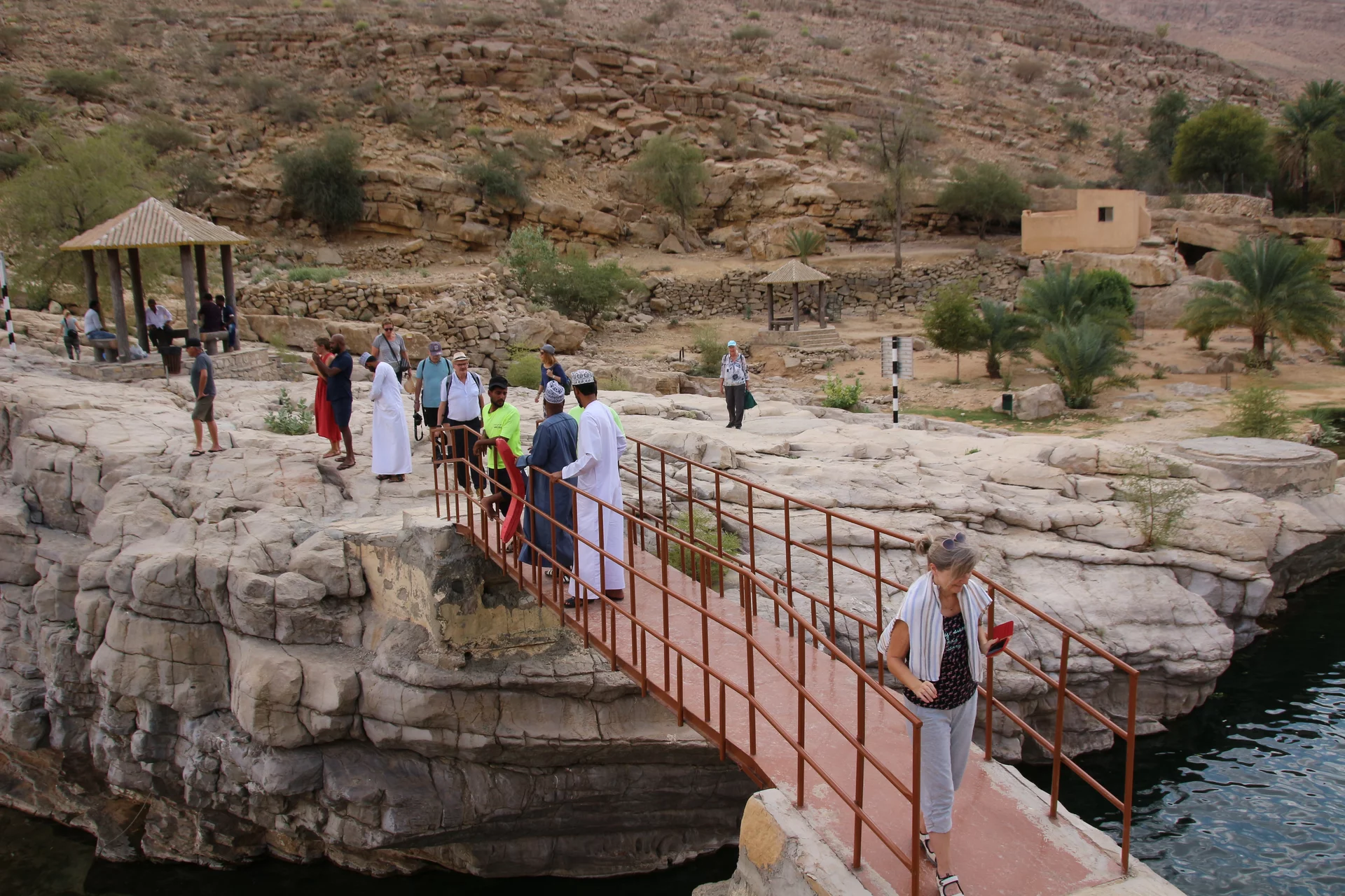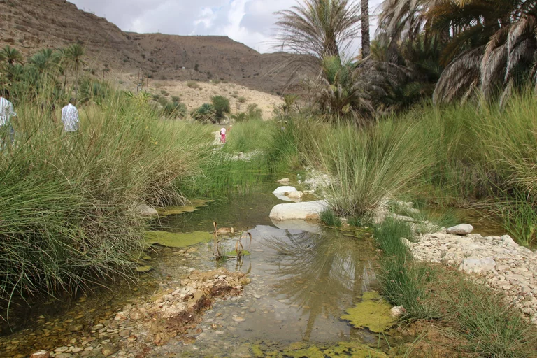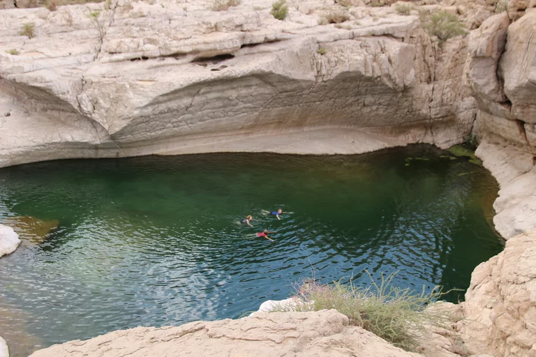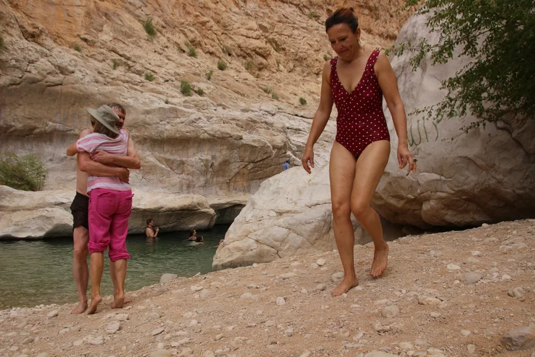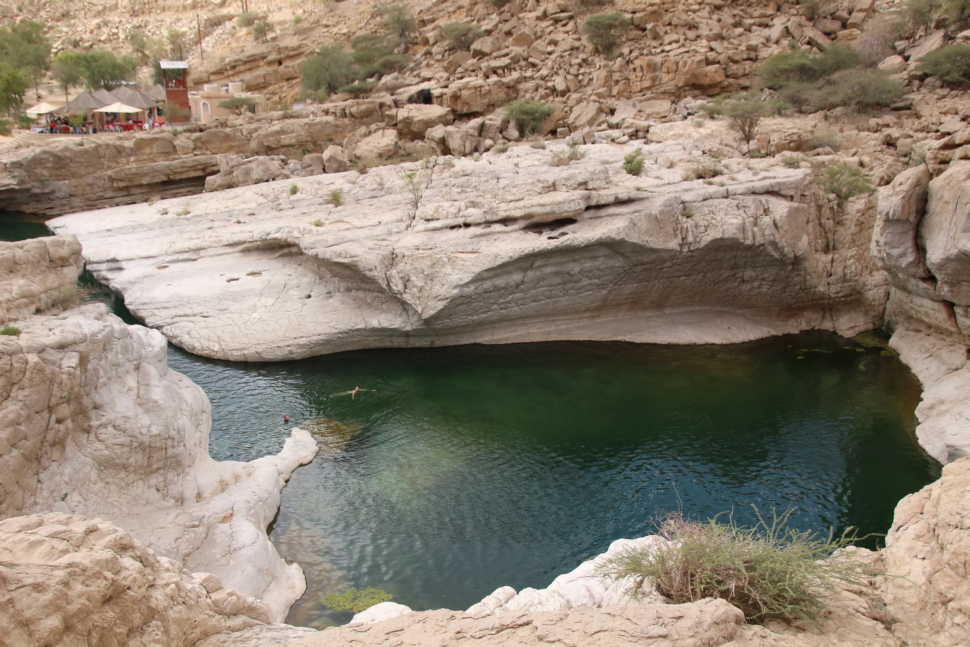 Das Wetter war leider ein wenig gemischt heute morgen. Mehr Wolken als Sonne, jedoch angenehme 28°C. Aber das Wadi Bani Khalid war trotzdem ein tolles Erlebnis. Mit steil aufragende Felswänden, wunderschönen Palmenhainen und natürlichen Pools mit azurblauen Wasser, wenn denn die Sonne scheint. Ein farbenfroher Kontrast zu den ockerfarbigen Sanddünen, die wir am Nachmittag noch besuchen sollten.Schon der Weg zur Badestelle war spektakulär. Das gilt für die wunderschöne Umgebung, aber auch für den etwa 20 Minuten Fußweg vom Parkplatz dort hin. Es ist eine ziemliche Kletterei durch die Felsen, bis man die Badestelle erreicht. Aber es hat sich gelohnt!!