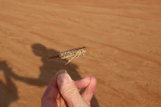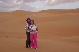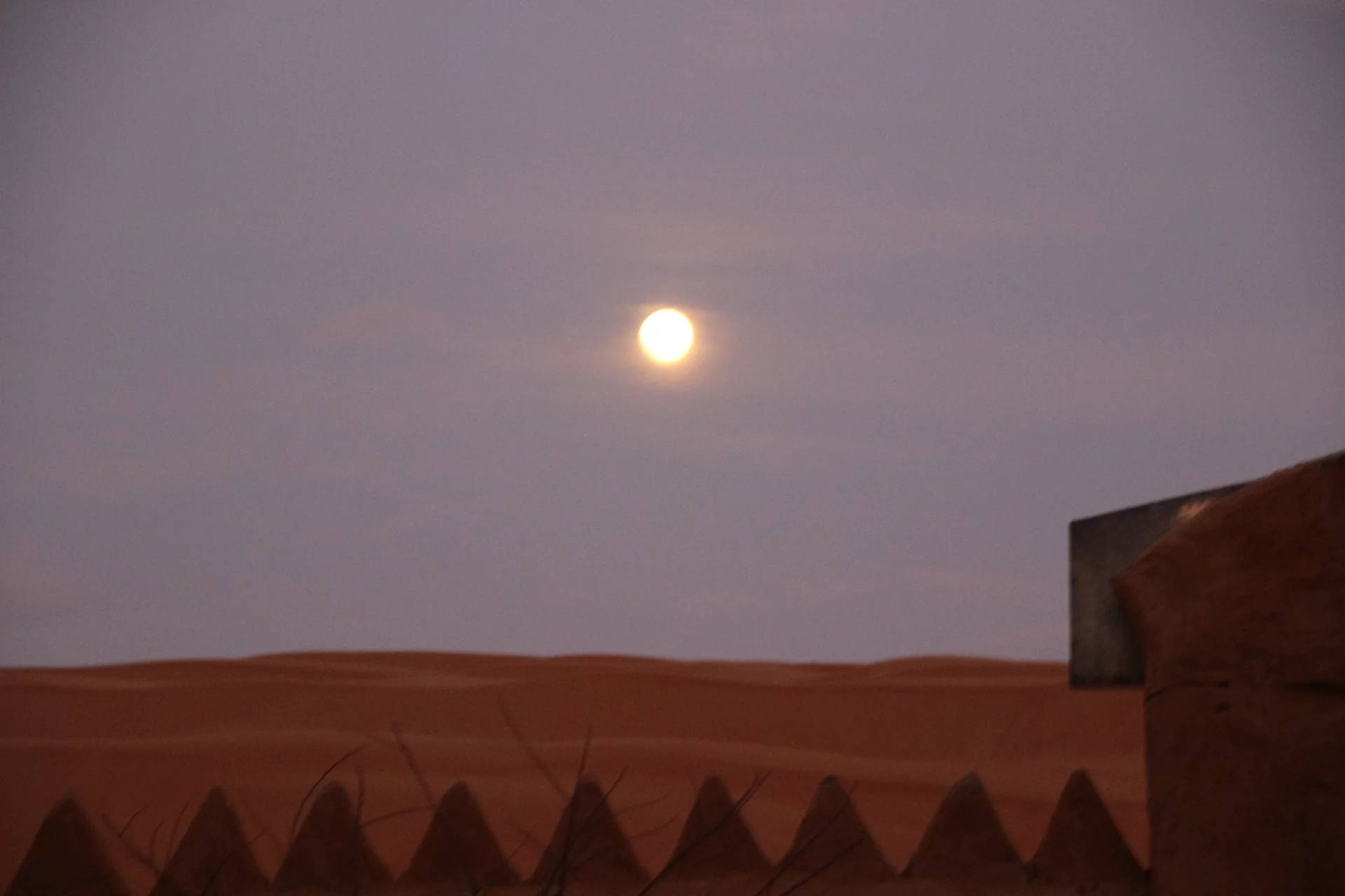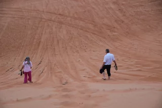 Kurz vor Sonnenuntergang ging es dann auf Jeepsafari in die Dünen. Es folgte eine "Ritt" durch die Wüste mit viel PS, einem Fahrer der genau wusste, was er den unerfahrenen Touristen zumuten konnte und mit jeder Menge Spass. Auf der höchsten Düne in der Nähe des Camps wurden wir dann "ausgeladen", um den Sonnenuntergang zu beobachten und anschließend zu Fuss zum Camp zurückzukehren. Der Sonnenuntergang fiel allerdings optisch aus, denn eine große Wolkenwand schob sich zur denkbar ungünstigsten Zeit vor die Sonne. Somit sind wir dann barfuß durch den Sand wieder nach unten "gehüpft" und zum Camp zurückgegangen.