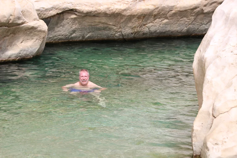 Die wichtigste Frage war: “ Gehen wir ins Wasser oder nicht”? Für mich war die Antwort klar, denn wann bekommt man schon mal die Gelegenheit, in einer Wüstenoase zum Schwimmen zu gehen. Lottchen hat nach einiger Überlegung verzichtet, denn der Einstieg ins Wasser war etwas kompliziert. Dazu kam, dass es zwar zwei kleine “Zelte” zum umkleiden gab (gegen Gebühr), diese aber auch permanent besetzt waren. Für uns Männer ist diese Prozedur doch deutlich weniger schwierig.