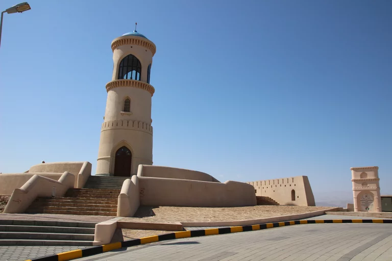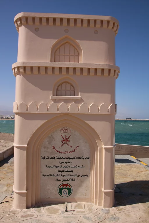 Nach dem Dhau-Museum ging die Fahrt weiter zum Ende der Corniche, der Strandpromenade von Sur. Manche behaupten, es ist die schönste im Oman. Tagsüber flanieren hier Familien und inzwischen auch mehr und mehr Touristen. Wir hatten Glück, denn außer einer kleinen omanischen Familie war niemand sonst in der Nähe. Das Ende der Corniche ziert ein sehr schöner Leuchturm. Man kann ihn zwar nicht besteigen, aber er bietet einen schönen Blick auf die Stadt auf der gegenüberliegenden Hafenseite.