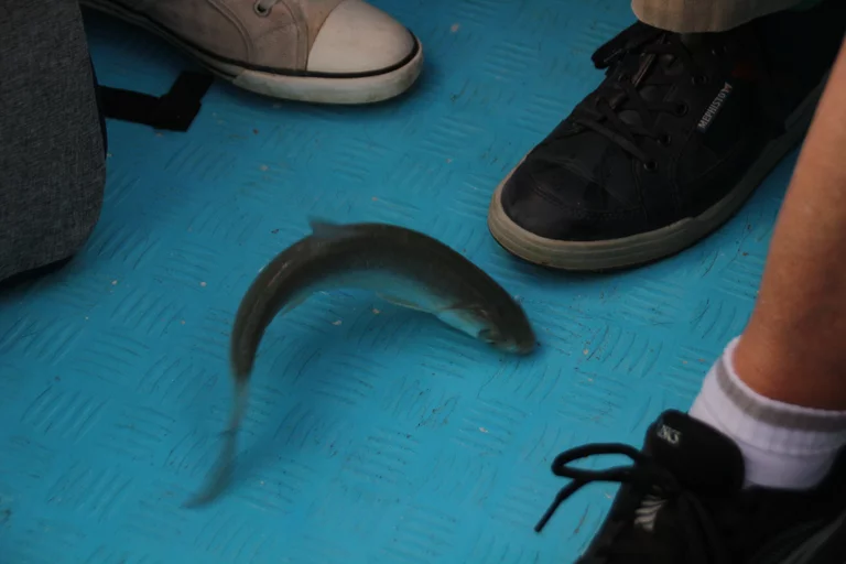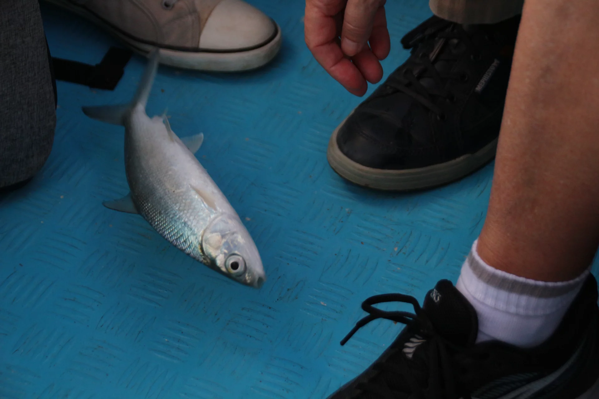 Eigentlich war das Ganze ein Witz, denn laut Programm sollten auf dem Boot die Möglichkeit bestehen, verschiedenen Aktivitäten wie Schnorcheln, Schwimmen oder Angeln nachzugehen. Bedingt durch das Niedrigwasser und hohen Wellen außerhalb des Hafens reichte es nur zu so etwas wie einer verlängerten Hafenrundfahrt. Zwischendrin bekamen wir dann noch Besuch von einem Fisch. Da dies jedoch zur Überladung des Bootes geführt hätte, haben wir ihn unversehrt wieder in sein natürliches Element befördert.