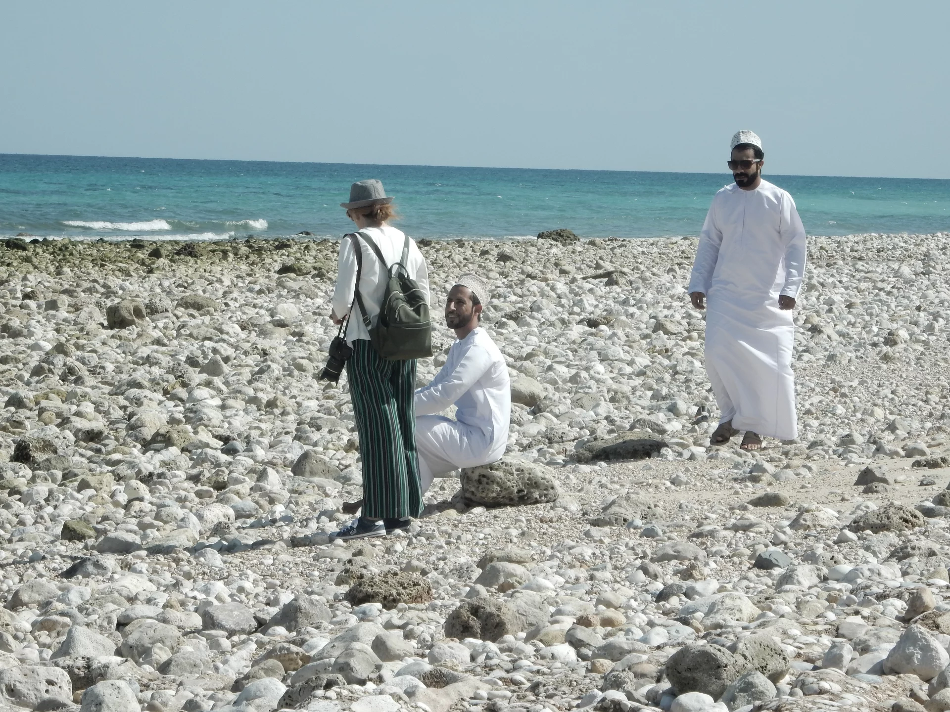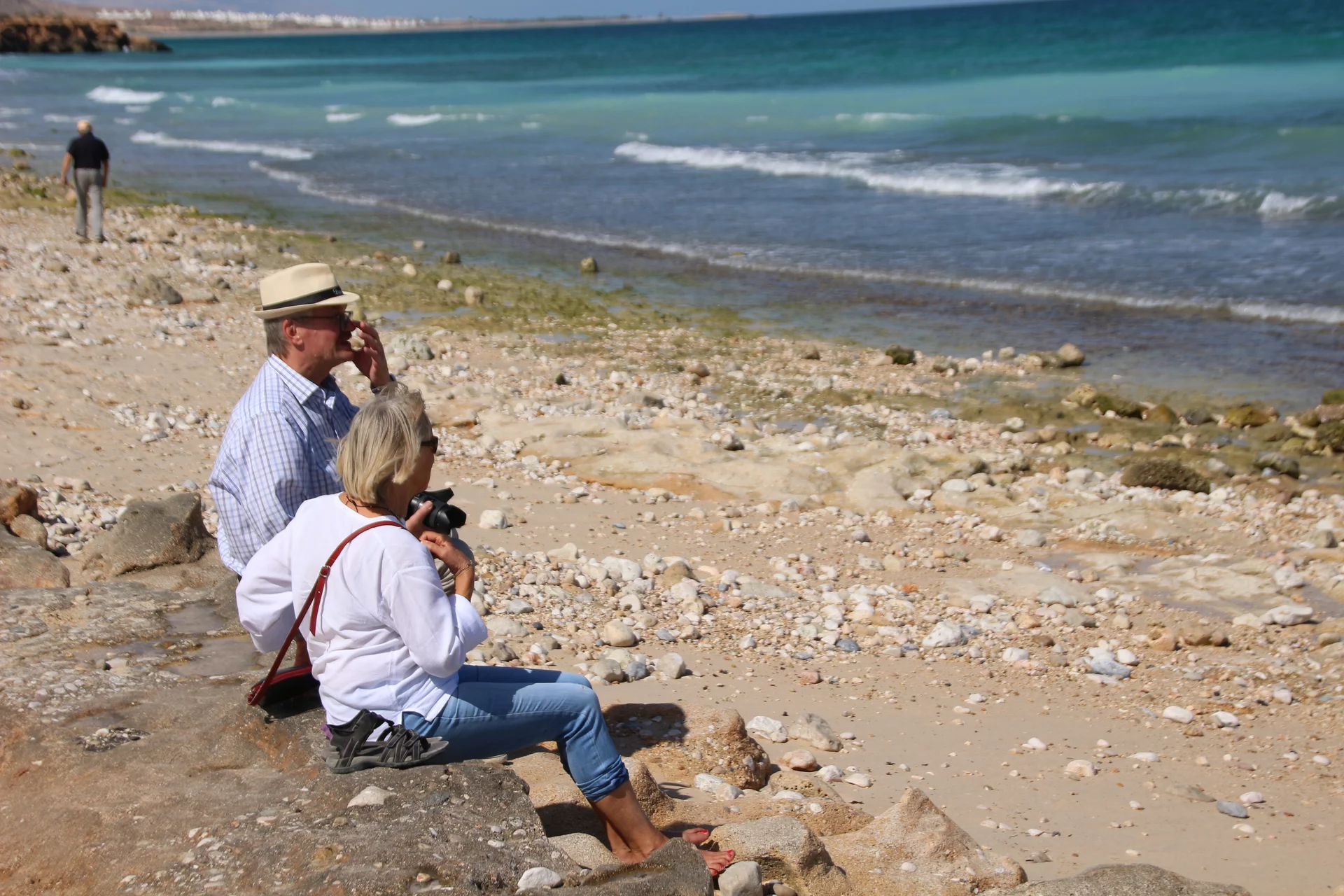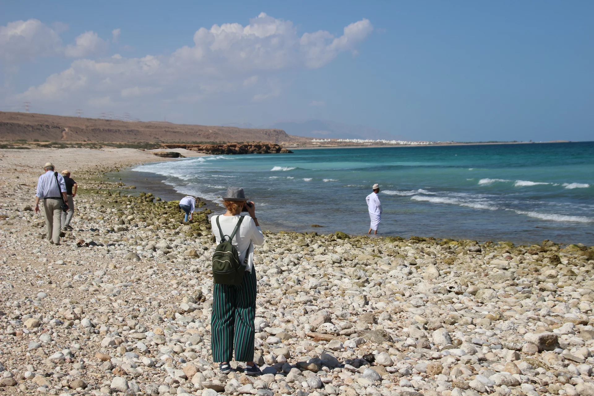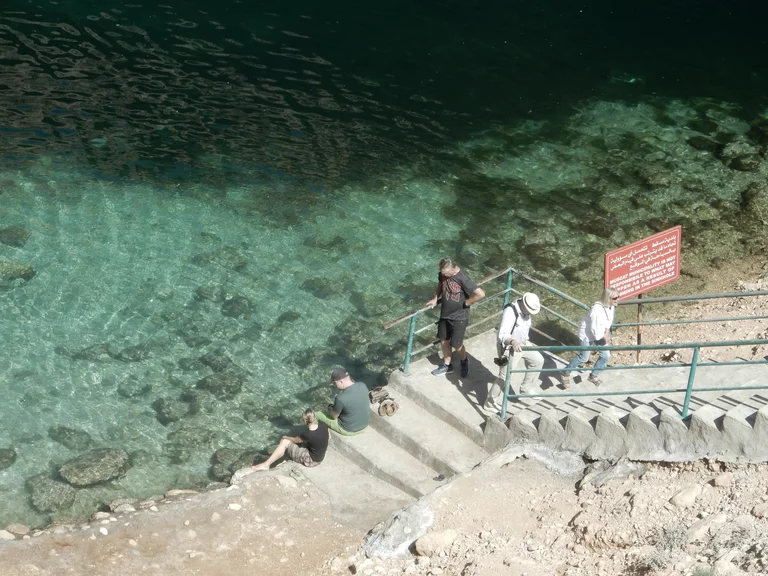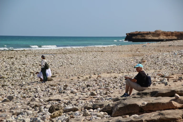 In Realität lässt sich das Naturspektakel einfach erklären: Der nahe gelegene Golf von Oman hat die Küstenregion unterspült und dabei unterirdische Höhlen in dem nachgiebigen Sandgestein gebildet. Nach einiger Zeit kollabierte die Oberfläche und brachte dabei eine kristallklare Badebucht zum Vorschein. Nichtsdestotrotz wird das wundersame Loch der Legende nach immer noch „Hawiyat Najm“ - übersetzt „Sternschnuppe“ - genannt. Eine Betontreppe führt die Besucher 20 Meter hinab zur Wasseroberfläche, wo es ihnen gestattet ist umsonst zu Baden, Schnorcheln und Tauchen. Das mussten wir uns aus Zeitgründen allerdings verkneifen und nach der schönen Wanderung vorher hatte auch keiner so richtig Lust dazu. Zudem stand noch ein kleiner Abstecher an den naheliegenden Kieselstrand auf der Liste.
