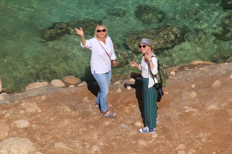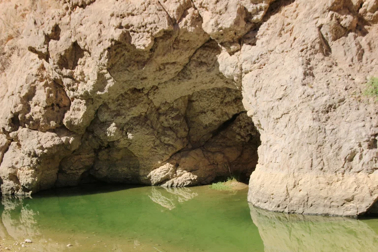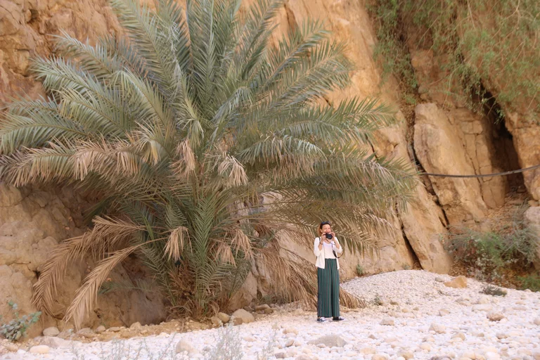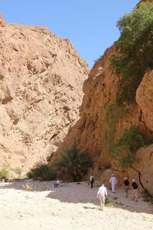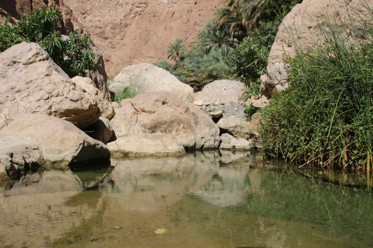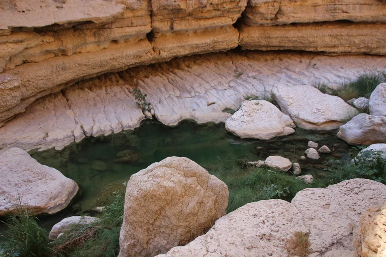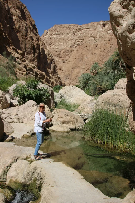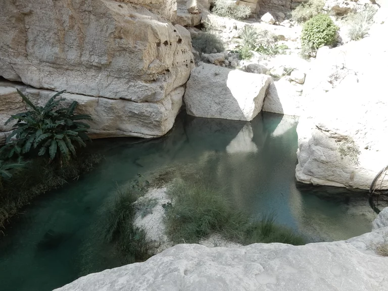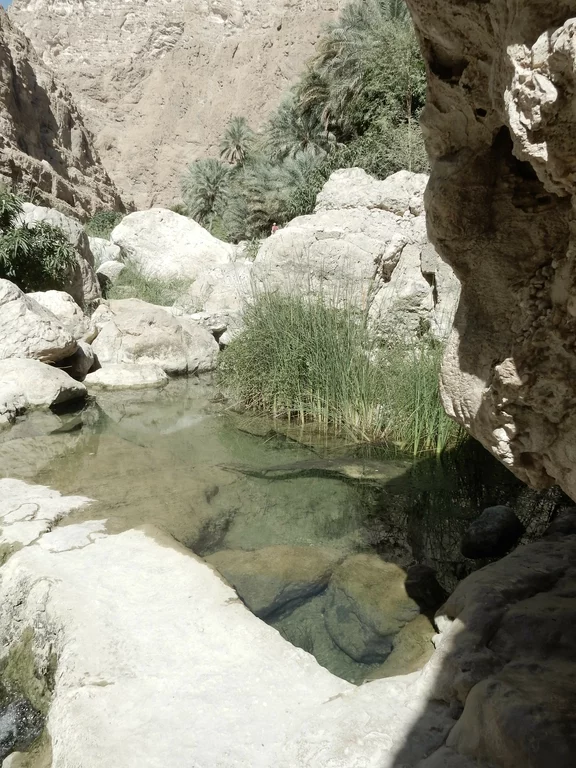 Nach einer etwa 20minütigen Wanderung durch lauschige Gärten und üppige Vegetation erreicht man schon den spektakulärsten Teil des Wadis. Inmitten von steil aufragenden, schneeweißen Klippen, die mit Spalten und Höhlen versehen sind, plätschert ein Bachlauf der immer wieder kleine türkisfarbene Pools bildet. Ein wunderschönes und friedvolles Fleckchen Erde.
