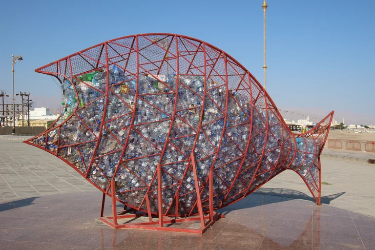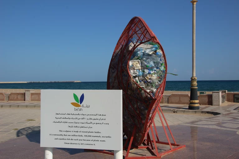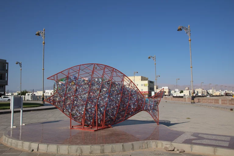 Wir sind auf dem Weg zurück nach Muscat. Am Ende der Uferpromenade sahen wir diese Skulptur, ein Mahnmal gegen den Gebrauch von Plastik.