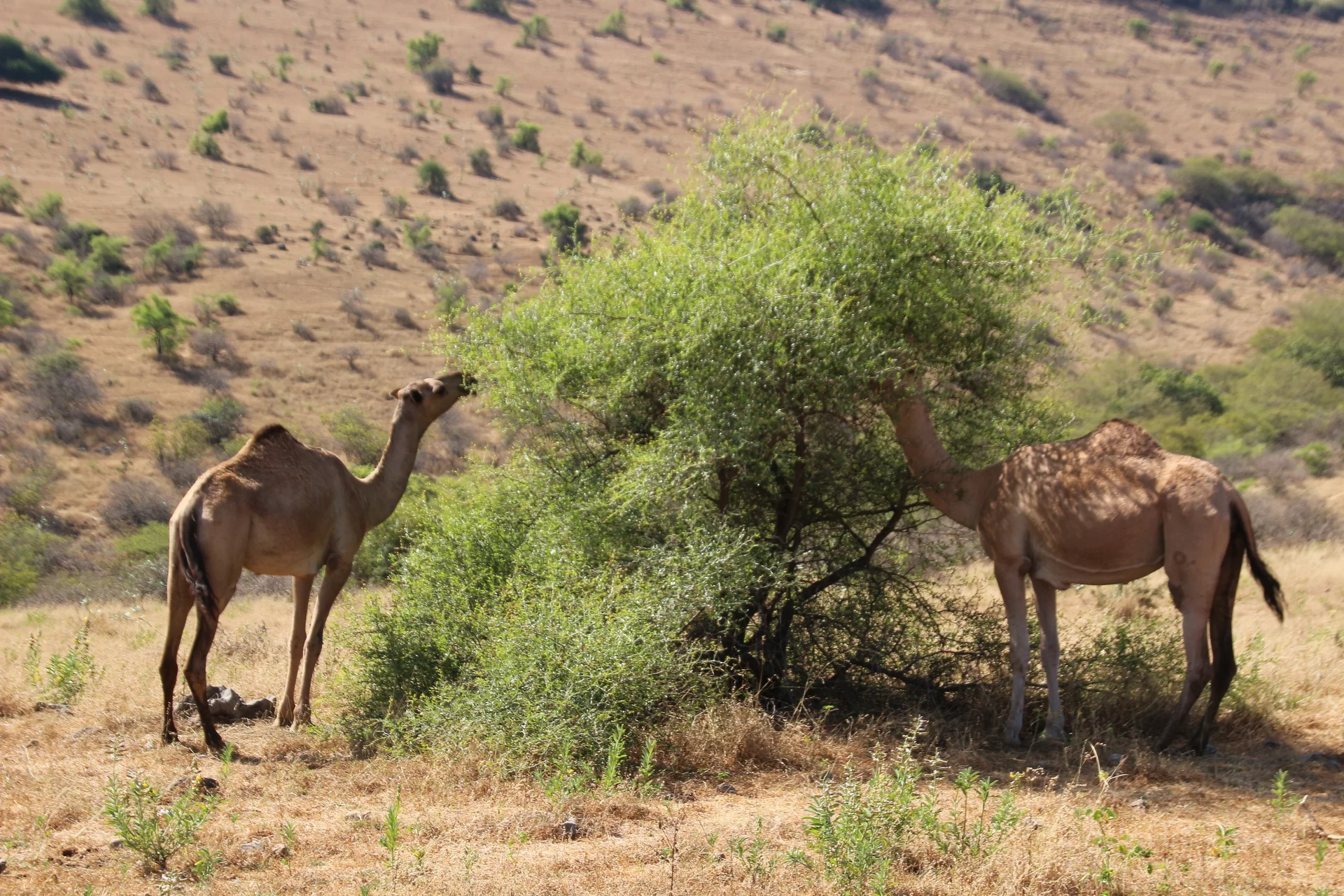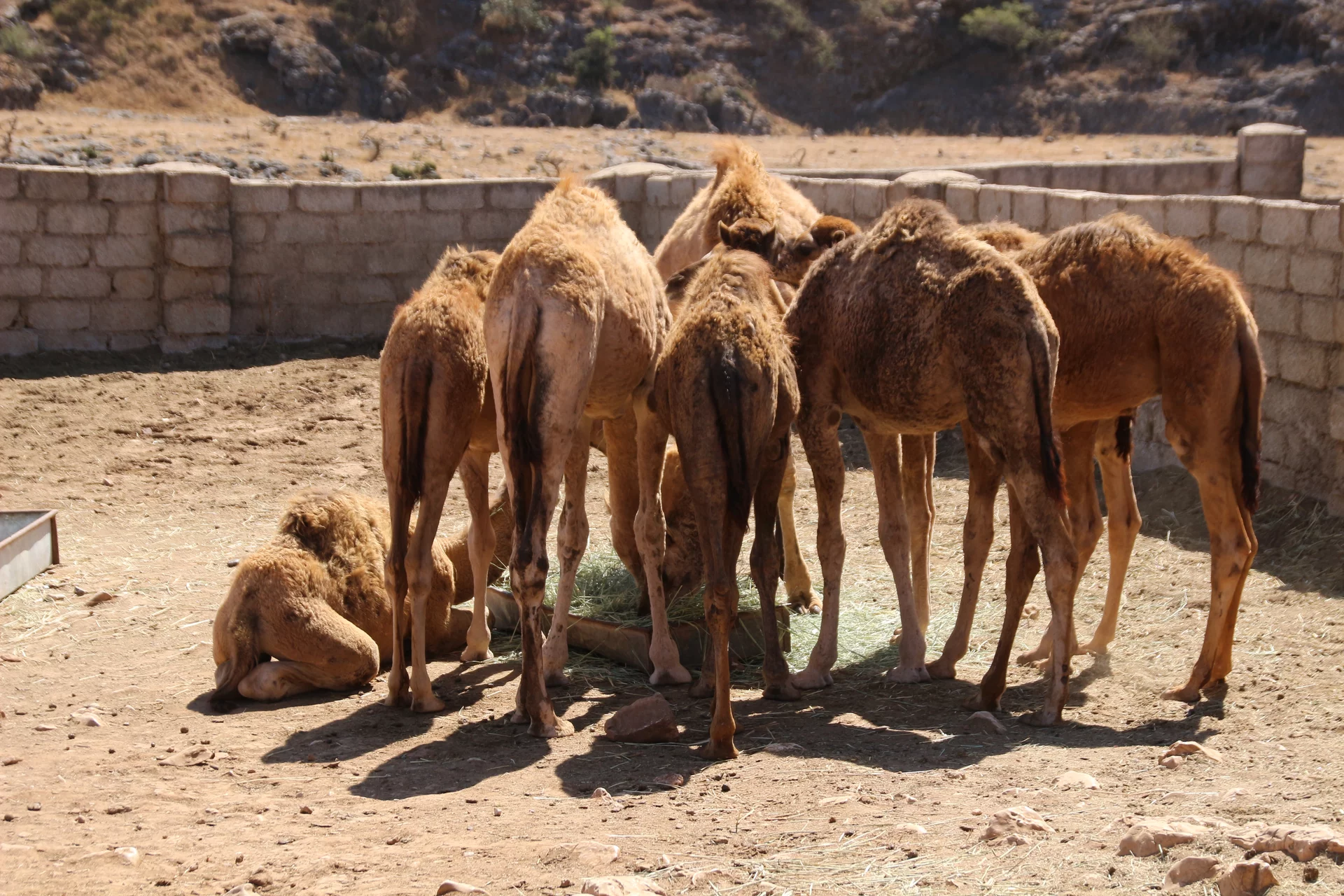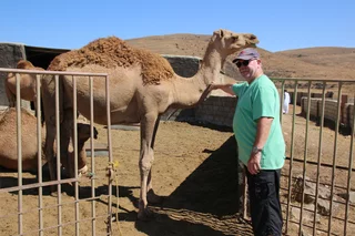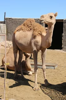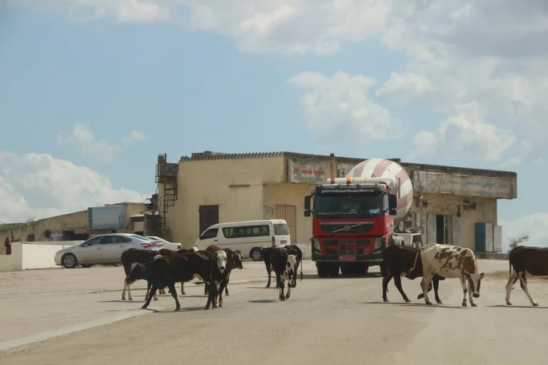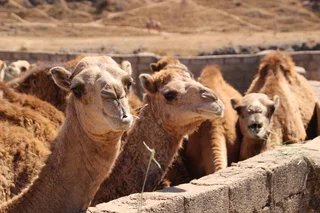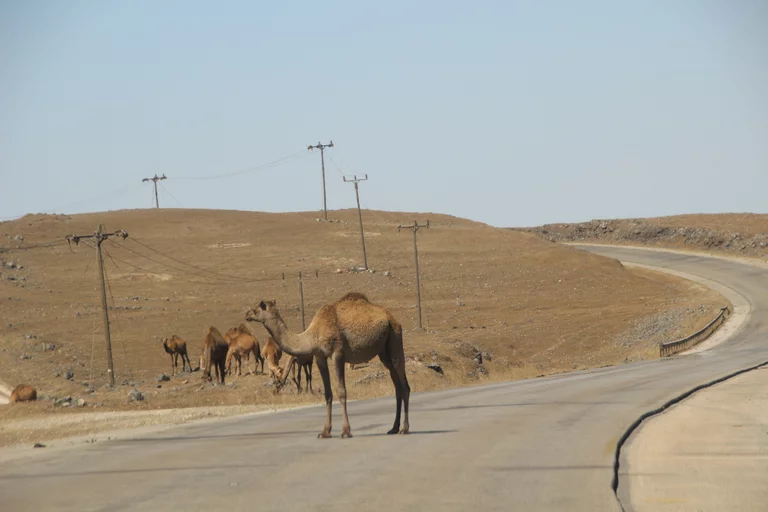 Mussallem Hassan, unser Reiseleiter wie er sich selber nennt, hatte aber ein wenig am geplanten Programm "gedreht" und brachte uns anstelle eines Dorfes der Jebalis zur Kamel- und Ziegenfarm seines Onkels. In seinem großen Toyota-Geländewagen ging es auf schmaler werdenden Straßen durch mehr oder weniger idyllische Dörfer aufwärts in das Qara-Gebirge. Die Straßen muß man sich allerdings mit frei laufenden Dromedaren teilen, von denen es in der Gegend mit über 150.000 fast soviel gibt wie Einwohner. Kein Wunder, dass sie oft die Straße blockieren und wir immer wieder um bedächtig malmende Kiefer Slalom fahren mussten. Und weil auch jede Menge Kühe unterwegs sind, führt das gelegentlich zu tierischen Staus.
