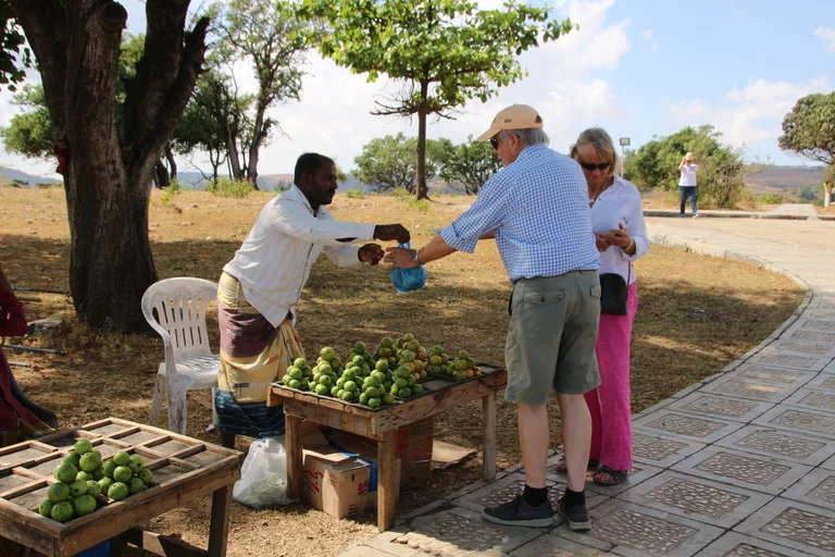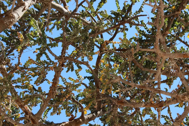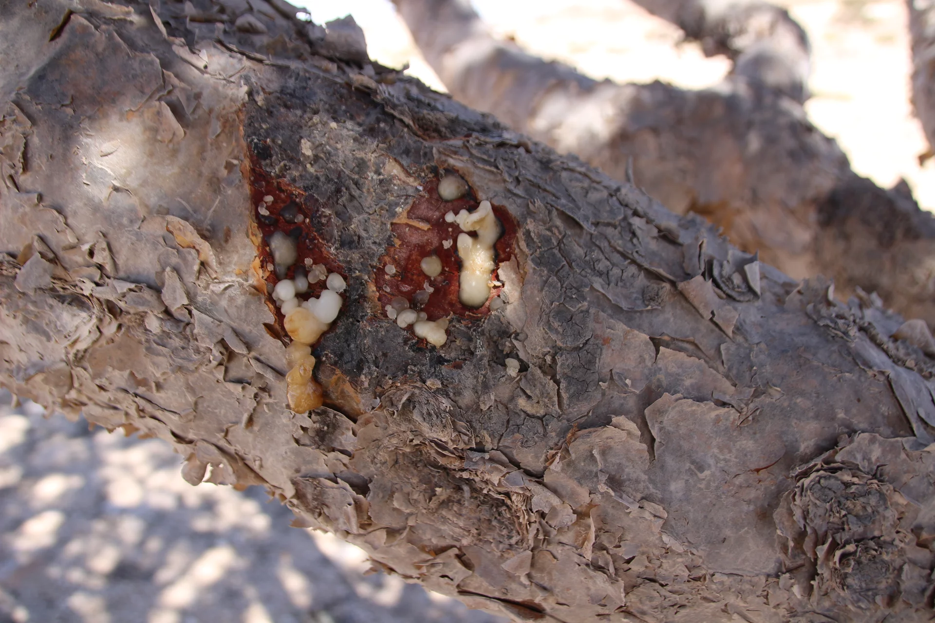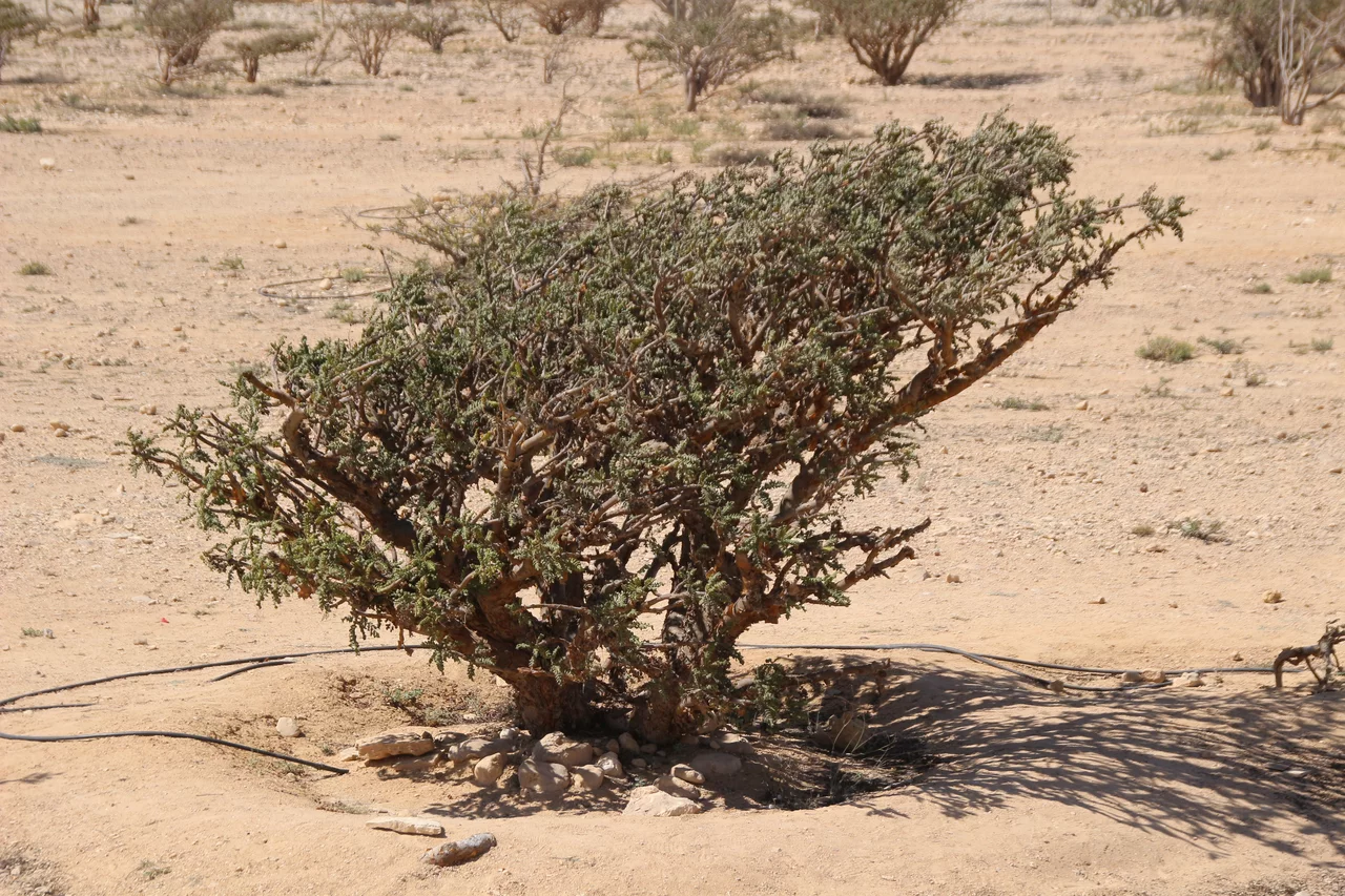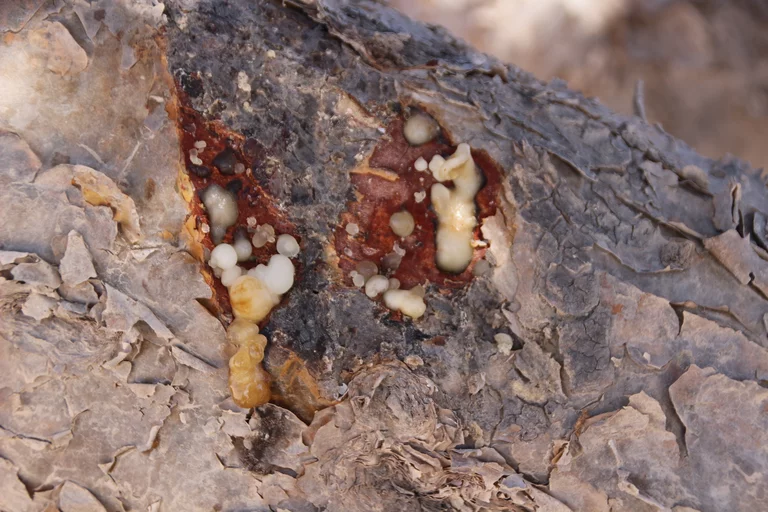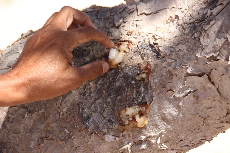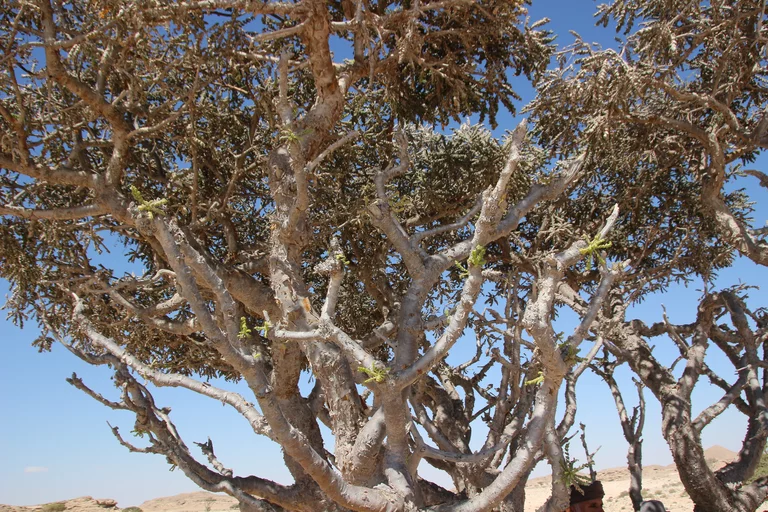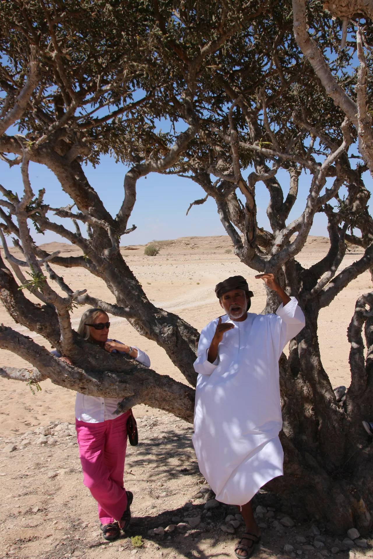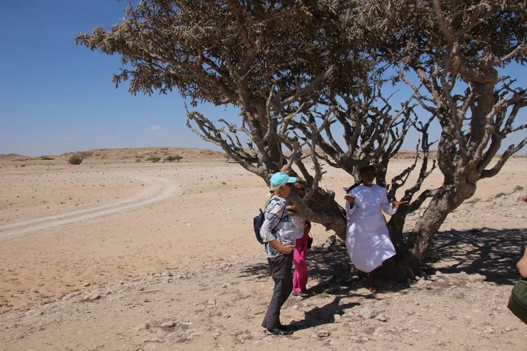 Als nächstes konnten wir etwas über Weihrauch und dessen Gewinnung lernen. Weihrauch ist in der Region Dhofar im Süden des Oman ein wesentlicher Wirtschaftsfaktor. „Der beste Weihrauch der Welt kommt hier aus der Region um Salalah seit mehr als 5.000 Jahren“, erzählt Mussallem auf der etwas abenteuerlichen Fahrt querfeldein zu den Weihrauchbäumen im Wadi Dawkah. „Zweimal im Jahr wird geerntet“, erklärt er. Dafür werden die Stämme und Äste des Weihrauchbaumes angeritzt – in den Wochen danach sammelt sich an der Schnittstelle das Harz. Die ersten beiden “Anschnitte” der Bäume befördern in der Regel minderwertigen Harz zum Vorschein. Erst die Qualität des dritten Cuts genügt den Ansprüchen für den Verkauf. Nach der Ernte wird der Harz auf Tüchern ausgebreitet und in der Sonne getrocknet. Je heller er ist, desto besser seine Qualität und entsprechend höher der Preis.