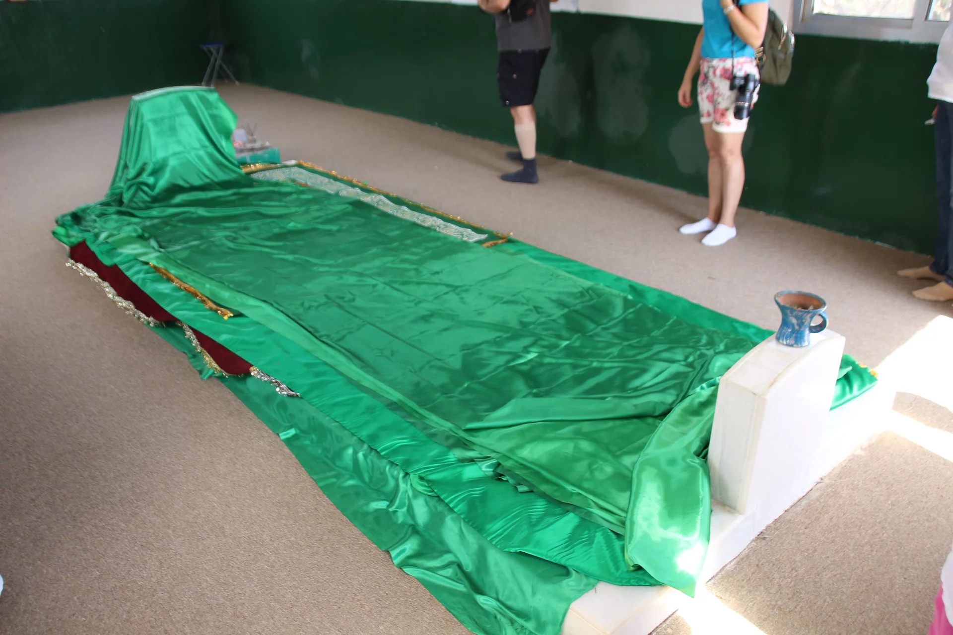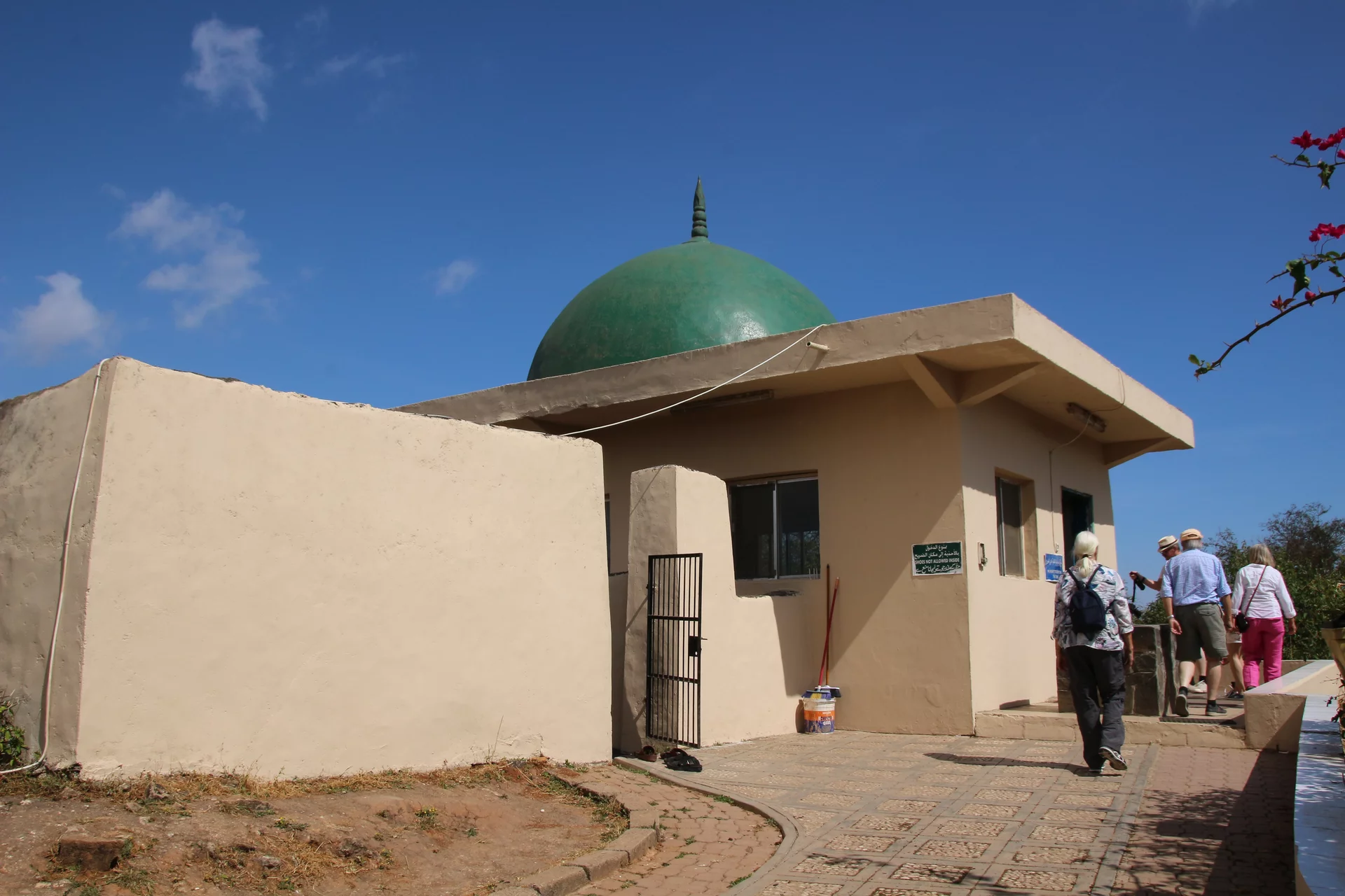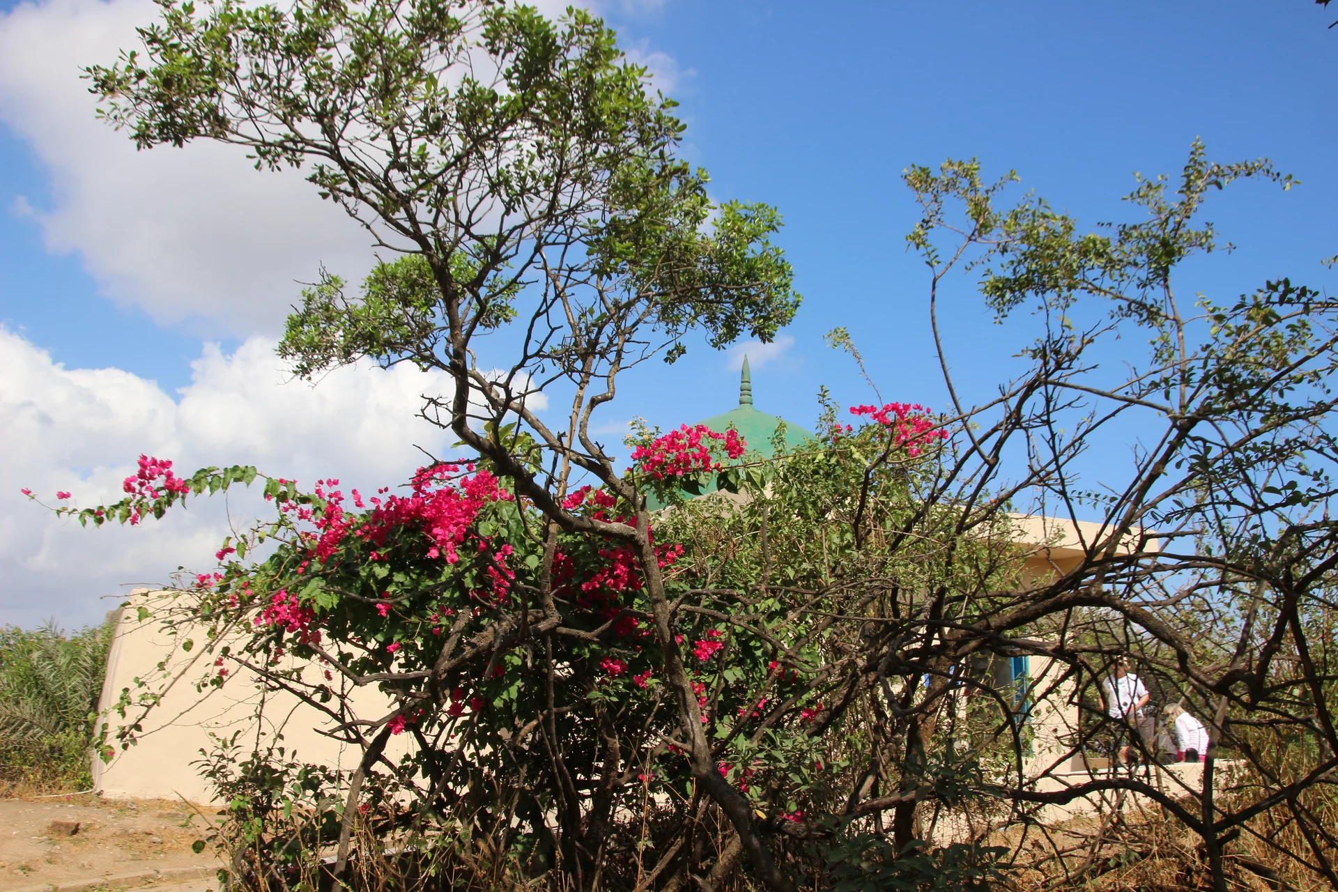 Unser Weg führte uns dann aus der Wüste wieder in grünere Gefilde. Das nächstes Ziel war das Mausoleum von Nabi Ayoub, wie er im Koran genannt wird. In der Bibel ist er als Hiob bekannt. Grüne Mangobäume, Akazien und Oleander umgeben die kleine Moschee, welche dringend einen neuen Anstrich benötigt. Immerhin ist das Grab eine bedeutende Pilgerstätte für Muslime und Christen gleichermaßen. Gemessen an der religiösen Bedeutung wirkt das Mausoleum fast ein wenig ärmlich.