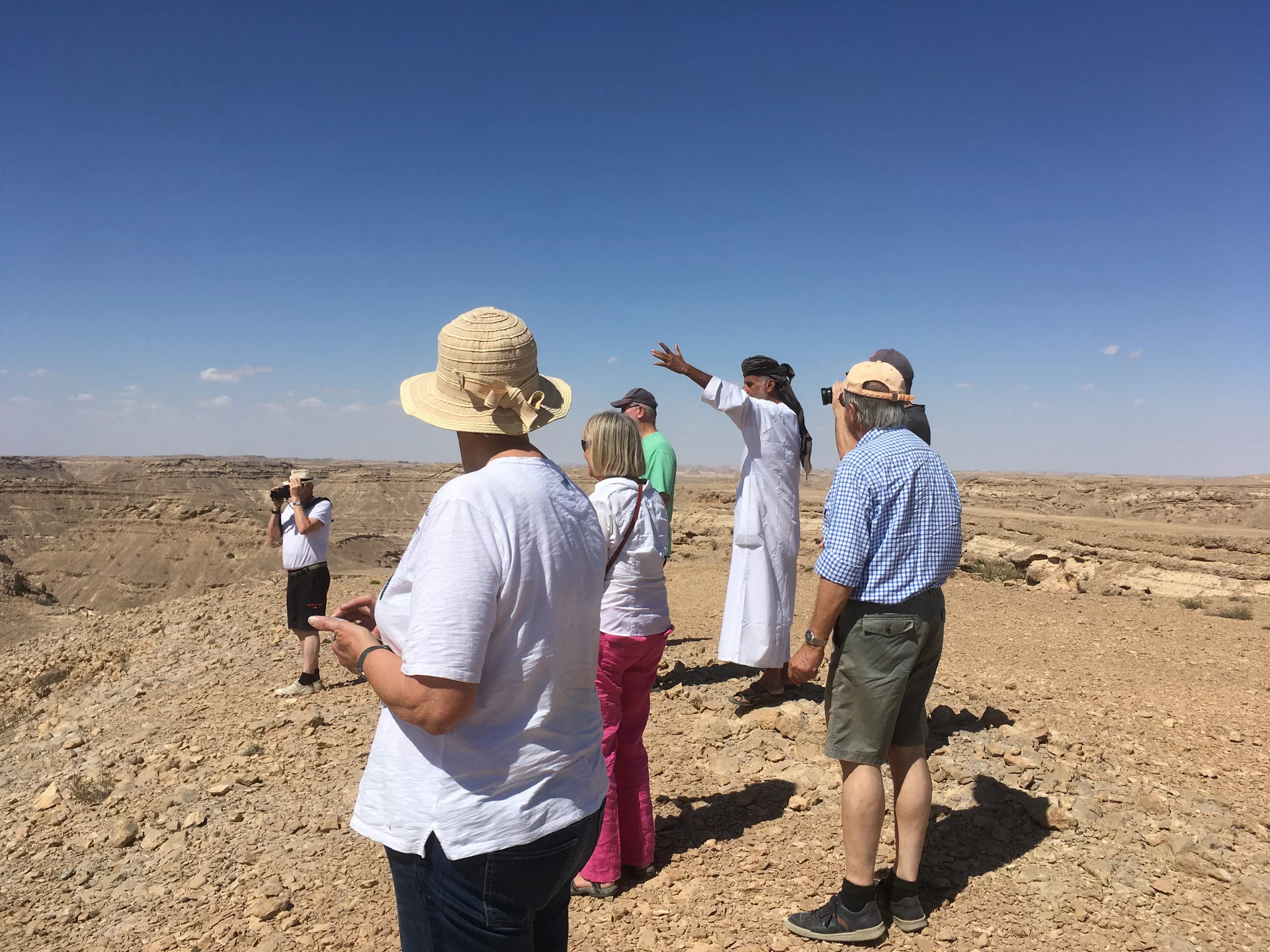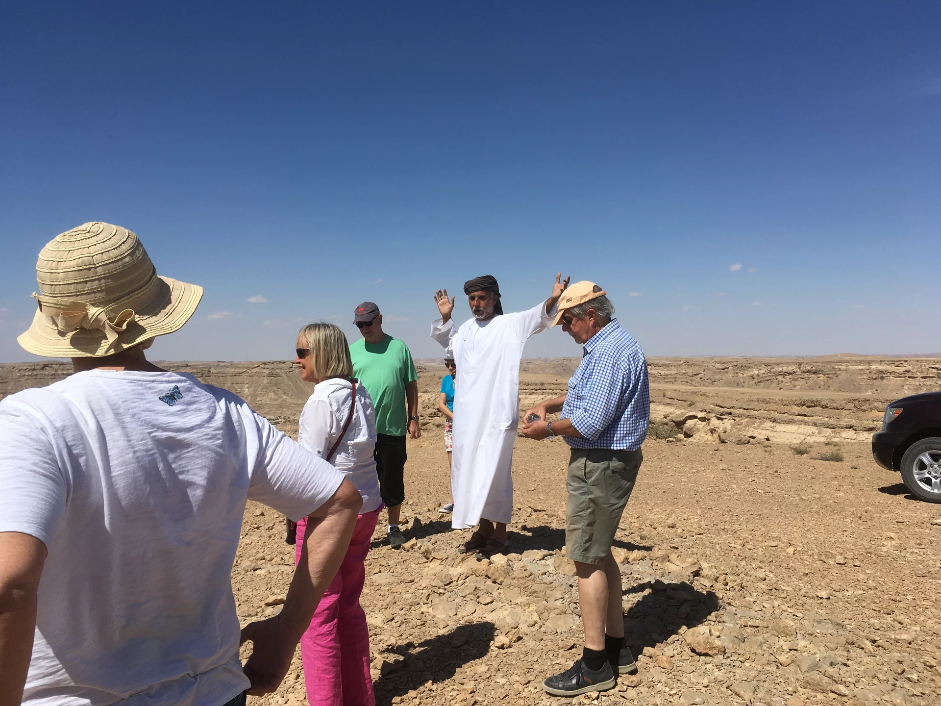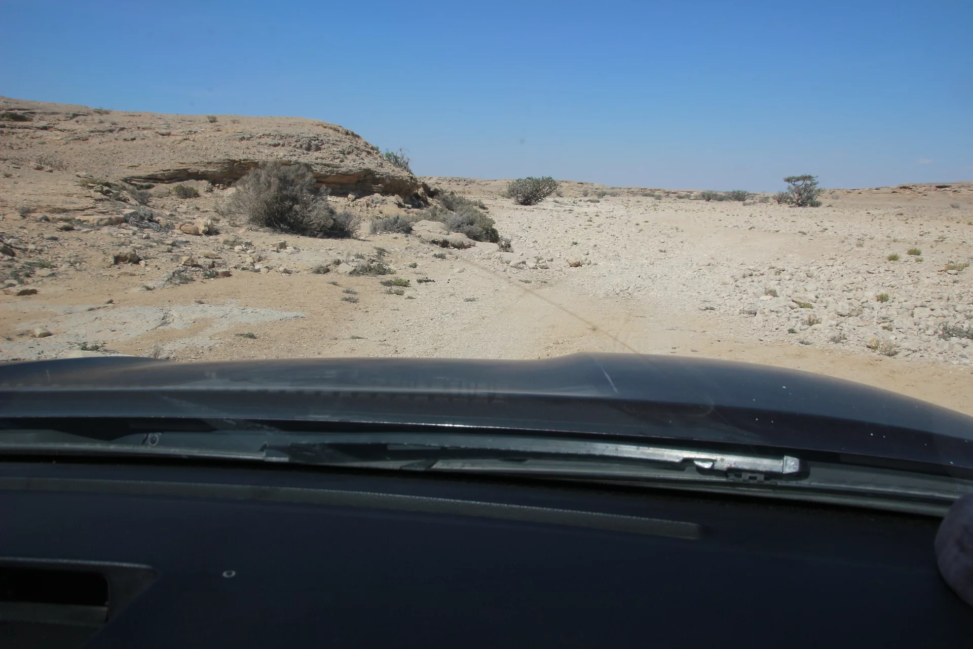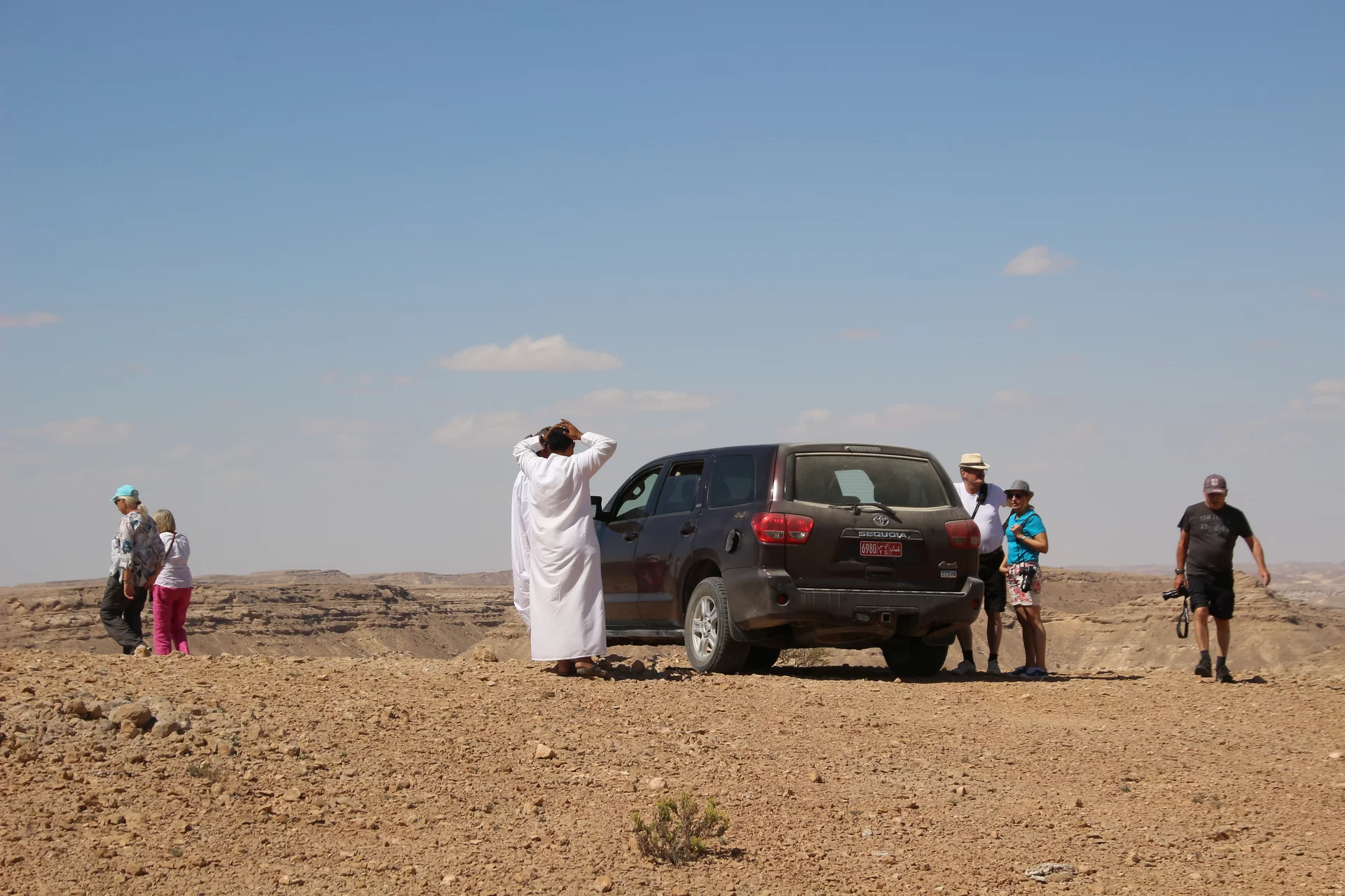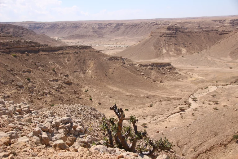 Nach dem "Weihrauchunterricht" führte die Tour weiter in die Steinwüste von Haluf und das Wadi Ayoun. Ein ziemlich wilder Geländeritt über allenfalls angedeutete Wege. Doch Mussallem kennt hier offensichtlich jeden Stein und steuert den Toyota mit traumwandlerischer Sicherheit zum nächsten Aussichtspunkt. Der Blick wandert über eine ziemlich trockene und unwirtliche Gegend und es fällt mit schwer zu glauben, dass es hier während des Monsuns im Sommer auch grüne Flecken Erde geben soll. Und wie zur Bestätigung dessen findet sich in all dem Geröll ein zartes Pflänzchen. Hier und da sieht man in den Schluchten den einen oder anderen Busch. Die Sonne brennt vom Himmel und die 30° sind locker überschritten.