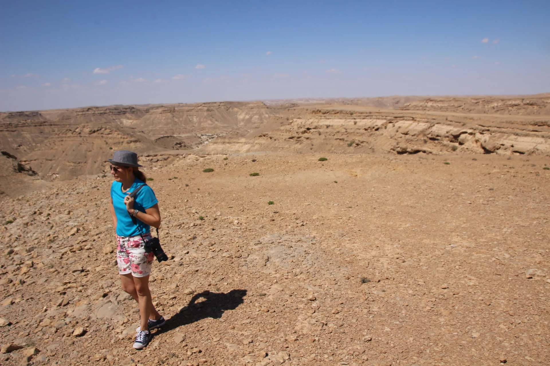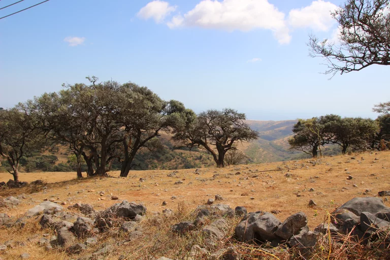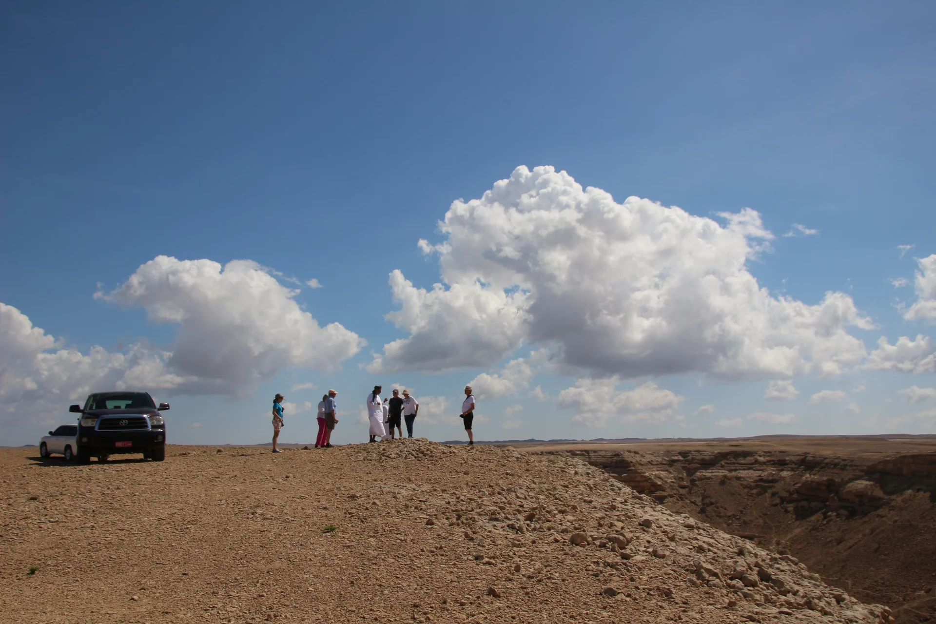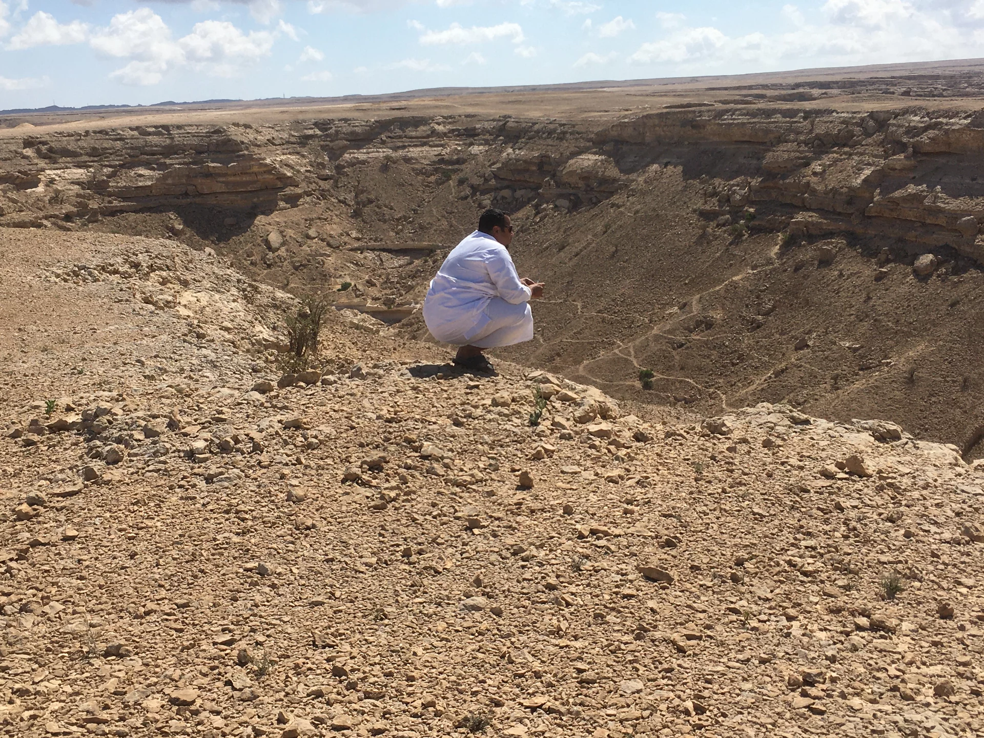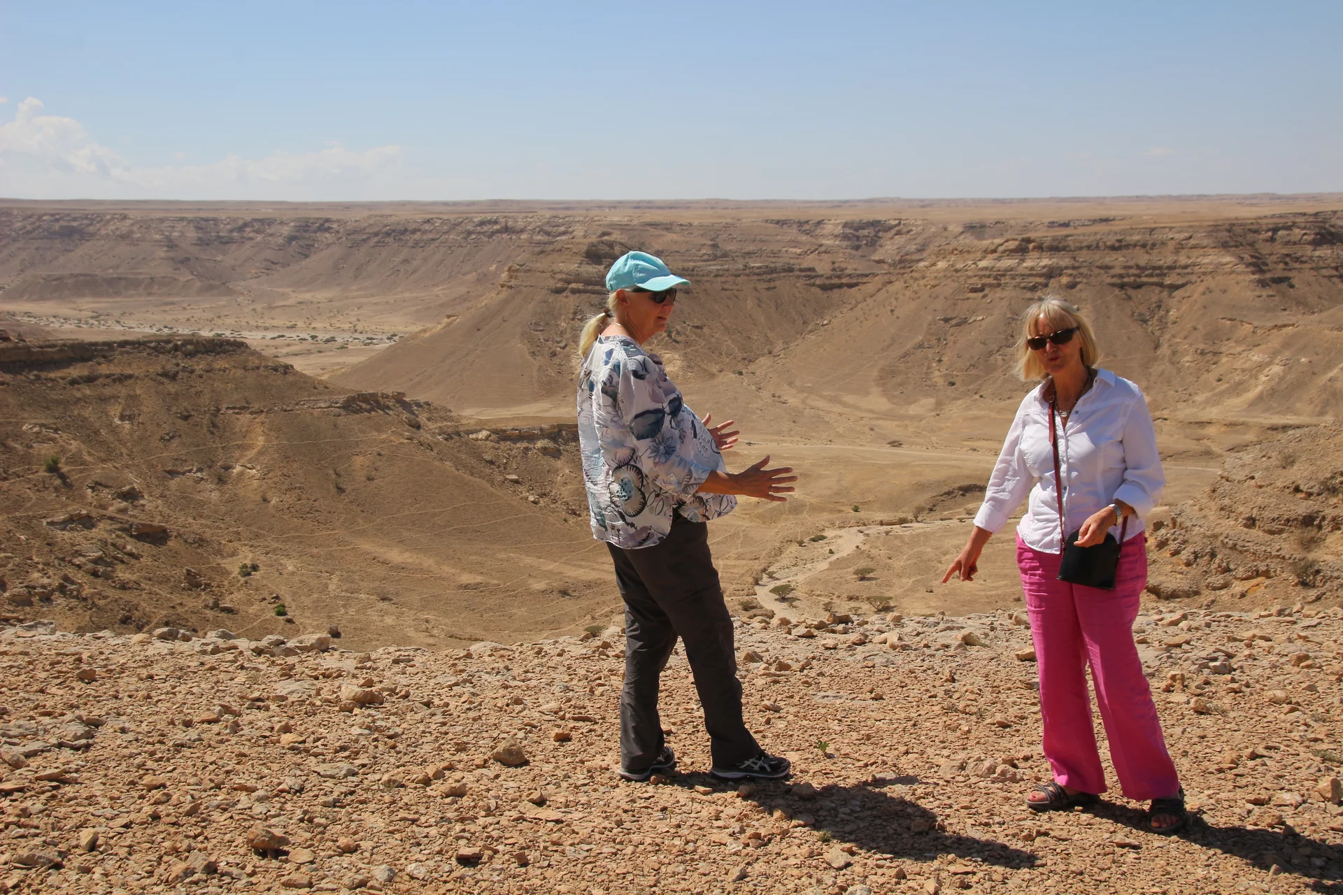 Nach dem "Weihrauchunterricht" führte die Tour weiter in die Steinwüste von Haluf und das Wadi Ayoun. Ein ziemlich wilder Geländeritt über allenfalls angedeutete Wege. Doch Mussallem kennt hier offensichtlich jeden Stein und steuert den Toyota mit traumwandlerischer Sicherheit zum nächsten Aussichtspunkt. Der Blick wandert über eine ziemlich trockene und unwirtliche Gegend und es fällt mit schwer zu glauben, dass es hier während des Monsuns im Sommer auch grüne Flecken Erde geben soll. Und wie zur Bestätigung dessen findet sich in all dem Geröll ein zartes Pflänzchen. Hier und da sieht man in den Schluchten den einen oder anderen Busch. Die Sonne brennt vom Himmel und die 30° sind locker überschritten.
