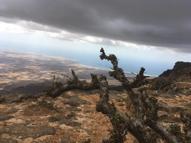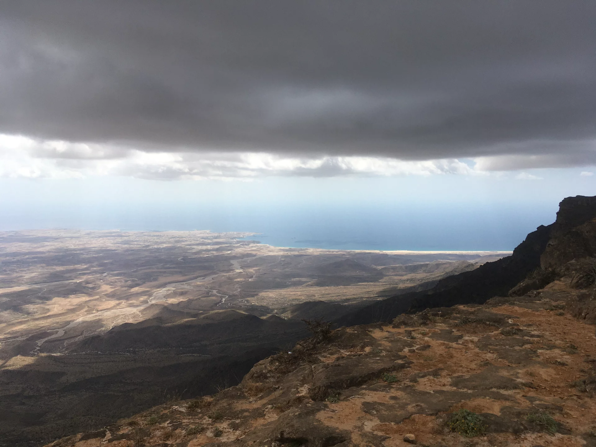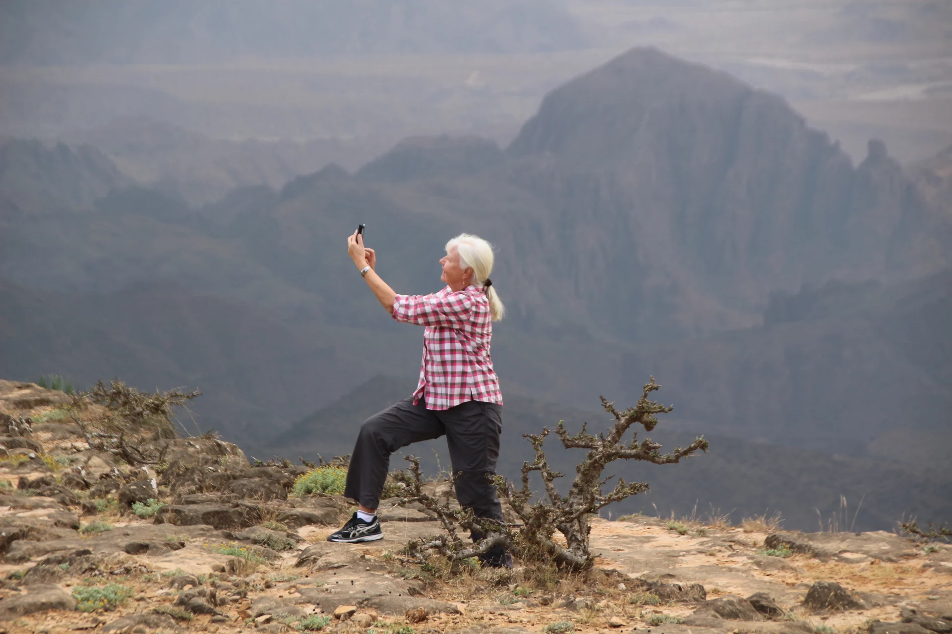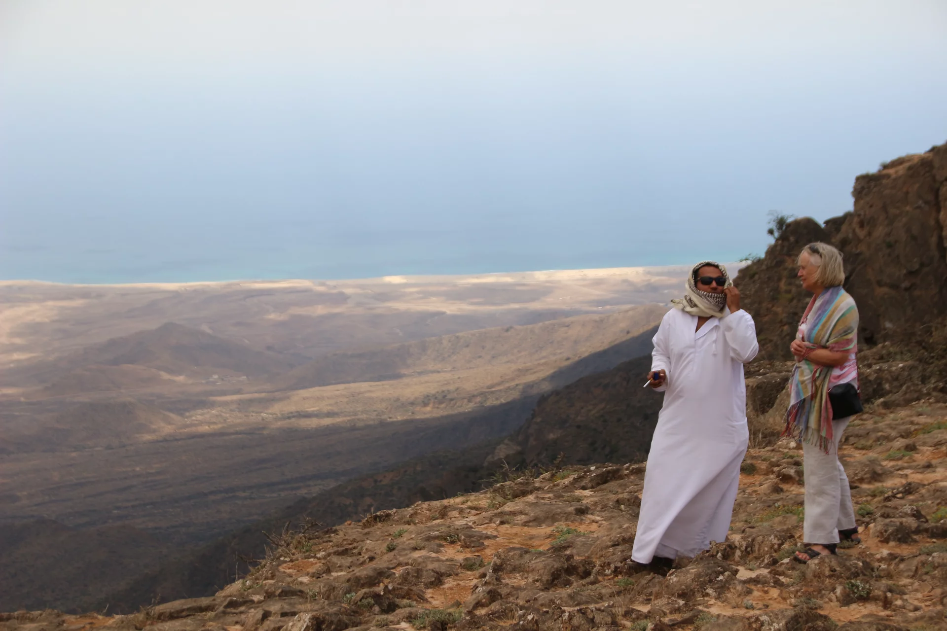 Oben angekommen gab es dann grandiose Aussichten über das Dhofar Gebiet bis hinunter zur Küste. Es war ziemlich kühl dort oben und es pfiff ein kühler Wind über das Platteau. An der Abrisskante ging es gut 900m steil nach unten und selbst mit einigem abstand war mir doch ziemlich mulmig. Aber was tut man nicht alles für ein schönes Foto? Richtig in die Hose ist mir das Herz allerdings gerutscht, als ich Lottchen beim Selfie machen gesehen habe.