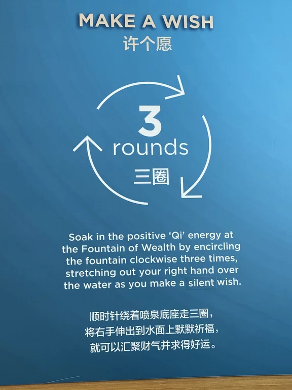 Dort gibt es auch die "Fountain of Wealth" (Fontäne des Wohlstands/Reichtums). Man sagt: Dreimal im Uhrzeigersinn umrunden, die rechten Hand ins Wasser halten und sich dabei etwas wünschen. Der Wunsch muß natürlich geheim bleiben.