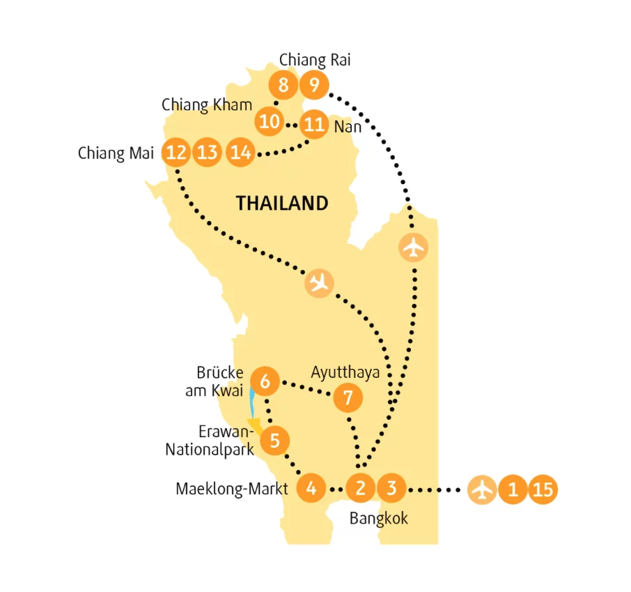 Am 01.03.2025 geht es zusammen mit unseren Freunden Birgit und Hartmut aus Schwerin (die beiden hatten die Idee zu dieser Reise) von Hamburg via München nach Bangkok. Die Zahlen auf der Karte unten bezeichnen das Ziel an den jeweiligen Tagen innerhalb Thailands.