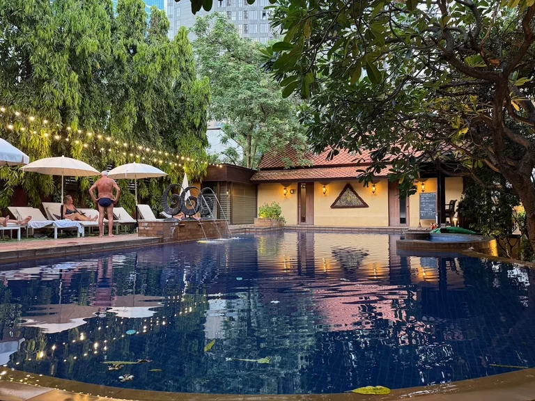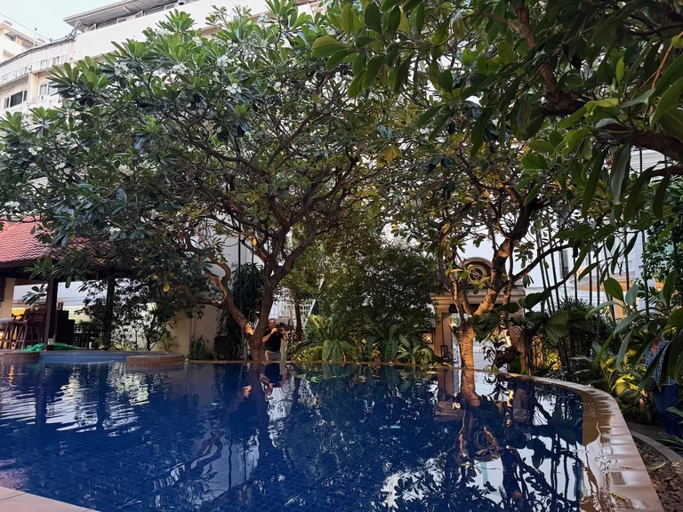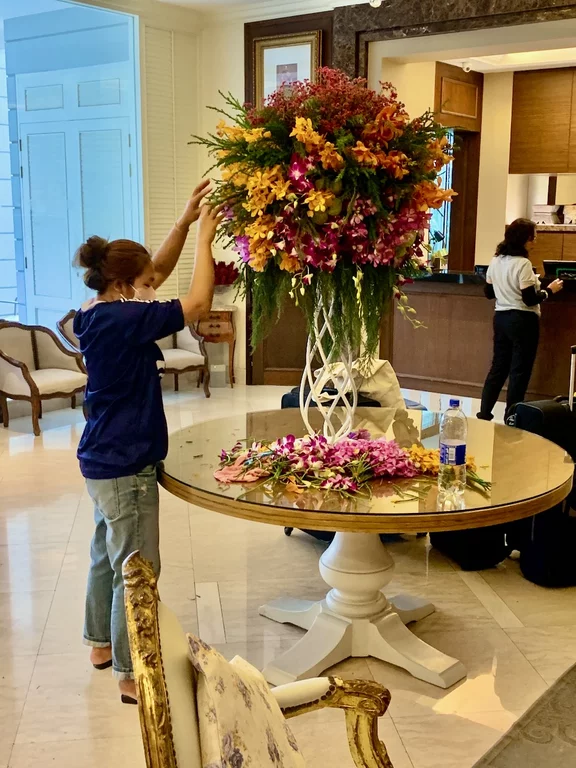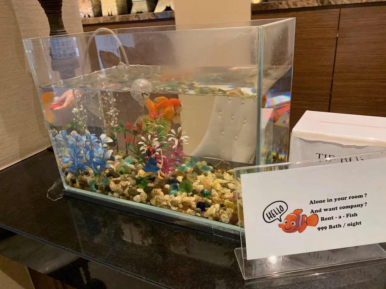 Die Fahrt zum Hotel dauerte fast eine Stunde. Das "Rose Residence" liegt in einem ruhigen Bereich der Altstadt und machte einen sehr guten Eindruck. Die Lobby ist relativ klein aber sehr schön und wurde gerade mit frischen Blumen neu dekoriert. Es wird in diesem Hotel auch an die Alleinreisenden gedacht. Sollte man sich einsam fühlen, kann man sich als Gesellschaft einen Fisch mieten. Ein solches Angebot haben wir bisher auch noch nicht gesehen.