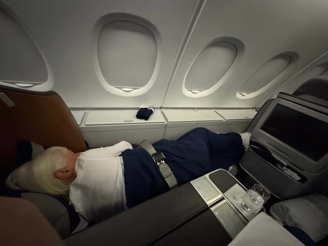 Kurze Zeit später waren wir dann endgültig auf dem Weg nach Bangkok. Inzwischen war es schon 23:30 Uhr. Nach einem Gläschen Begrüßungssekt hat sich Lottchen direkt in das Reich der Träume begeben.