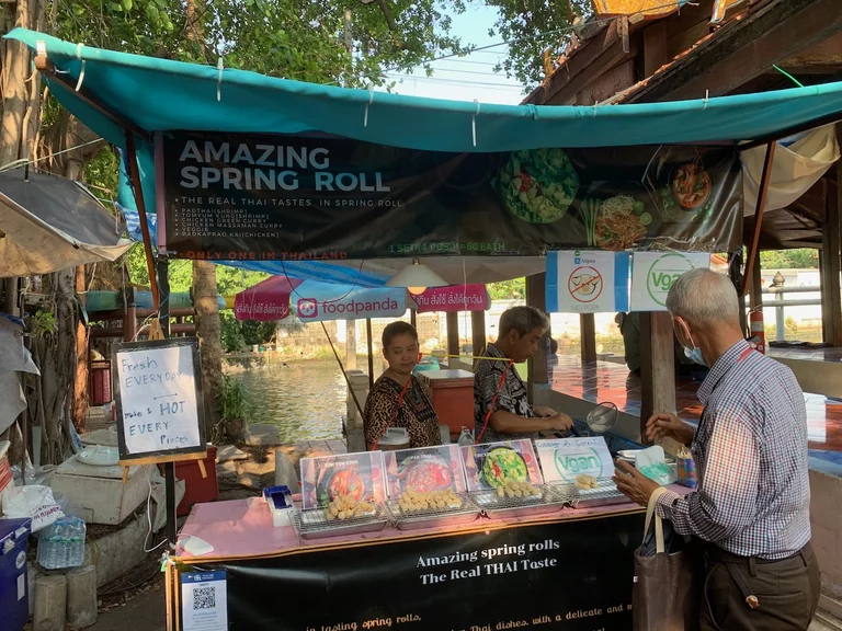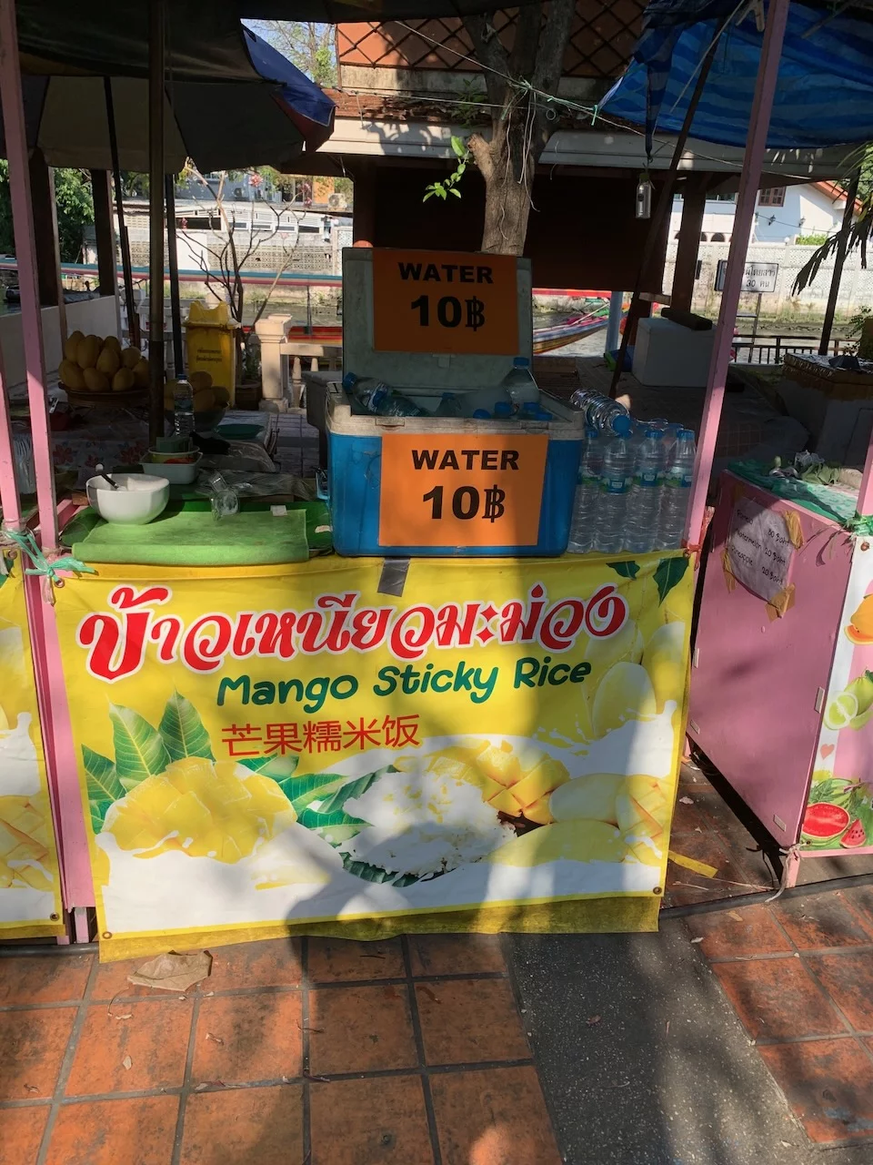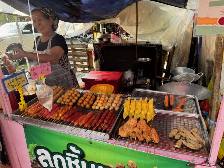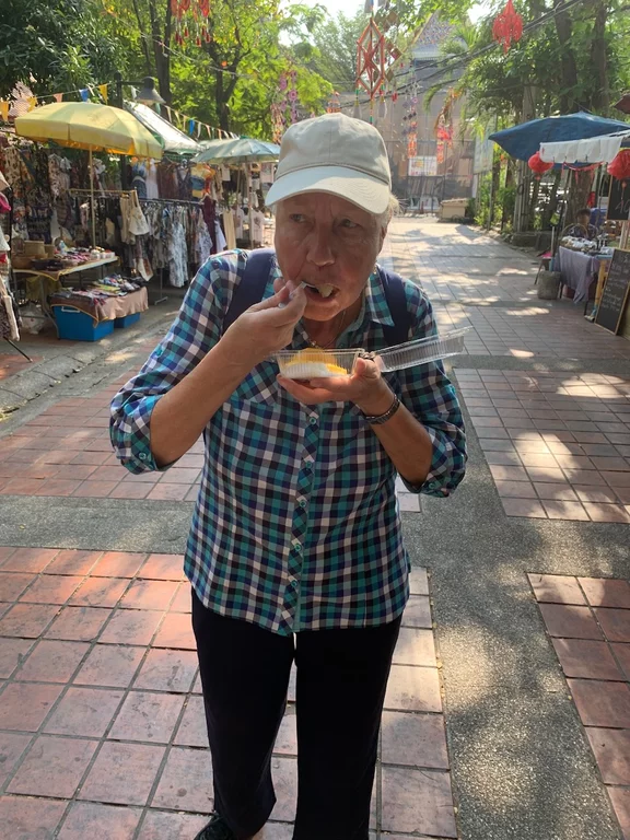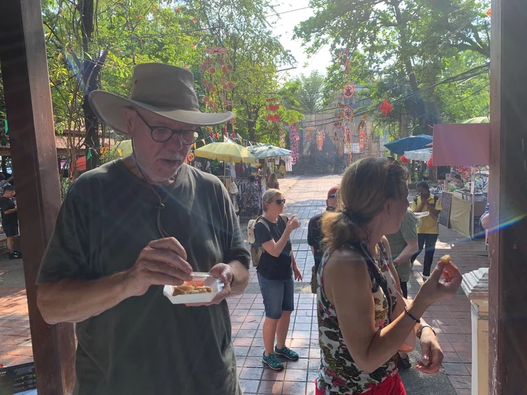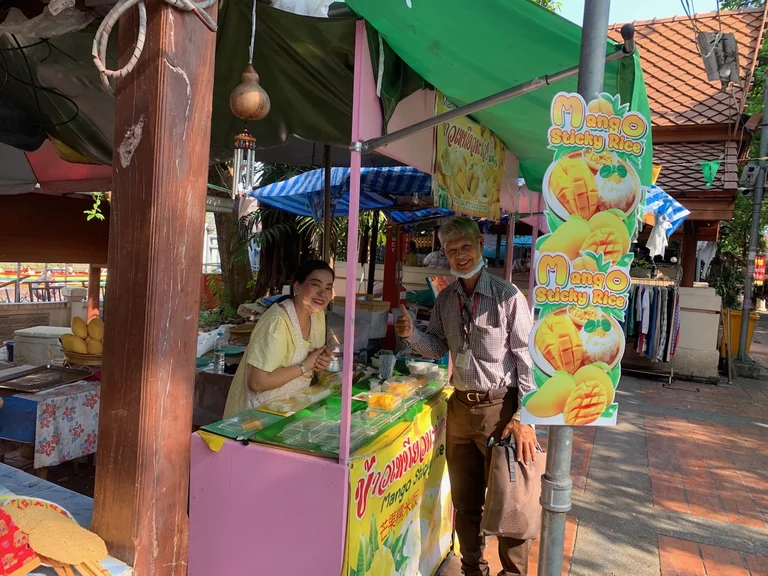 Herr Müller (er redet von sich immer in der 3. Person) führte uns weiter zu einem Stand, an dem es seiner Meinung nach die besten Thai-Frühlingsrollen gibt. Jeder bekam 4 Stück, 2 mit Fleisch, 2 mit Gemüse und sie sie waren wirklich saulecker. Als Dessert noch ganz frische Mango mit Sticky Rice (eine Art Klebereis), ebenfalls sehr sehr lecker. Woraus der Kleber besteht blieb allerdings ein Geheimnis. Es ist aber allen gut bekommen!!!