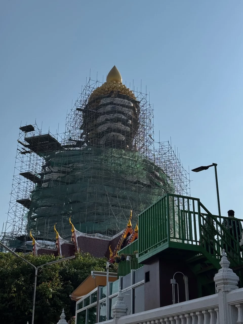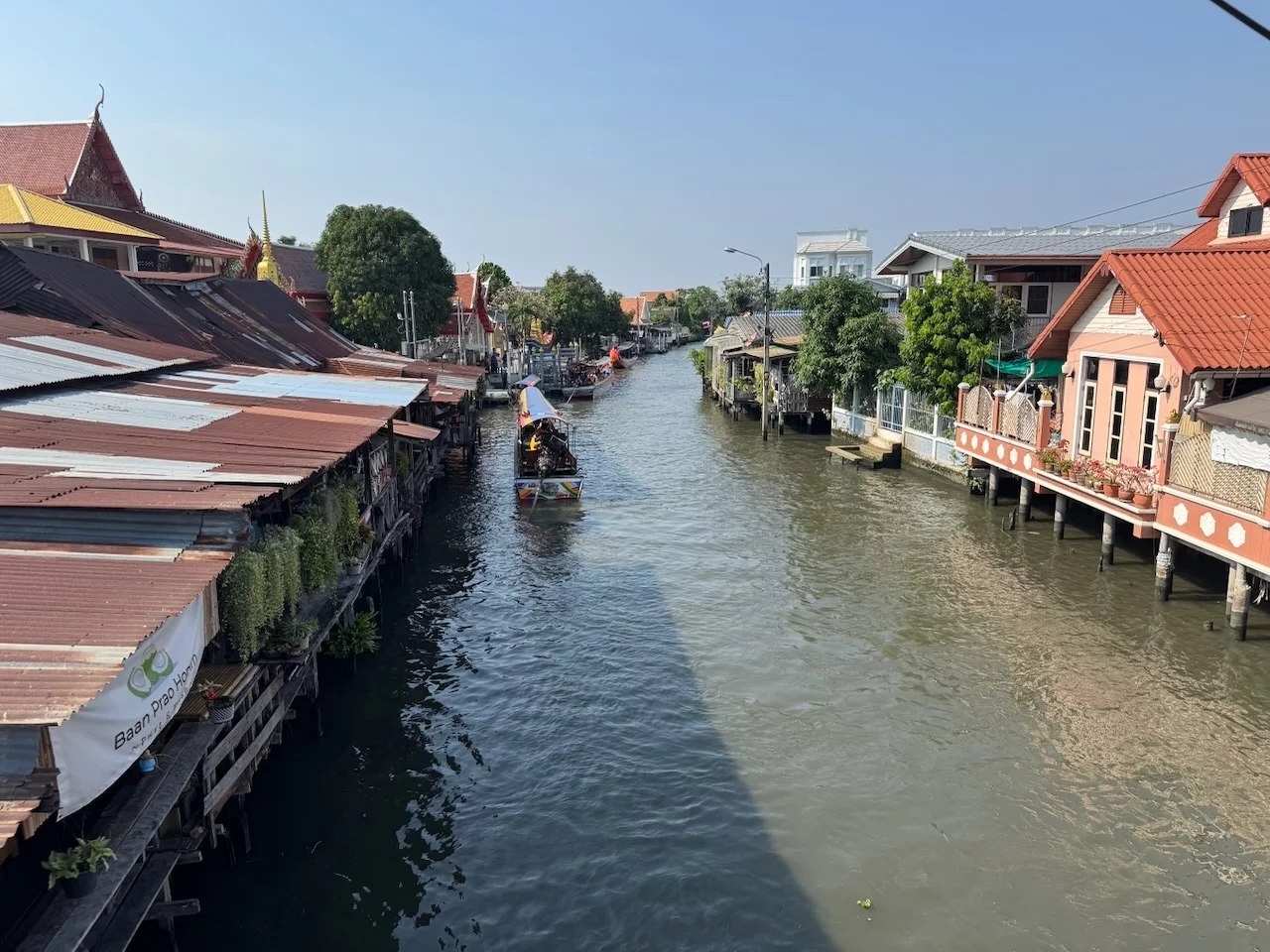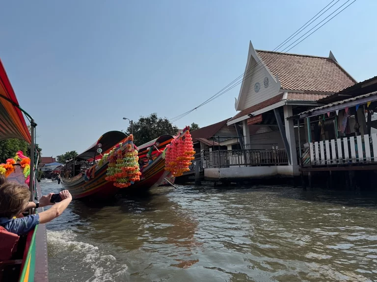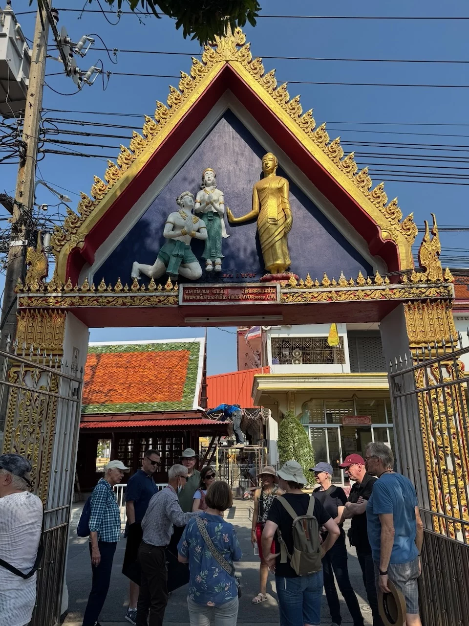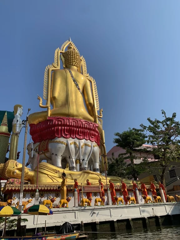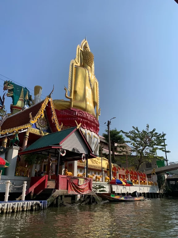 Dann ging es wieder in die Boote durch verschiedene Kanäle zu unserem nächsten Ziel, die Poomjai Gardens. Der Fahrt führte vorbei an einem goldenen Buddha der uns den Rücken zuwandte und einer weiteren Buddha-Statue, die komplett eingerüstet war.