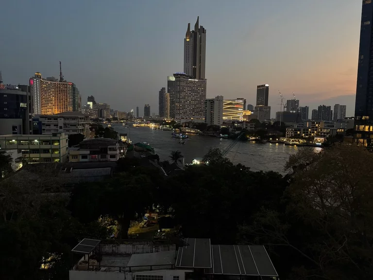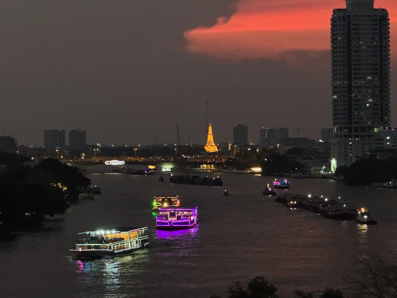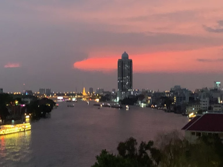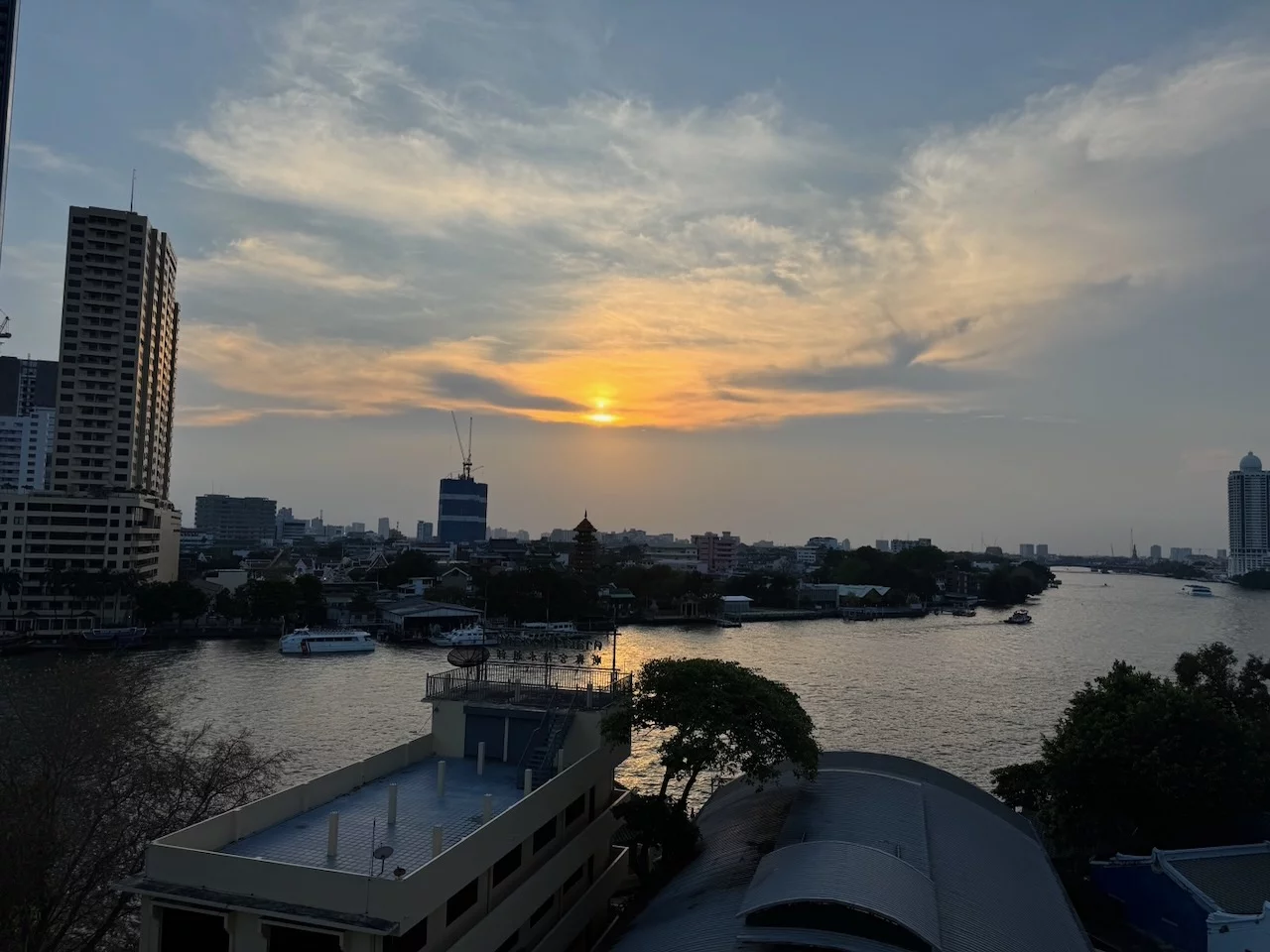 Zum Abendessen lud uns Herr Müller bzw. Chamäleon in eine ganz besondere Location ein. Das Restaurant & Bar »River Vibe« lockt mit einem atemberaubenden Ausblick auf den Fluss, den alten wie auch den neuen Teil von Bangkok. Von hier oben kann man den Sonnenuntergang, das Glitzern des Wassers und die Silhouette der "Stadt der Engel" richtig genießen, sagt man zumindest. Heute hat das mit dem glitzernden Wasser nicht so ganz geklappt, denn zum denkbar schlechtesten Zeitpunkt kamen Wolken auf.