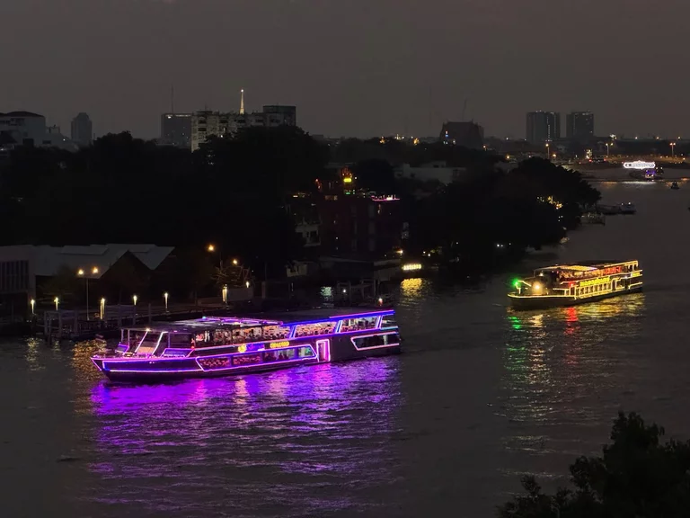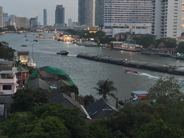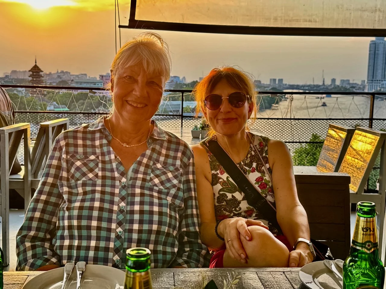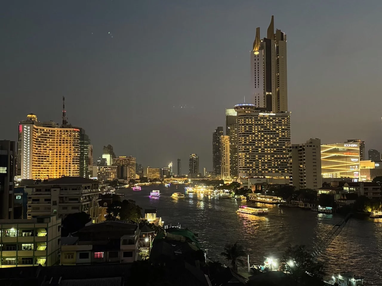 Zum Abendessen lud uns Herr Müller bzw. Chamäleon in eine ganz besondere Location ein. Das Restaurant & Bar »River Vibe« lockt mit einem atemberaubenden Ausblick auf den Fluss, den alten wie auch den neuen Teil von Bangkok. Von hier oben kann man den Sonnenuntergang, das Glitzern des Wassers und die Silhouette der "Stadt der Engel" richtig genießen, sagt man zumindest. Heute hat das mit dem glitzernden Wasser nicht so ganz geklappt, denn zum denkbar schlechtesten Zeitpunkt kamen Wolken auf.