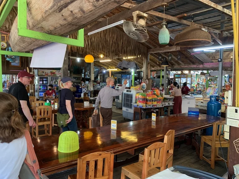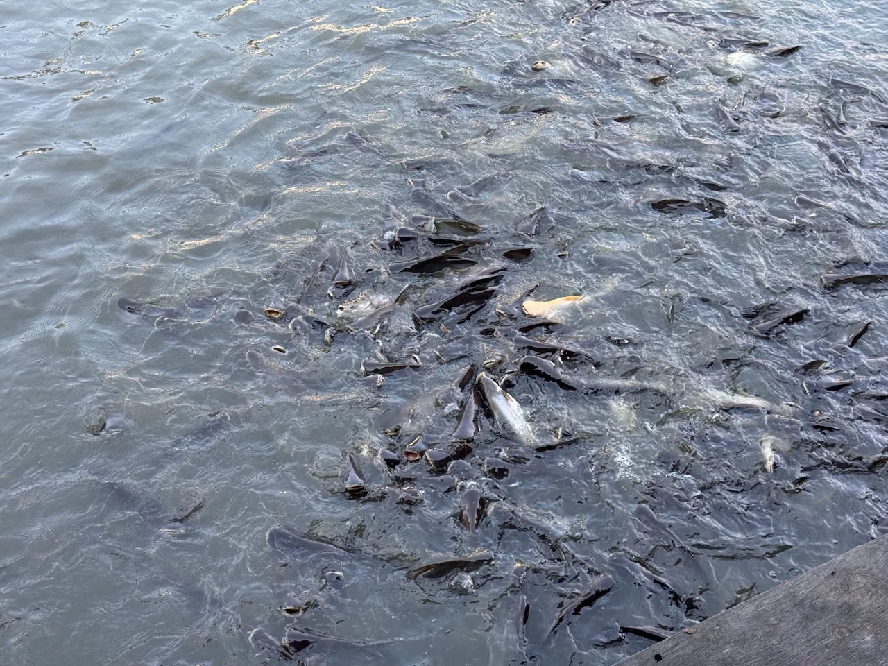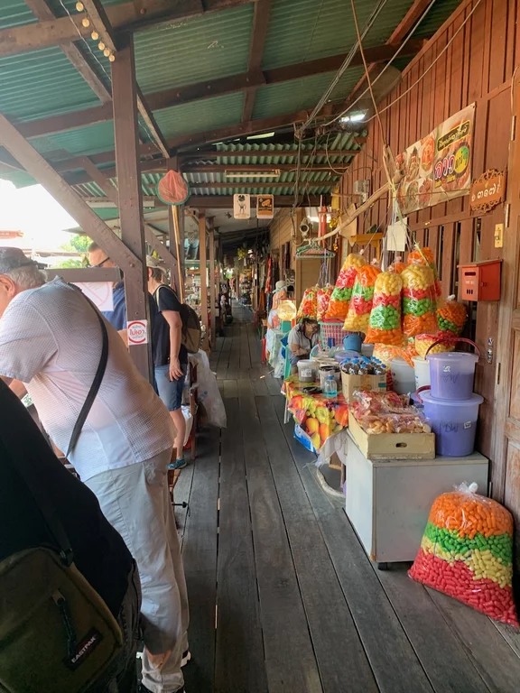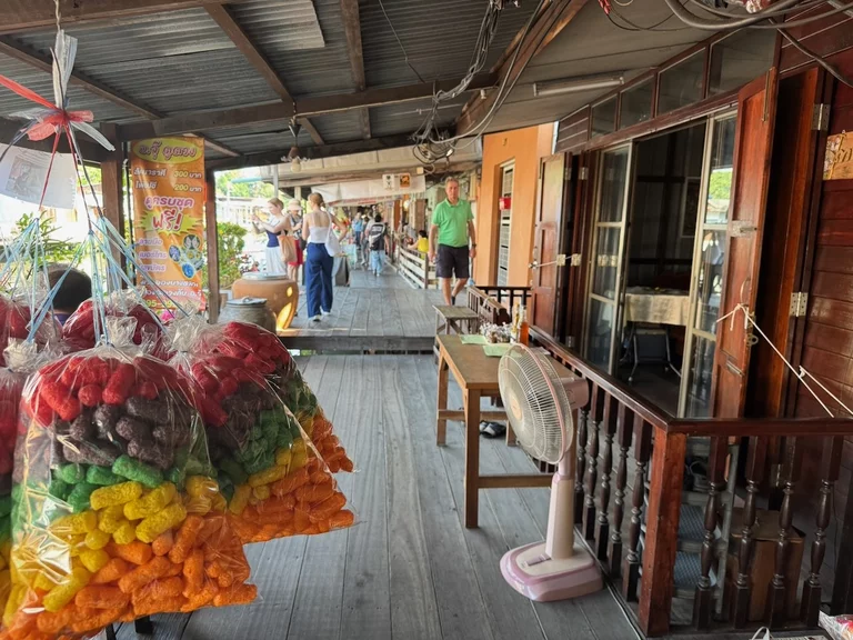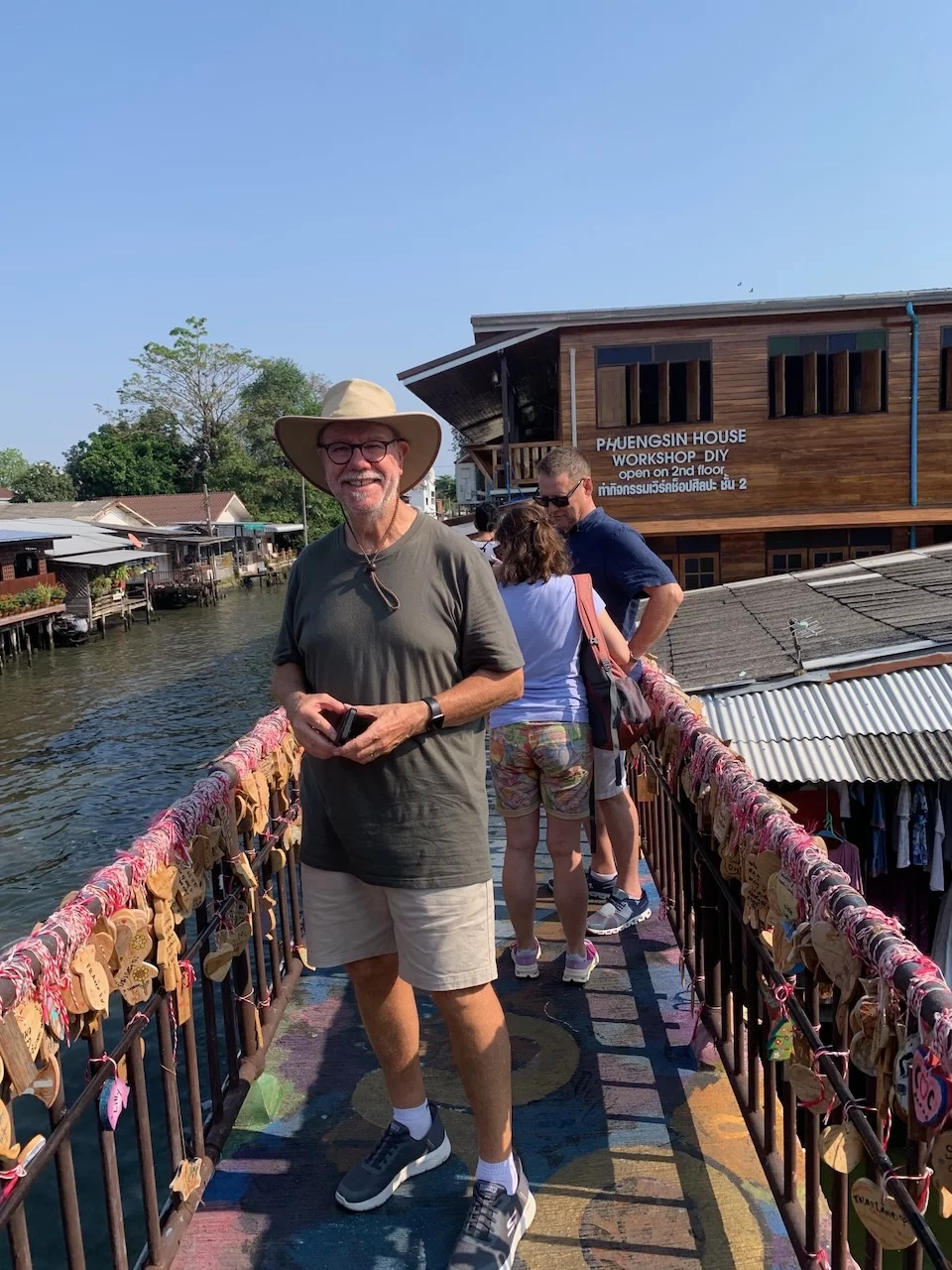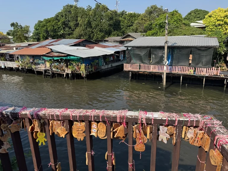 Auch in Thailand gibt es an Brückengeländern Liebesbeweise von Paaren. Sie sehen nur etwas anders aus als bei uns zuhause. Von der Brücke konnte man das geschäftige Treiben sowohl auf dem Kanal, als auch an dem Holzsteg entlang des Flusses mit diversen Shops, Bars und Restaurants. Unter anderem gibt es einen Shop, der Fischfutter in Form von Pellet verkauft. Damit kann man die Pangasius Fische im Kanal füttern. Eine Handvoll dieser Pellets löst einen regelrechten Freßkrieg unter den Fischen aus.