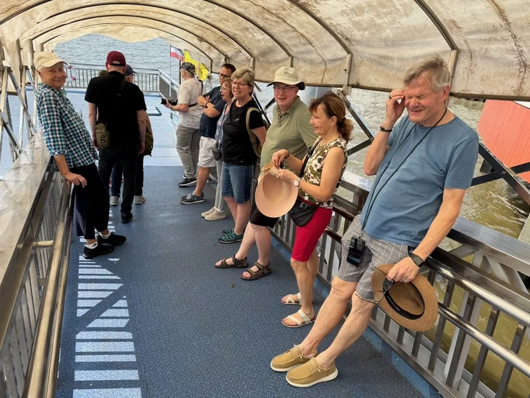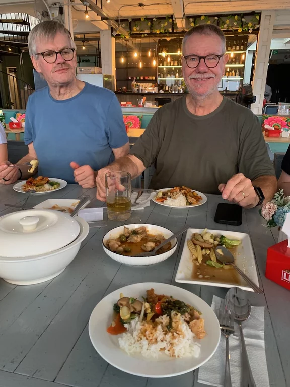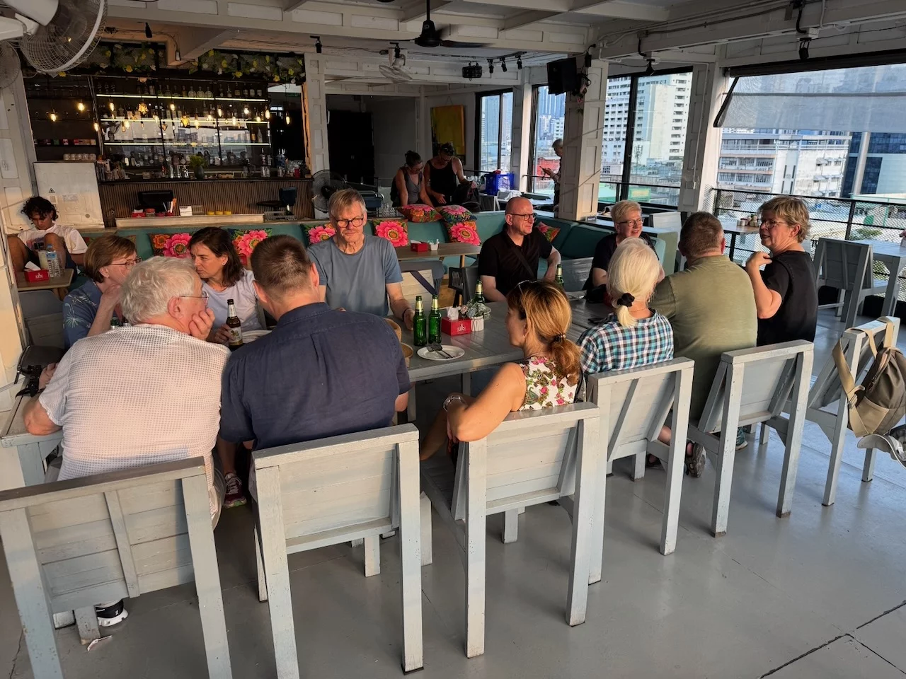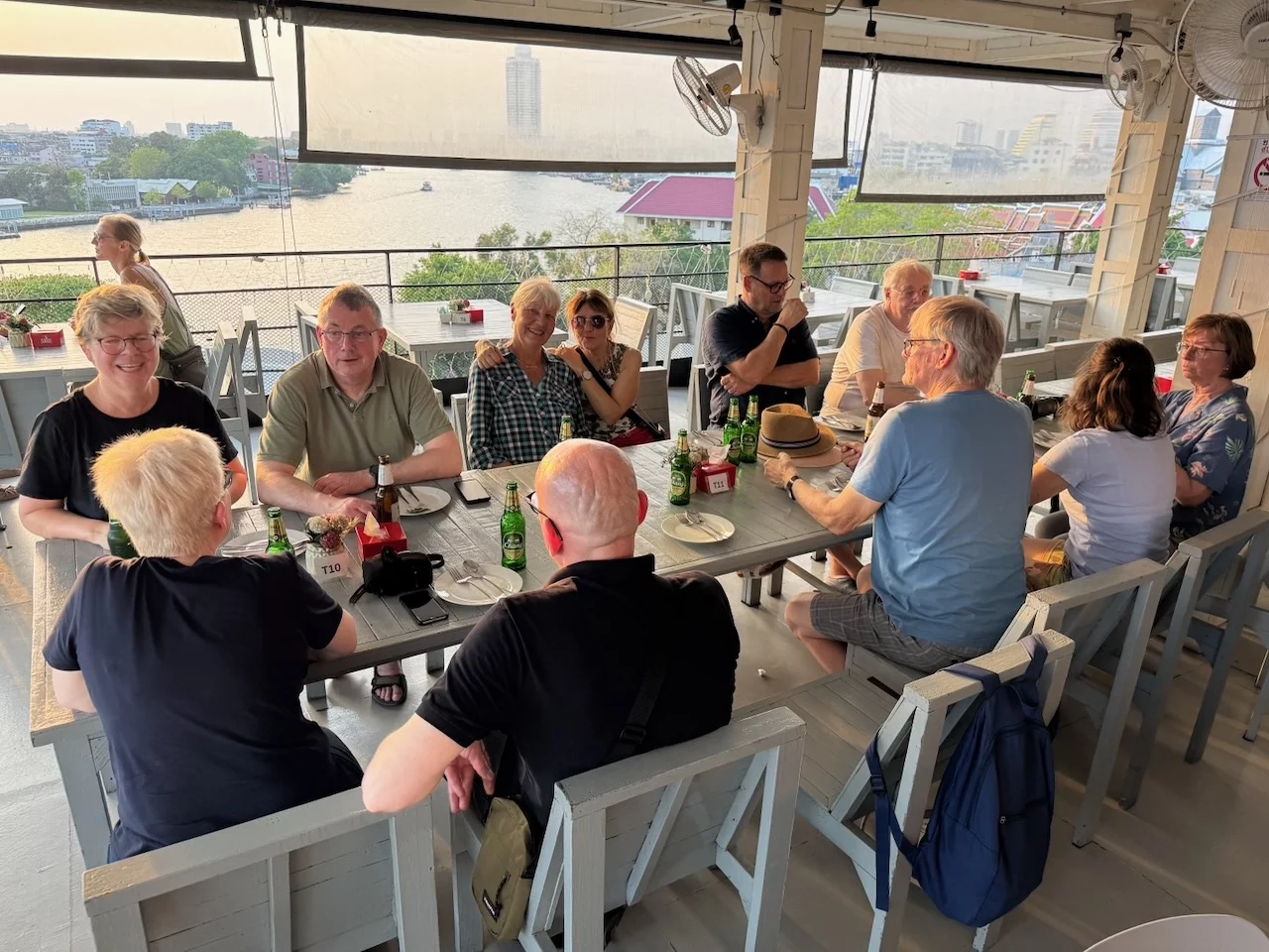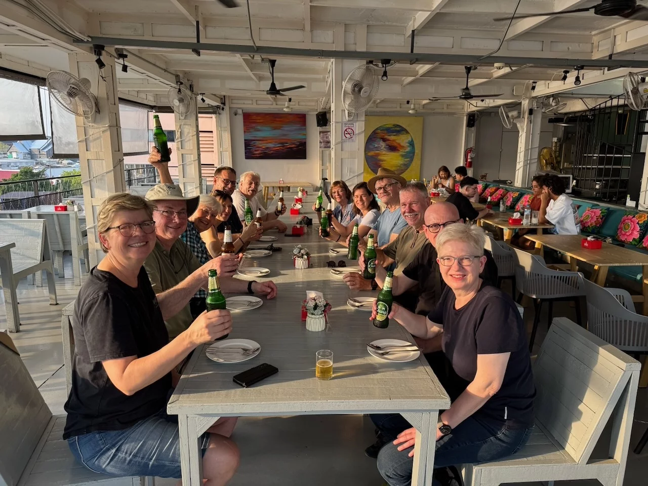 Das erste "Beschnuppern" mit den anderen Reiseteilnehmern fiel sehr positiv aus. Unser Reiseleiter hat sich als ein ein echtes Unikum herausgestellt. Er stellte sich als Herr Müller vor, da die meisten Kunden seinen eigentlichen Namen Vichien Thangton nicht unfallfrei aussprechen könnten. So sagte er zumindest. Sein "drolliges" Deutsch hat er durch einen 3-jährigen Aufenthalt in Hannover gelernt, während dessen er als Straßenbauingenieur gearbeitet hat. Seine Erklärungen und Weisheiten bringt er mit einer unvergleichlichen Komik und Gestik rüber. Wobei hier gleich erwähnt sein soll, dass der Mann ein unglaubliches Wissen hat. Wir werden in den nächsten Tagen sicherlich noch das eine oder andere von/über "Herrn Müller" zu berichten haben.