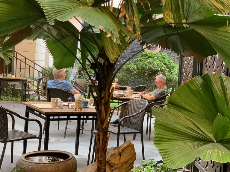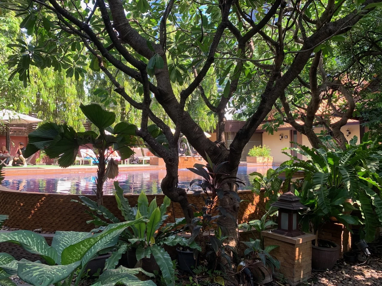 Heute morgen ist der Rest der Reisegruppe im Hotel eingetroffen. Da diese aber zunächst eine Pause brauchte um sich vom Flug zu erholen und frisch zu machen, hatte die Reiseleitung die Vorstellungsrunde in der Hotellobby und den anschließendem Start zur ersten Erkundung von Bangkok vom Fluss Chao Phraya auf 14:00 Uhr verschoben. Somit blieb uns reichlich Zeit, den Vormittag in dem sehr schönen Hotelgarten zu verbringen und ein ausgedehntes Frühstück zu genießen.