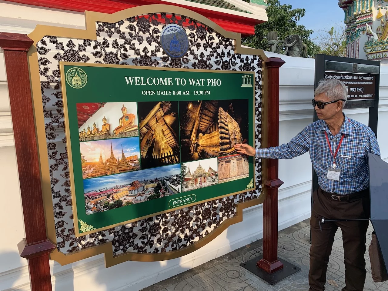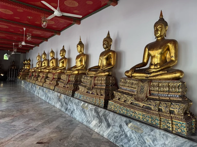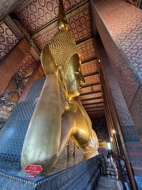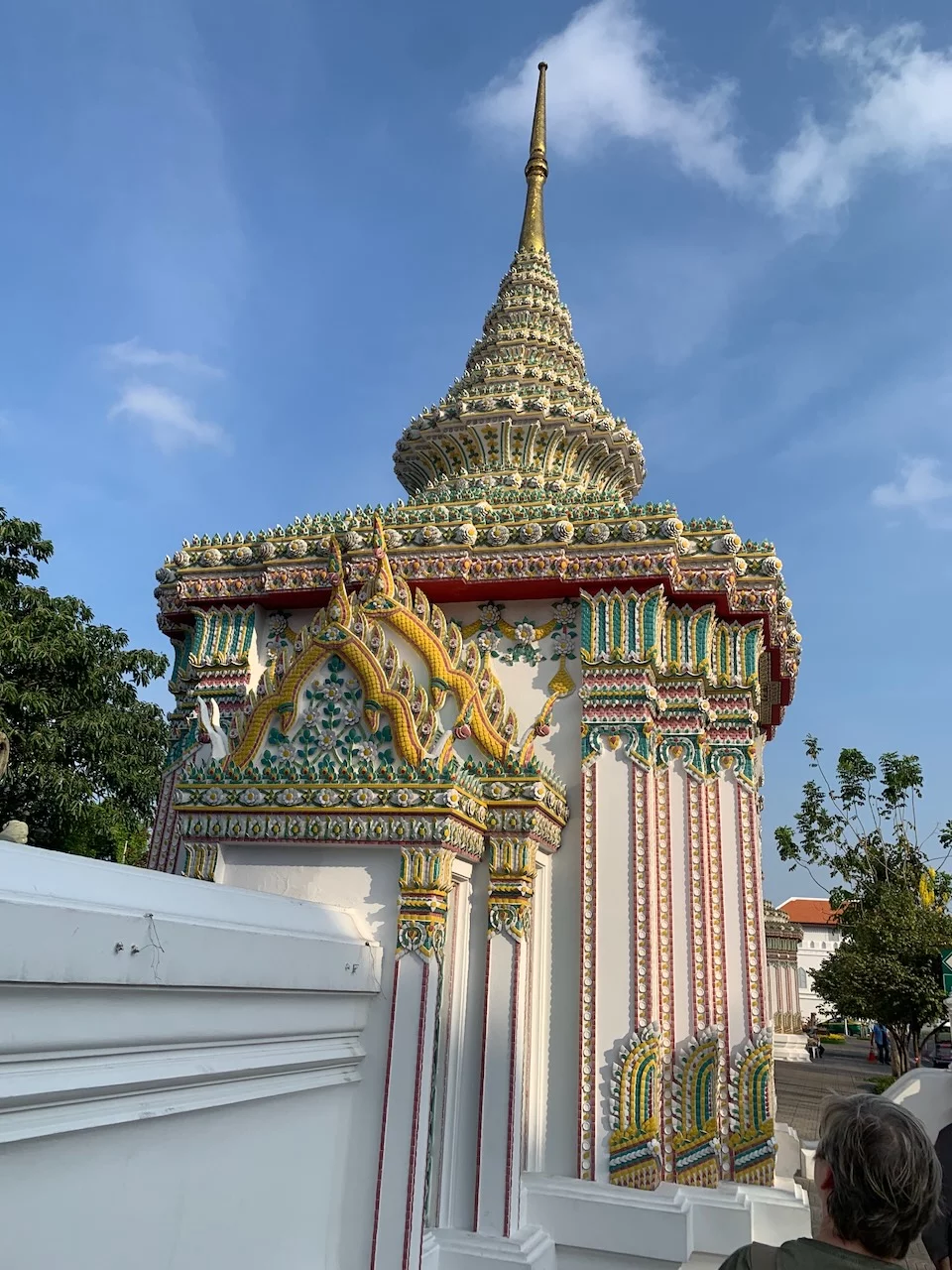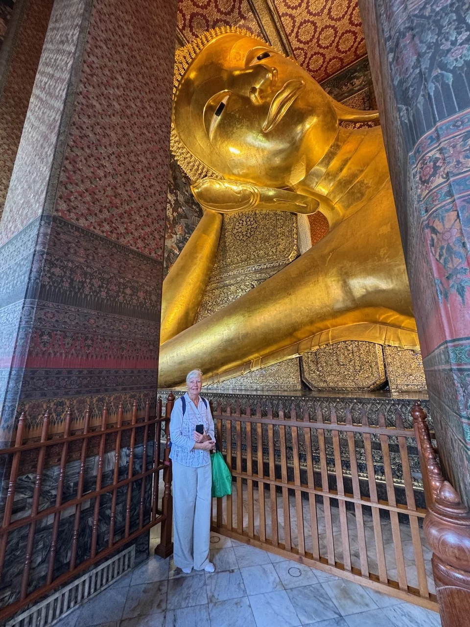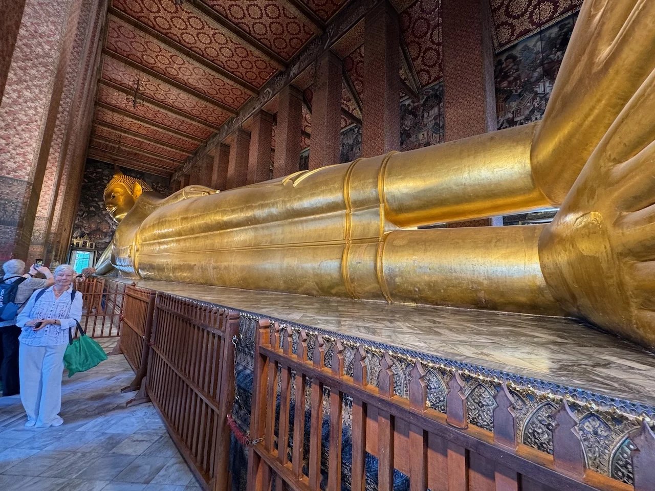 Mit der U-Bahn ging es dann zum Wat-Pho-Tempel. Bereits von außen waren einige der beeindruckenden Gebäude innerhalb der Tempelanlage zu erkennen. Hr. Müller hatte uns nicht umsonst schon sehr früh aus den Federn getrommelt. Denn der Tempel ist ab dem späteren Vormittag sehr sehr voll. Somit hatten wir die Zeit, uns zumindest anfangs noch recht störungsfrei in der Anlage bewegen zu können. Abgesehen von den wunderschönen, reichverzierten Gebäuden ist der liegenden Buddha sicherlich die Hauptattraktion. Aufgrund der schieren Größe ist es schwierig, ihn in seiner Gesamtheit auf ein Fotos bekommen.