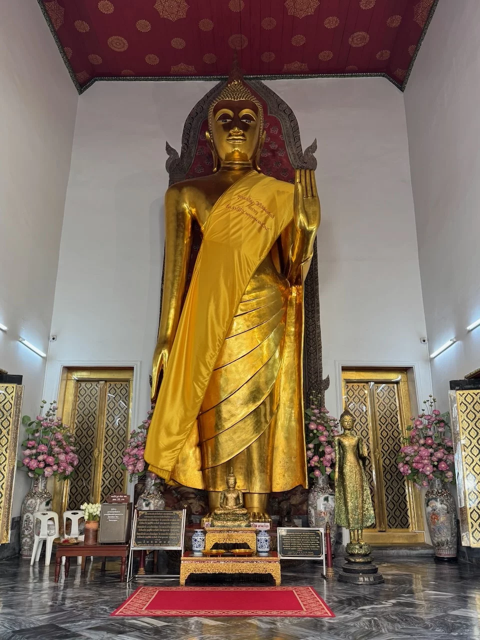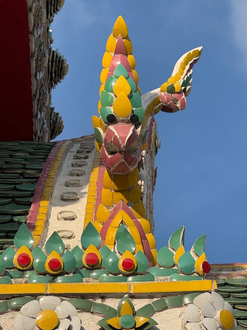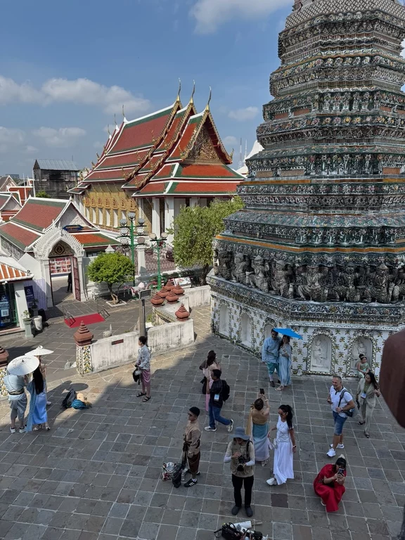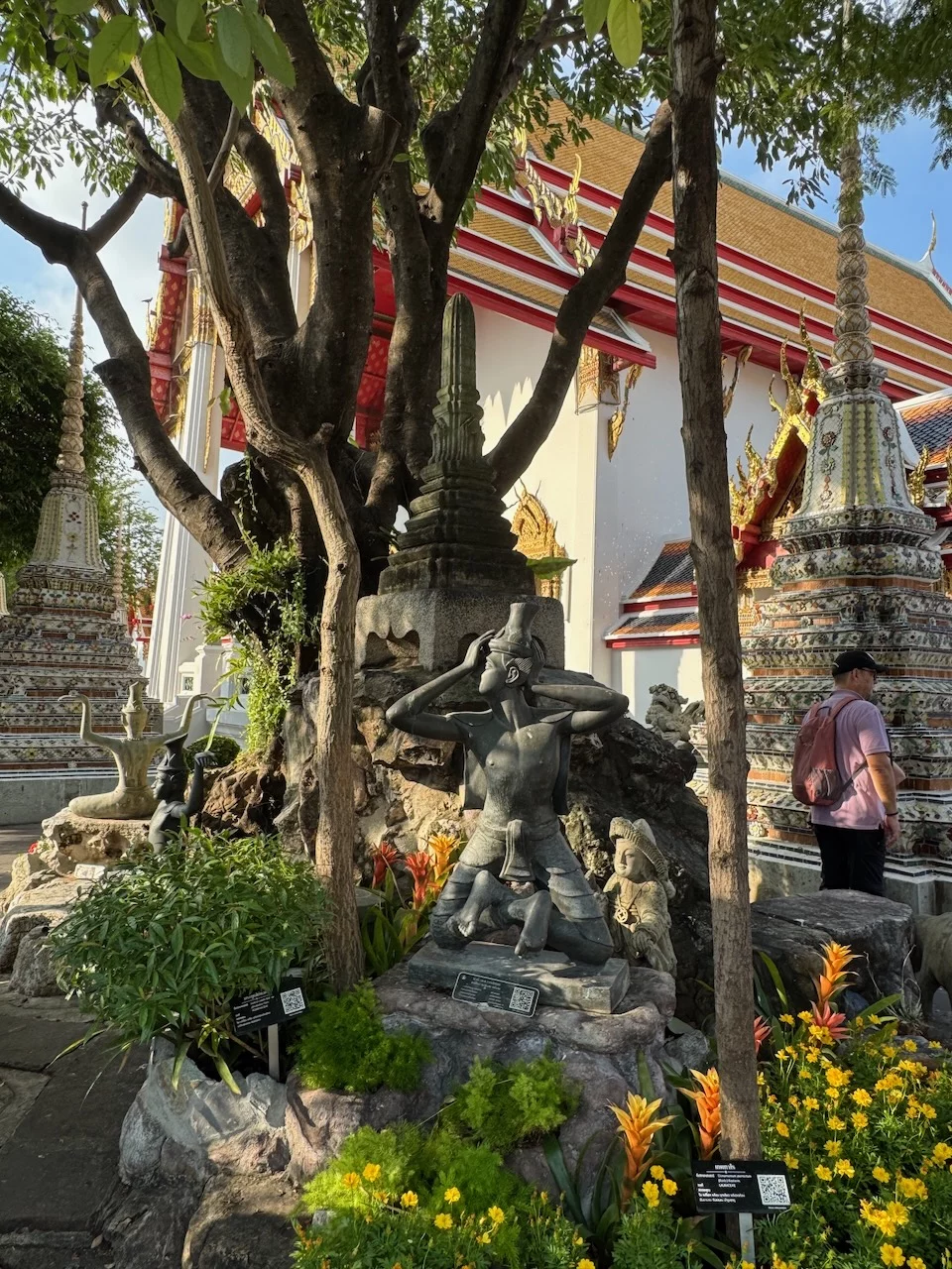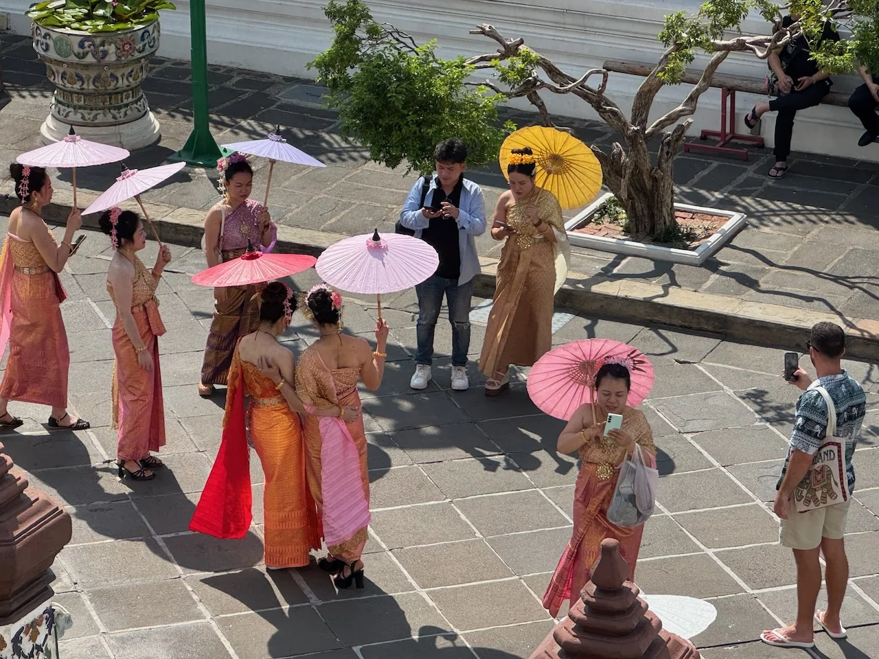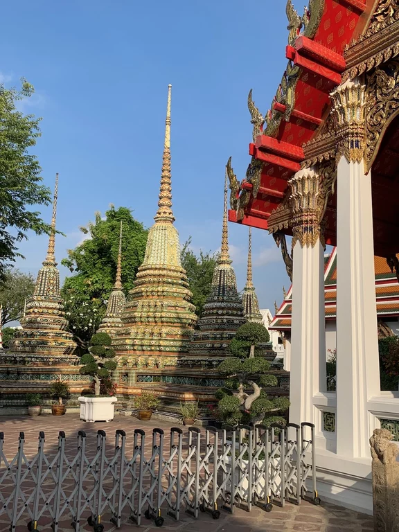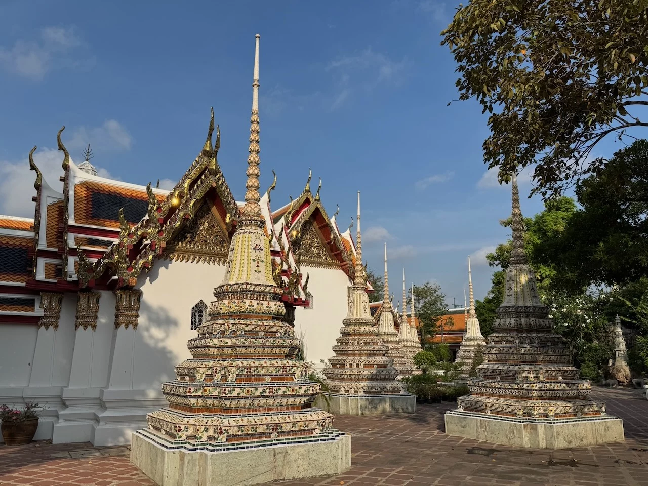Mit der U-Bahn ging es dann zum Wat-Pho-Tempel. Bereits von außen waren einige der beeindruckenden Gebäude innerhalb der Tempelanlage zu erkennen. Hr. Müller hatte uns nicht umsonst schon sehr früh aus den Federn getrommelt. Denn der Tempel ist ab dem späteren Vormittag sehr sehr voll. Somit hatten wir die Zeit, uns zumindest anfangs noch recht störungsfrei in der Anlage bewegen zu können. Abgesehen von den wunderschönen, reichverzierten Gebäuden ist der liegenden Buddha sicherlich die Hauptattraktion. Aufgrund der schieren Größe ist es schwierig, ihn in seiner Gesamtheit auf ein Fotos bekommen.