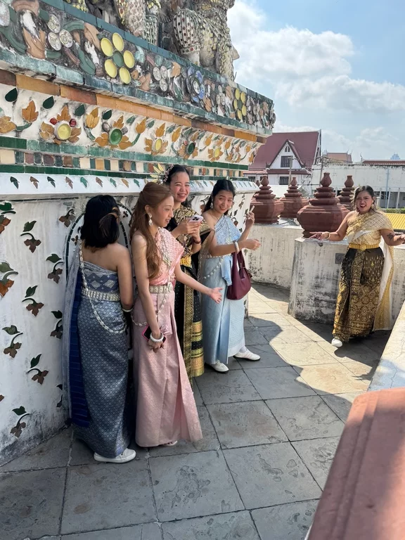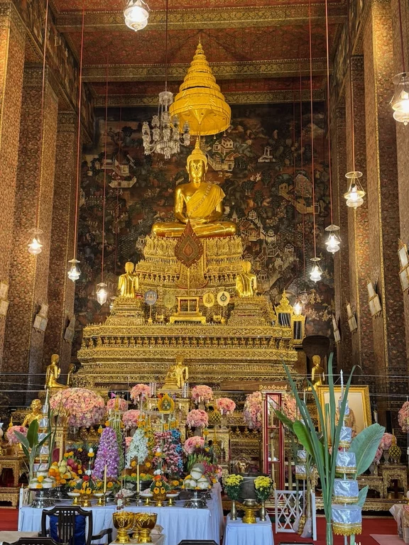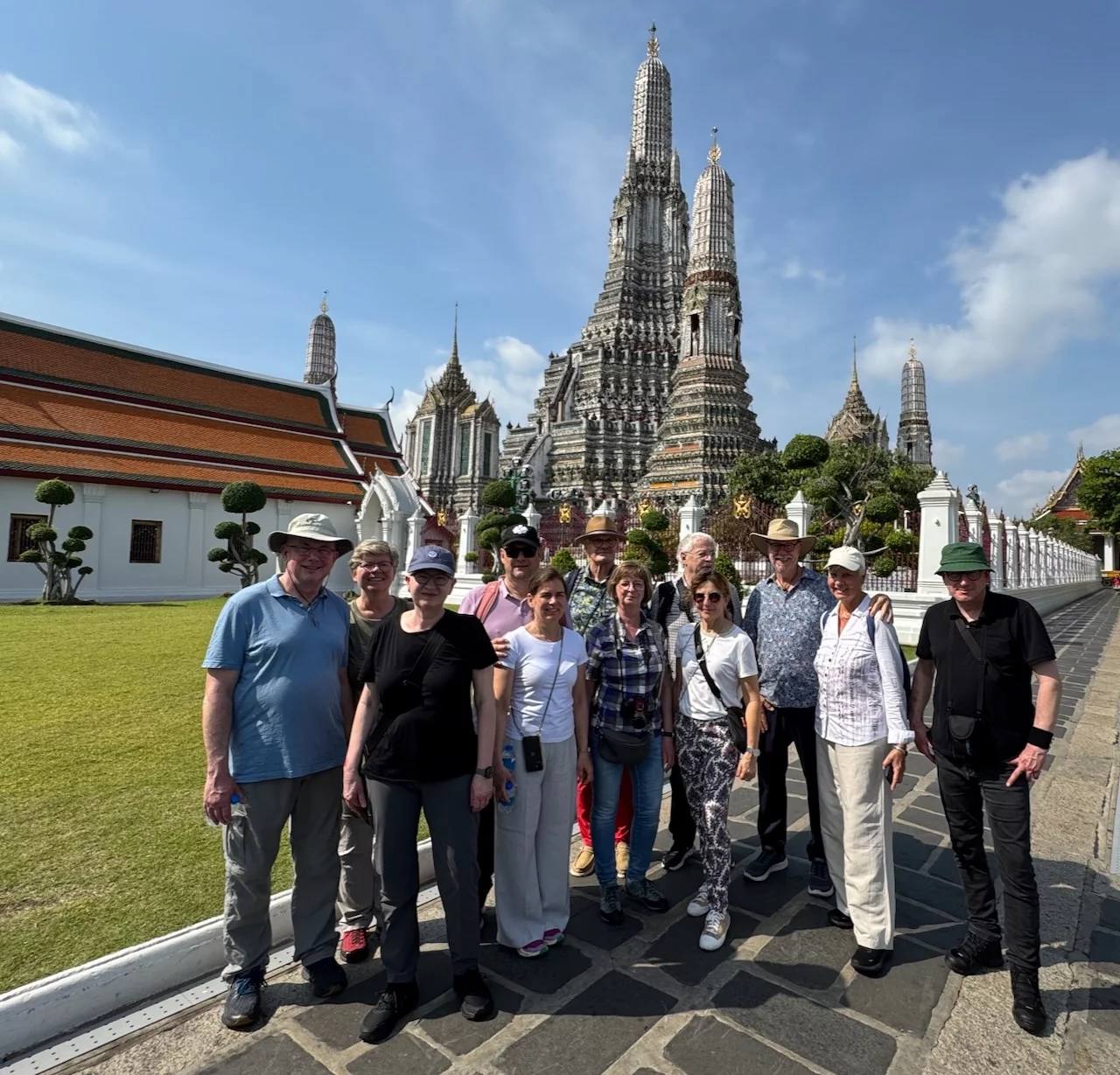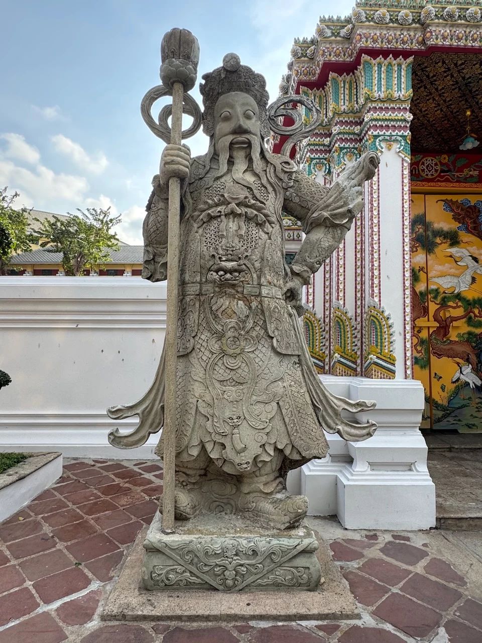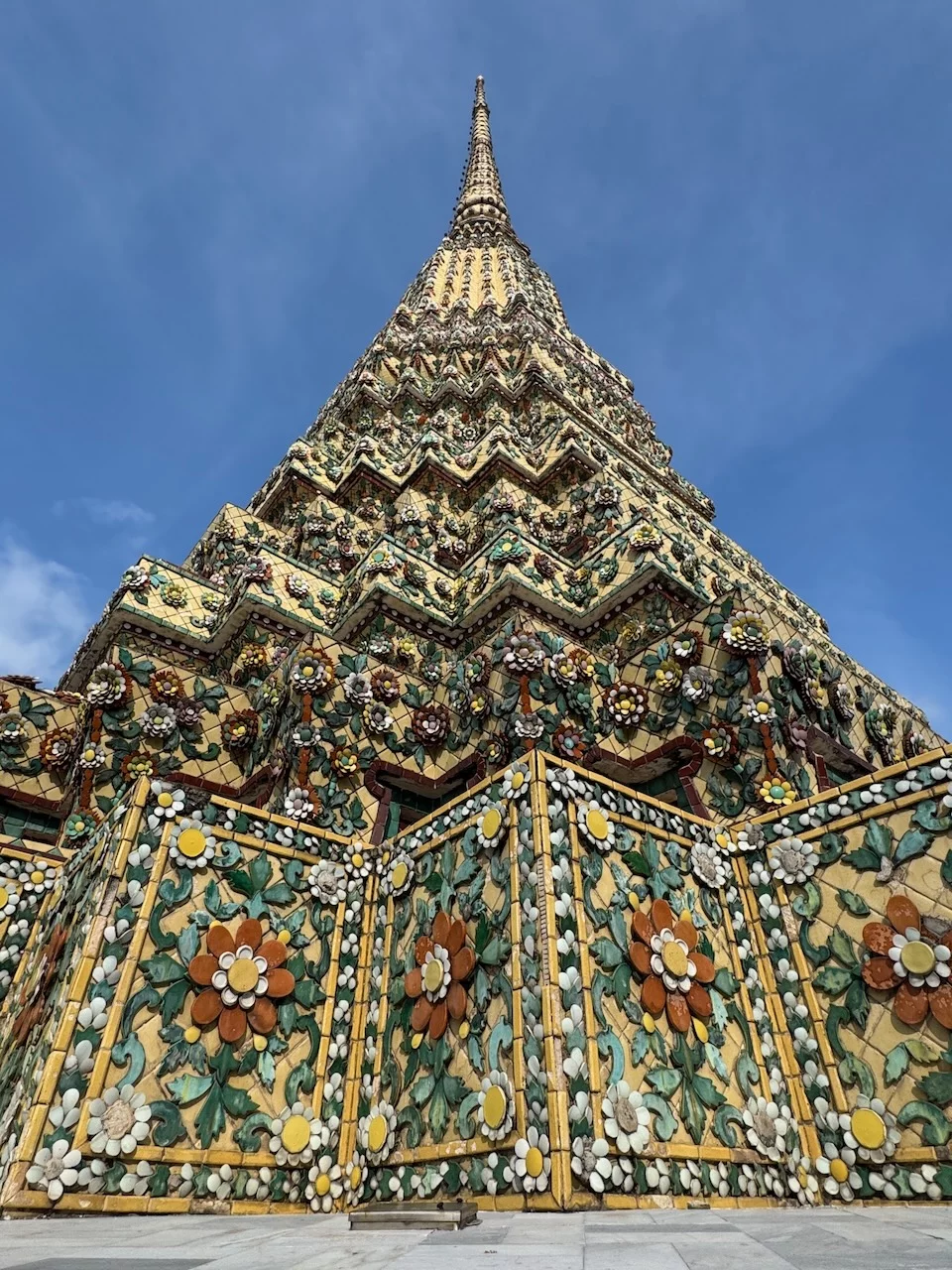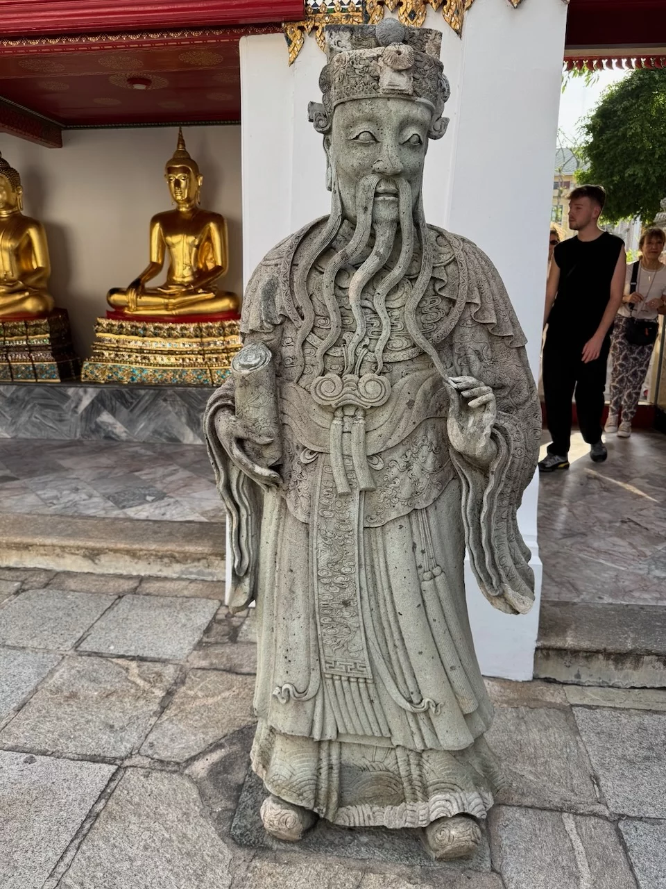 Mit der U-Bahn ging es dann zum Wat-Pho-Tempel. Bereits von außen waren einige der beeindruckenden Gebäude innerhalb der Tempelanlage zu erkennen. Hr. Müller hatte uns nicht umsonst schon sehr früh aus den Federn getrommelt. Denn der Tempel ist ab dem späteren Vormittag sehr sehr voll. Somit hatten wir die Zeit, uns zumindest anfangs noch recht störungsfrei in der Anlage bewegen zu können. Abgesehen von den wunderschönen, reichverzierten Gebäuden ist der liegenden Buddha sicherlich die Hauptattraktion. Aufgrund der schieren Größe ist es schwierig, ihn in seiner Gesamtheit auf ein Fotos bekommen.