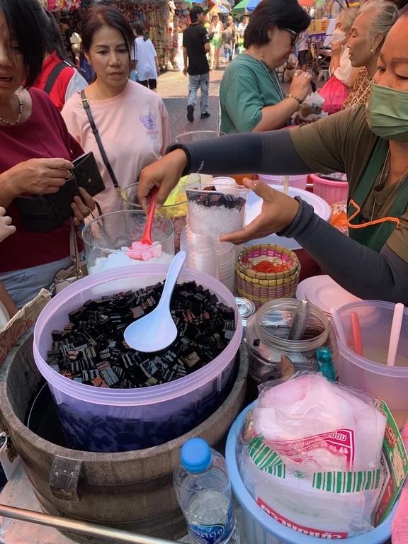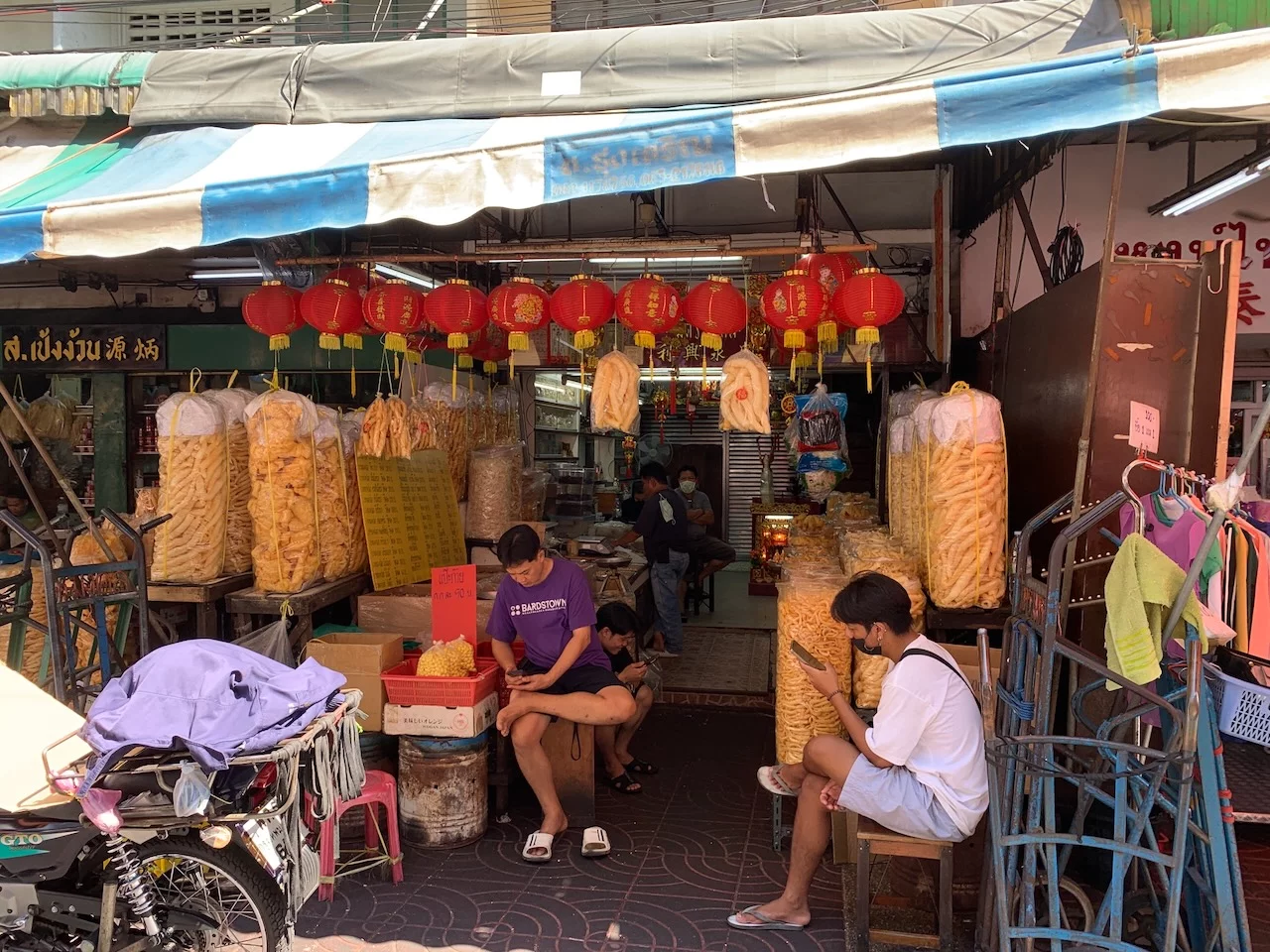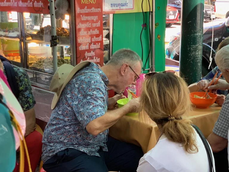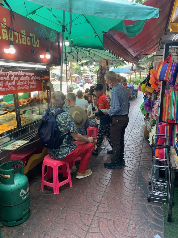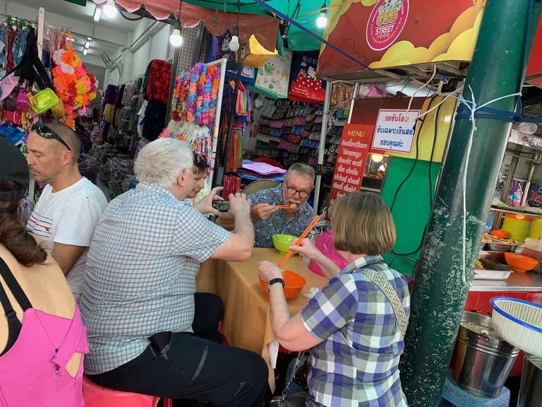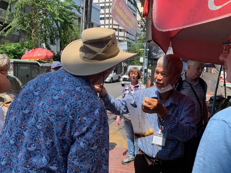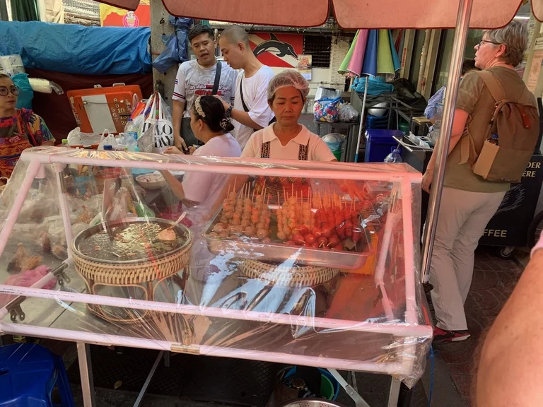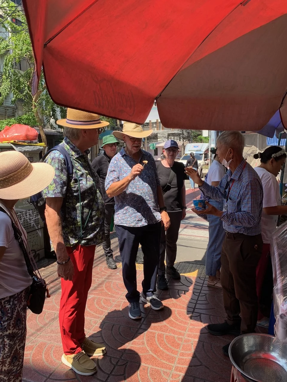 Dort wehen einem beim Spaziergang durch einen der ältesten Teile von Bangkok schon die verschiedenste Gerüche um die Nase. Bei einigen Dingen, die man sieht und riecht, bilden sich automatisch einige Fragezeichen im Kopf. Denn Herr Müller hatte hier für uns ein kleines Mittagessen in einer Garküchen organisiert. Auf dem Weg dorthin mussten wir noch verschiedene kleine Häppchen (?) aus der chinesischen Küche probieren. Da heißt es Augen zu und durch.