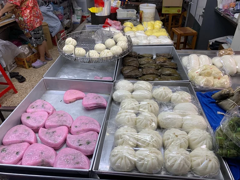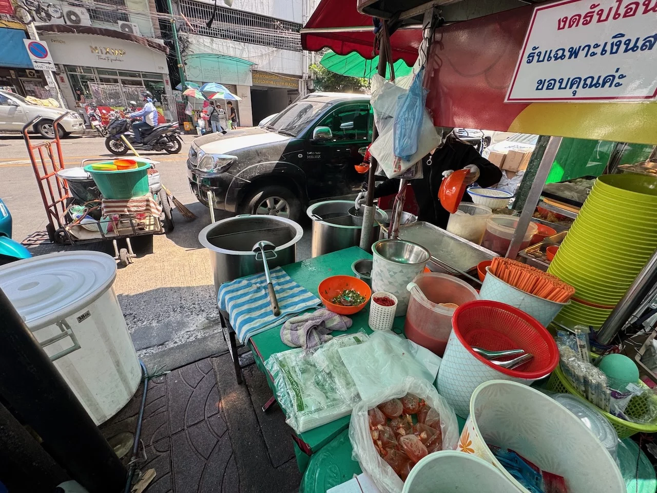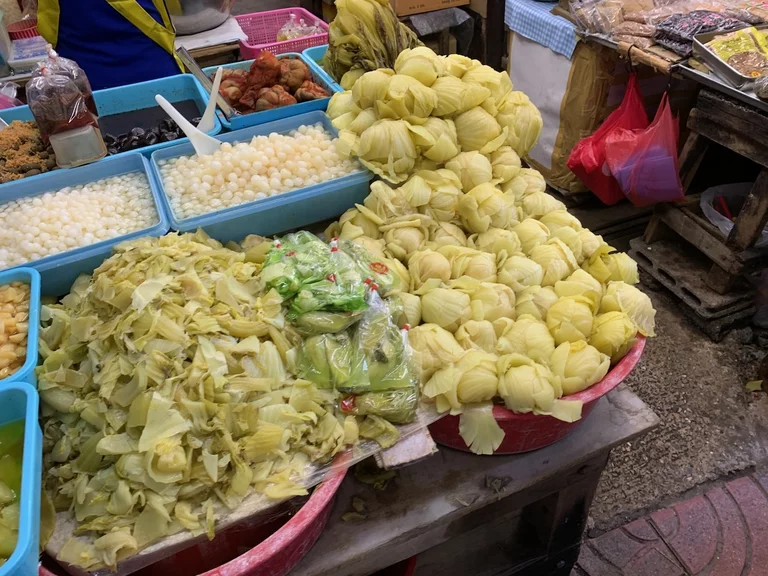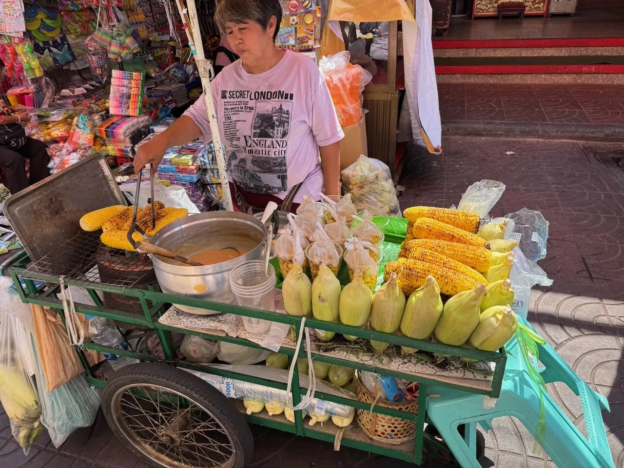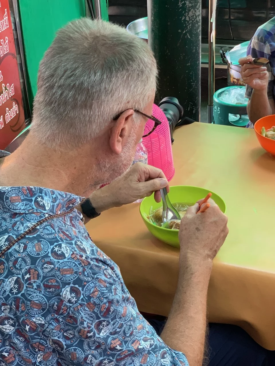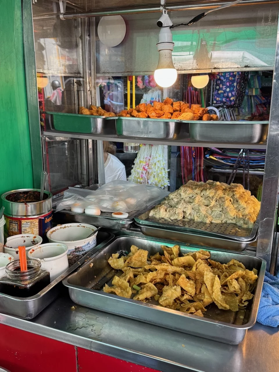 Dort wehen einem beim Spaziergang durch einen der ältesten Teile von Bangkok schon die verschiedenste Gerüche um die Nase. Bei einigen Dingen, die man sieht und riecht, bilden sich automatisch einige Fragezeichen im Kopf. Denn Herr Müller hatte hier für uns ein kleines Mittagessen in einer Garküchen organisiert. Auf dem Weg dorthin mussten wir noch verschiedene kleine Häppchen (?) aus der chinesischen Küche probieren. Da heißt es Augen zu und durch.