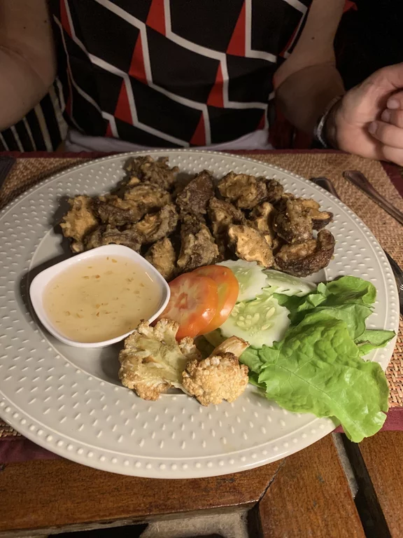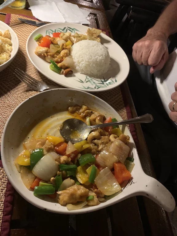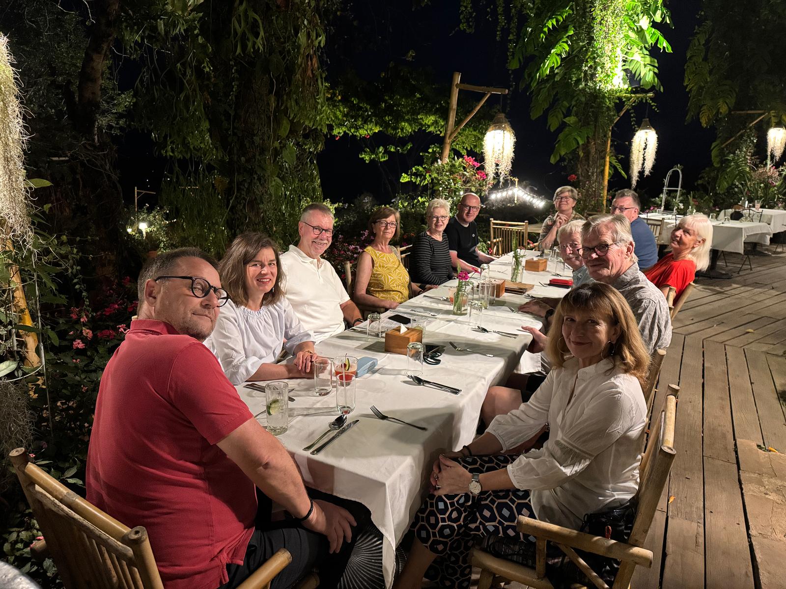 Das Abendessen fand in einem tollen Ambiente im Garten des Hotels statt und war diesmal a la carté. So begann der Spaß schon beim studieren der Speise- und Getränkekarte. Als Appetizer servierte der Wettergott noch einen wunderschönen Sonnenuntergang und die ausgewählten Hauptgänge ließen ebenfalls nichts zu wünschen übrig.