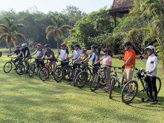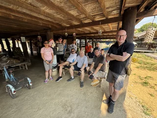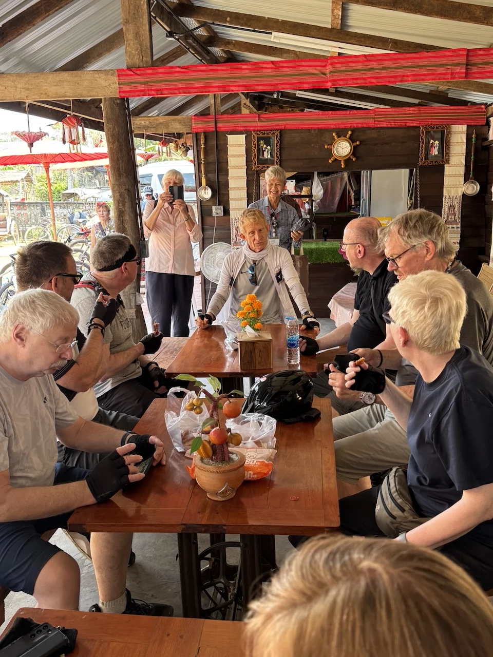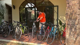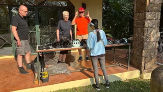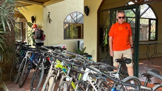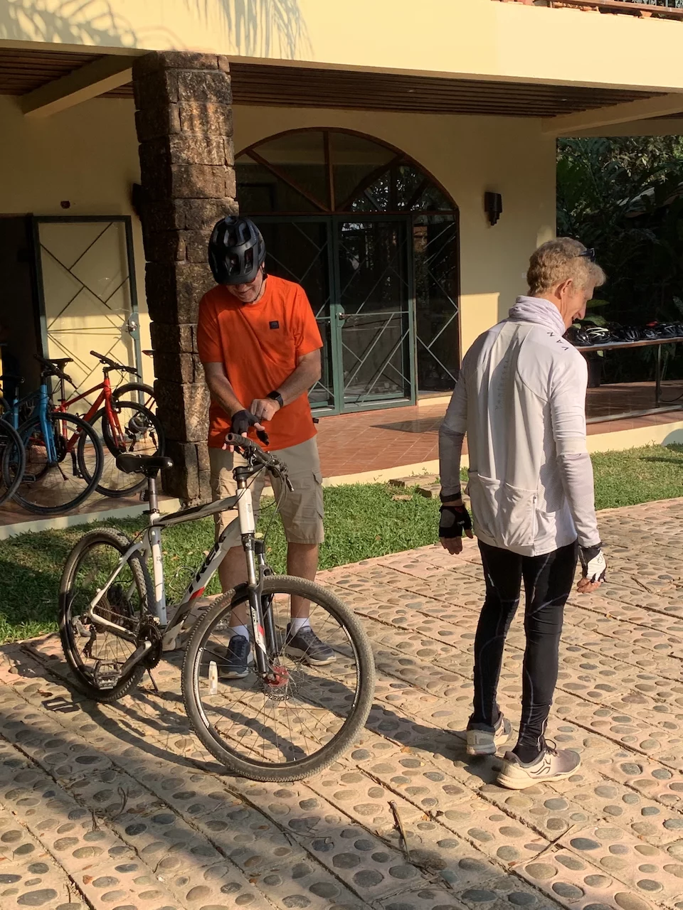 Zur Abwechslung stand heute mal eine Fahrradtour auf dem Programm. Hotelbesitzer Rico fungierte als "Teamkapitän" und Tourguide. Vor dem Hotel standen aufgereiht die Fahrräder (keine e-Bikes!!), aus denen sich jeder das für sie/ihn passende Rad aussuchen konnte. Direkt daneben stand ein Tisch mit Fahrradhelmen und fingerlosen Handschuhen.