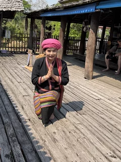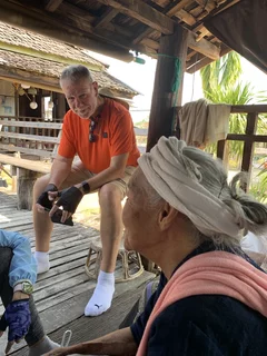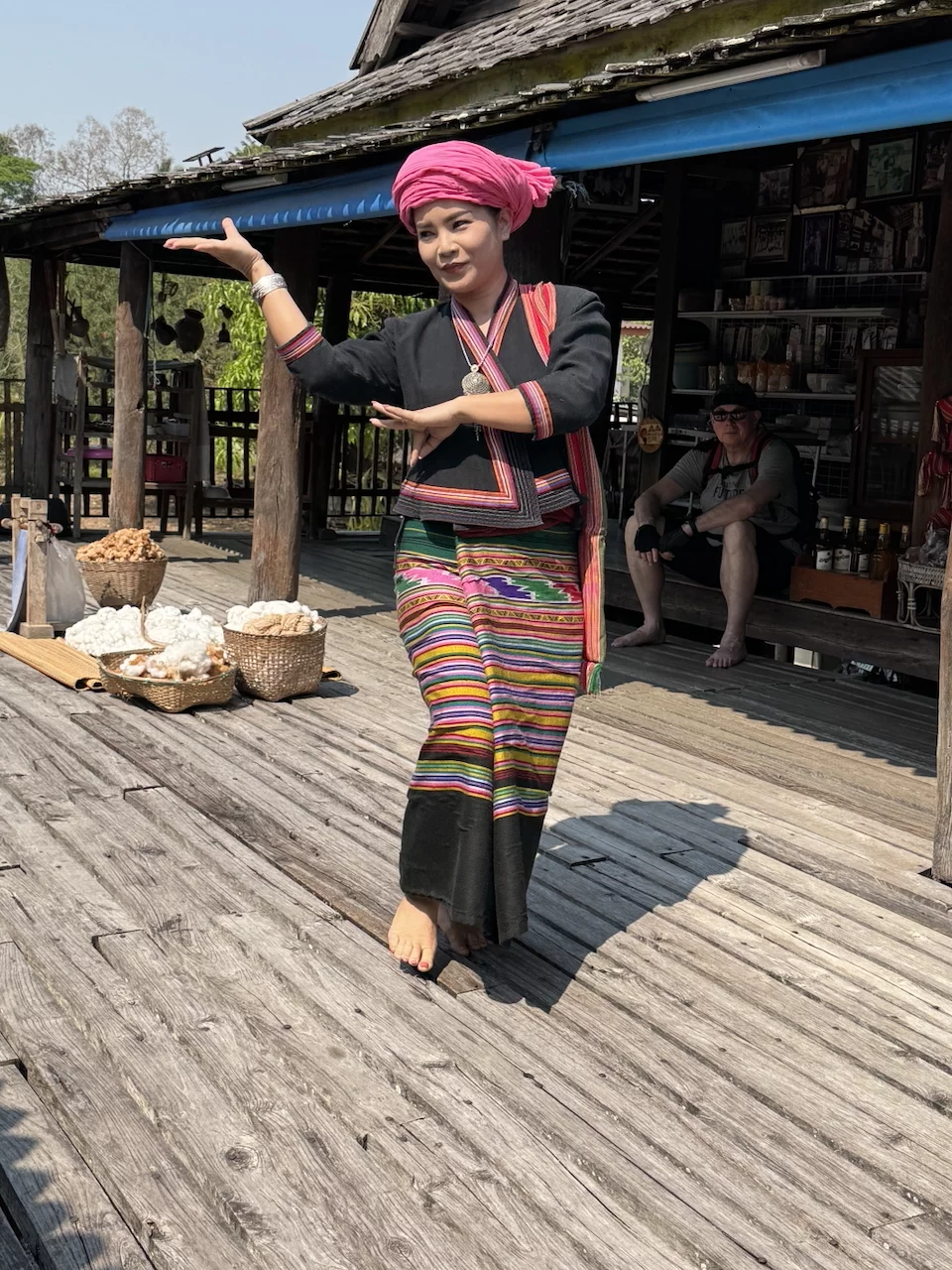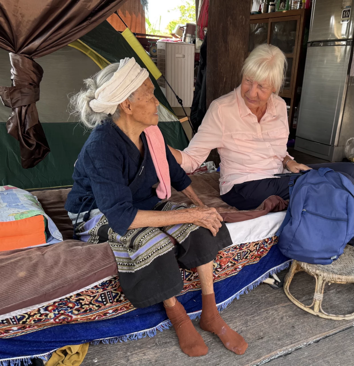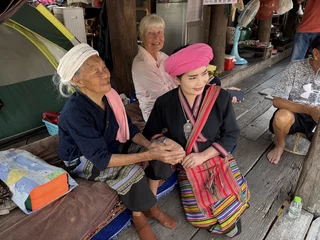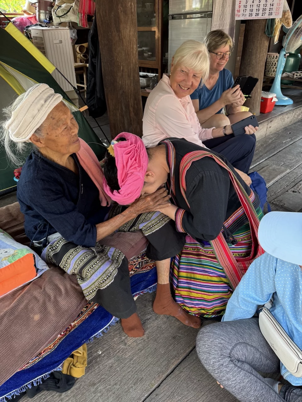 Höhepunkt unseres Besuches war aber das Treffen mit Großmutter Saengda. Sie ist 96 Jahre alt und das verehrte Oberhaupt der Familie und so etwas wie die Institution in der Thai Lue Gemeinschaft. Verehrung und Respekt vor der "alten Dame" wurde ganz besonders deutlich in der Art, wie ihre Schwiegertochter sie begrüßte. Sie war gekommen, um uns die traditionellen Kleidung der Thai Lue in einem kurzen Tanz vorzuführen.