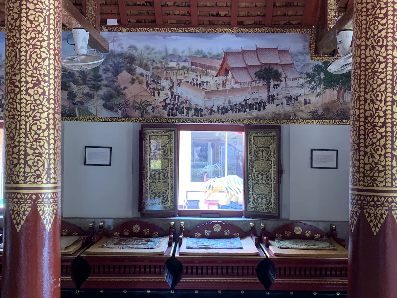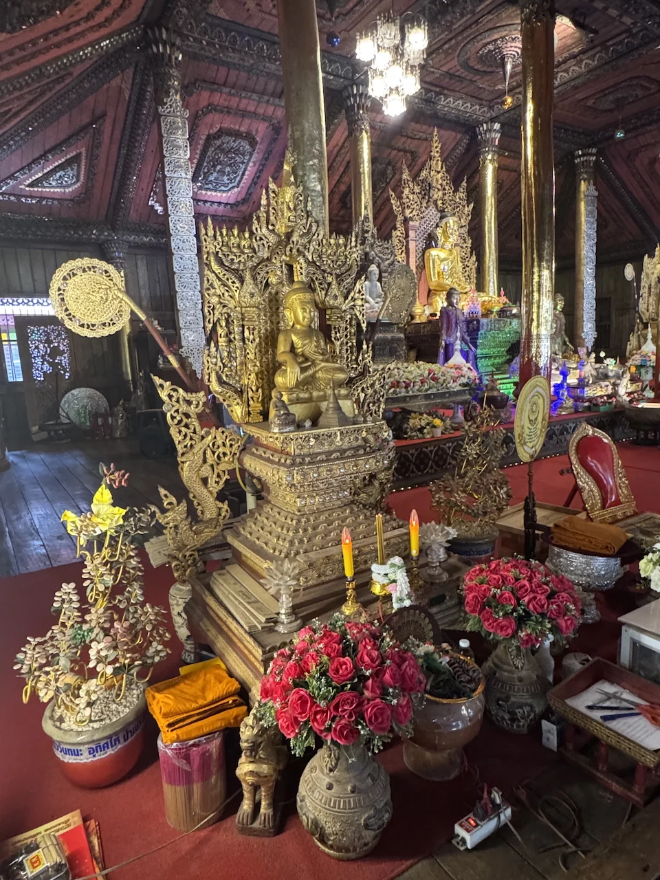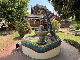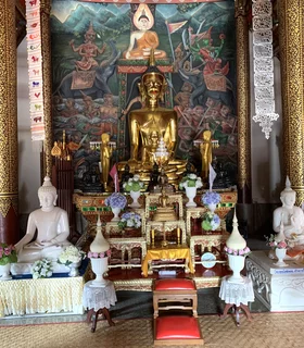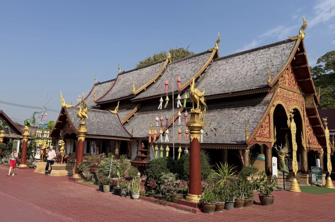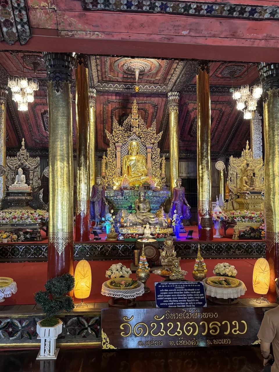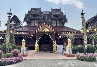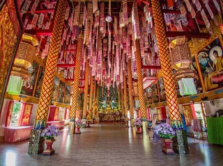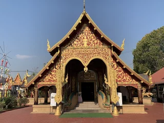 Das zentrales Bauwerk innerhalb des Wat Nantaram ist der Viharn - der Predigtsaal -, der im Jahr 1925 aus Teakholz erbaut wurde. Seine Architektur mit insgesamt 68 goldbemalten Säulen im traditionellen Tai Yai-Stil macht ihn zu einem wahren Meisterwerk. Dieser Predigtsaal ist ein Ort der Andacht und Spiritualität, der die Besucher in eine andere Zeit und Kultur entführt.,