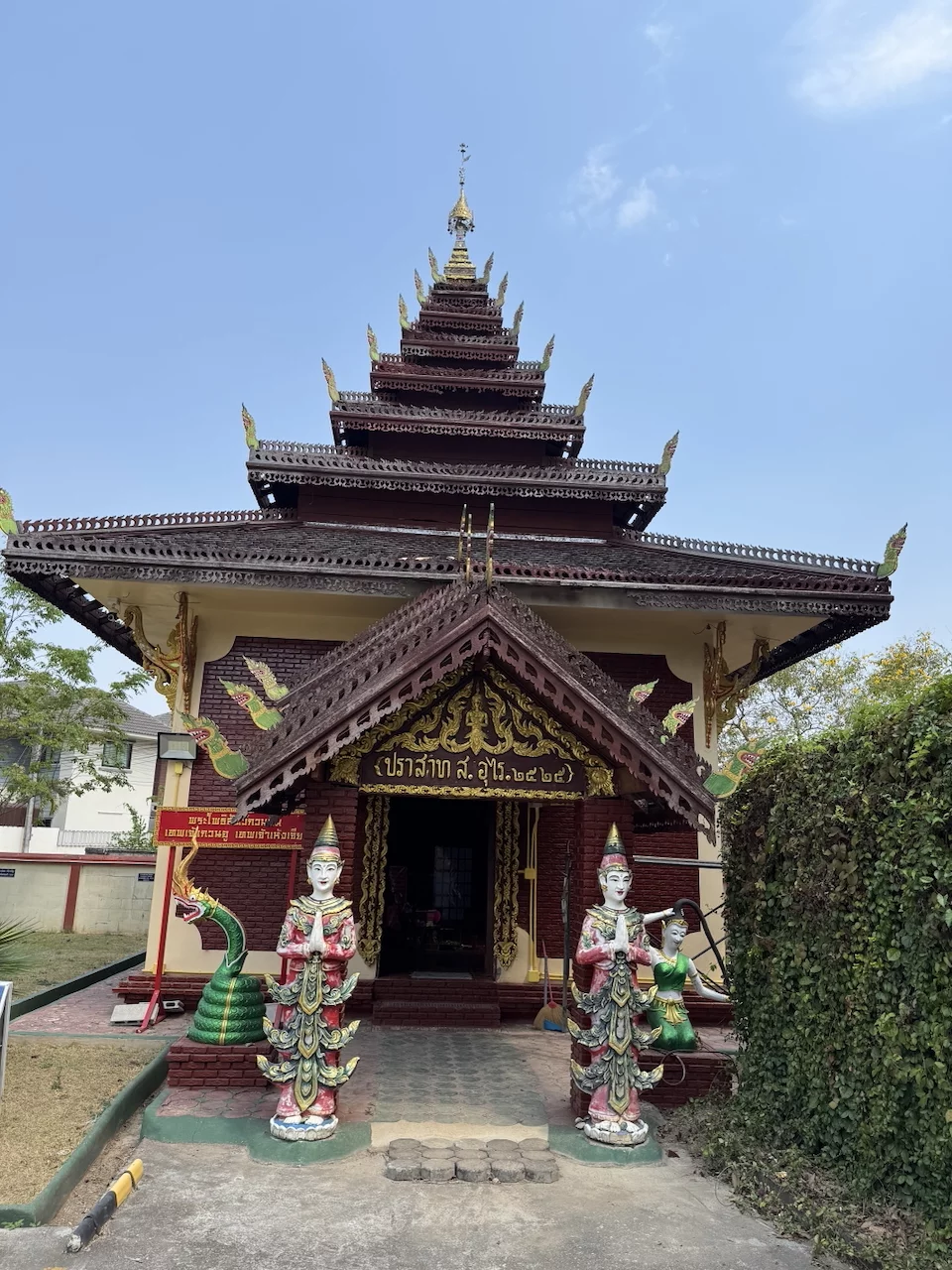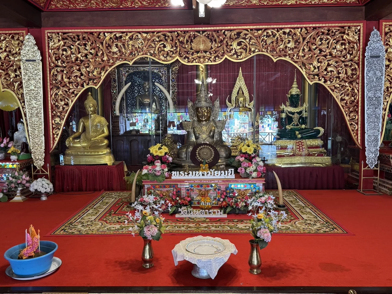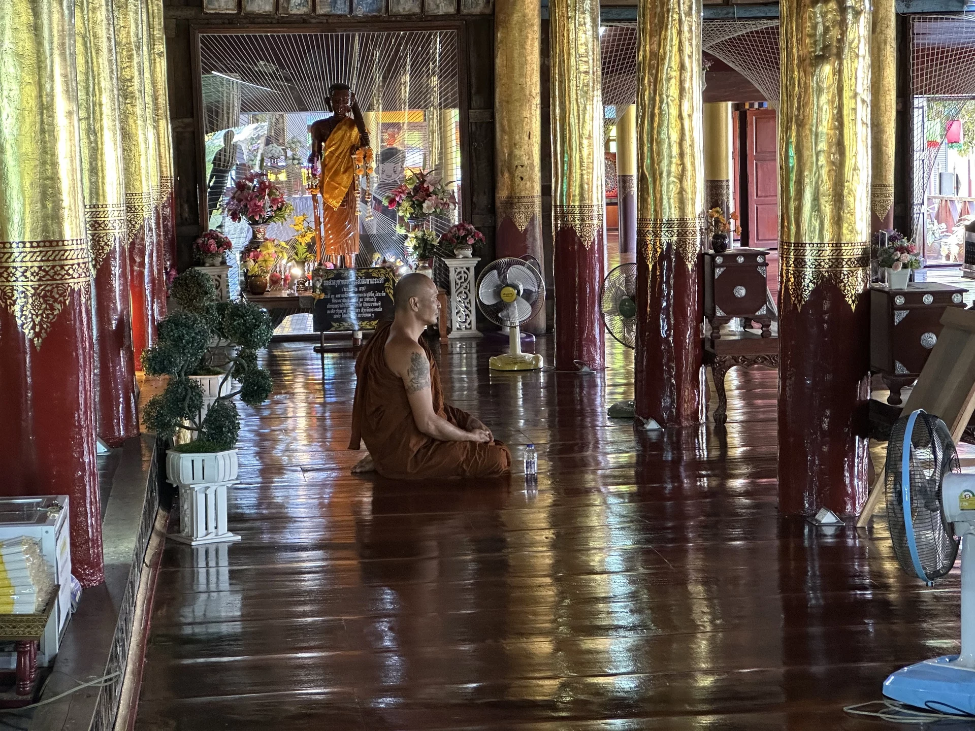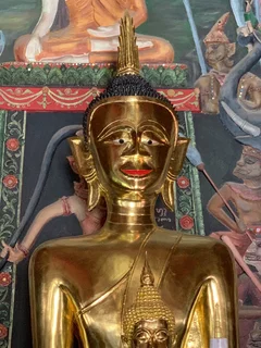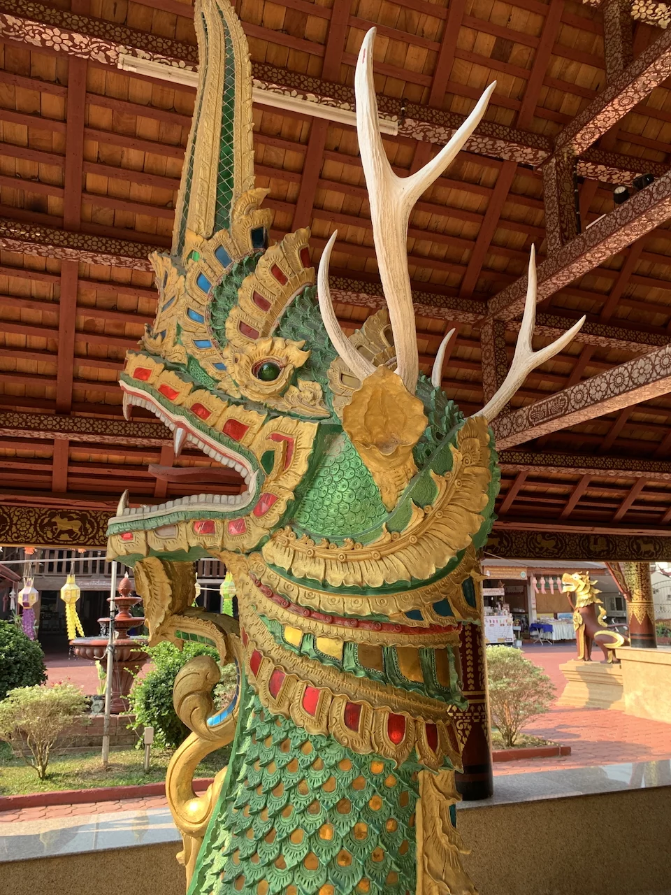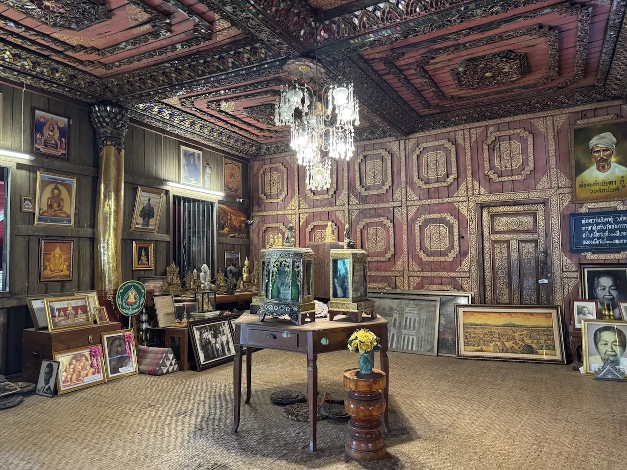 Das zentrales Bauwerk innerhalb des Wat Nantaram ist der Viharn - der Predigtsaal -, der im Jahr 1925 aus Teakholz erbaut wurde. Seine Architektur mit insgesamt 68 goldbemalten Säulen im traditionellen Tai Yai-Stil macht ihn zu einem wahren Meisterwerk. Dieser Predigtsaal ist ein Ort der Andacht und Spiritualität, der die Besucher in eine andere Zeit und Kultur entführt.,