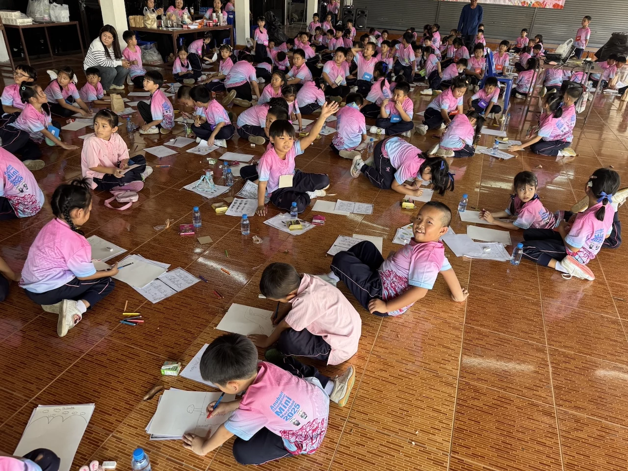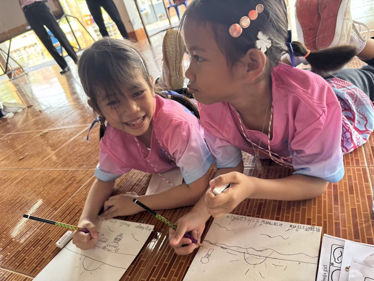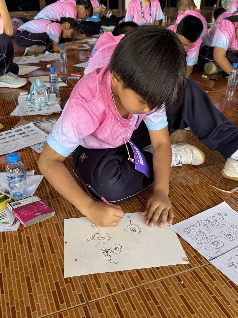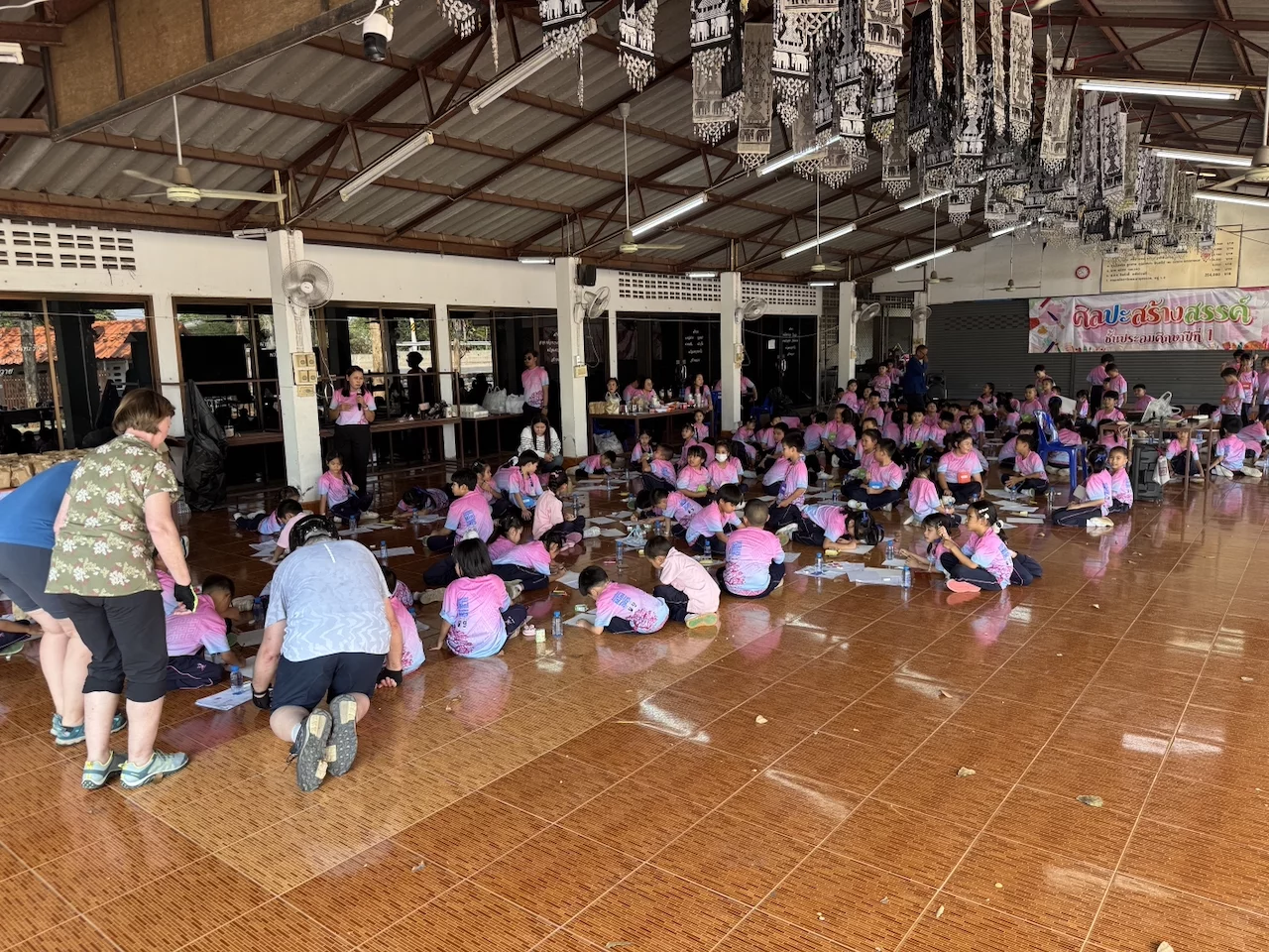 In einem "offenen Klassenzimmer" durften wir den Kindern einige Zeit beim Unterricht zusehen. Offensichtlich bestand die Aufgabe darin, auf Basis einer Vorlage Tierfiguren zu zeichnen. Wir konnten uns direkt unter die Kinder mischen und die kleinen Kunstwerke bestaunen, die uns völlig ohne Scheu mit Stolz gezeigt wurden.