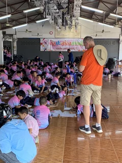 Als wir uns verabschieden mussten, wurde Musik eingespielt und Georg, ein Mitglied unserer Gruppe, begann dazu zu "tanzen" und animierte damit die Kinder, sich vor ihm zu versammeln und rhythmisch zu klatschen.