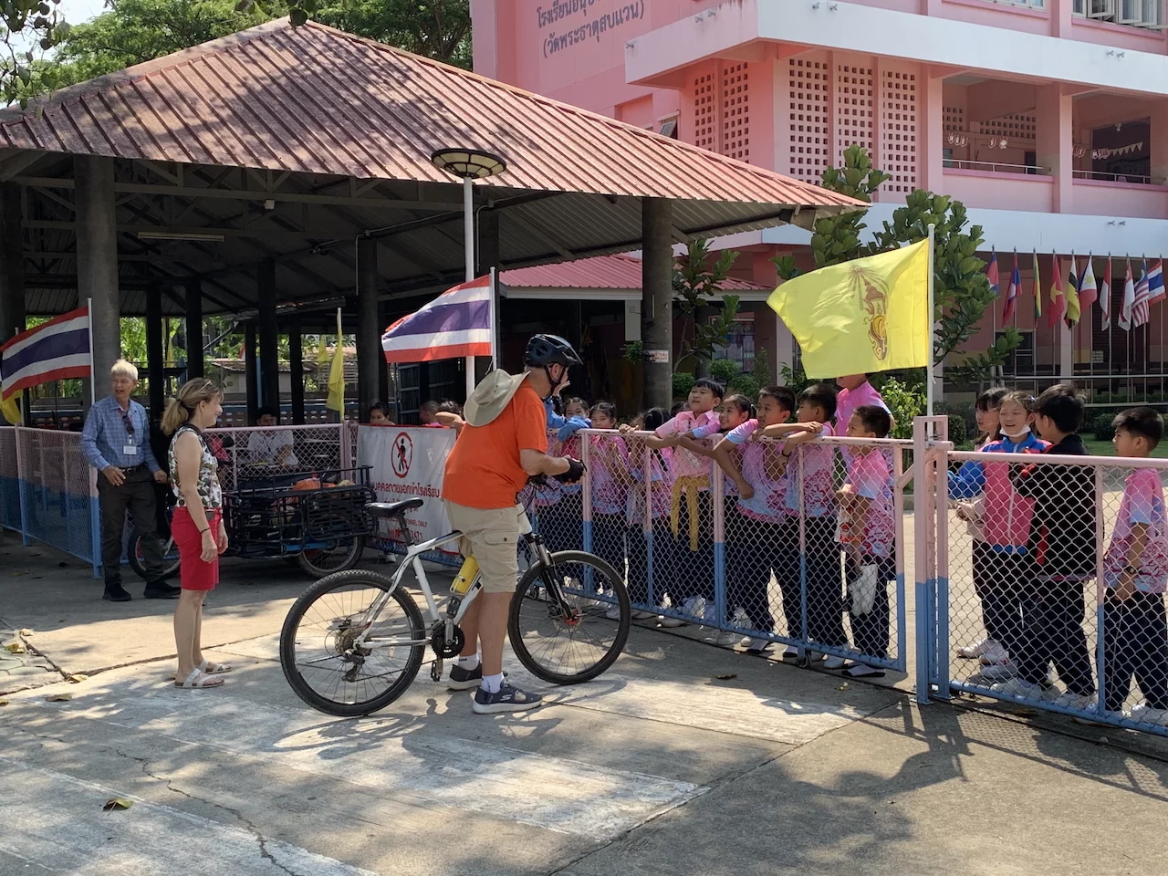 Der weitere Weg unserer "Radltour" führte an einer Grundschule vorbei. Für die Kinder auf dem Schulhof waren wir eine echte Attraktion. Während die anderen weiter zum Schulgebäude fuhren, habe ich kurz am Schulhof angehalten. Sofort kamen die Kinder zum Zaun gestürmt und ich wurde prompt mit Fragen (teilweise in Englisch) regelrecht bombadiert. Es war eine lustige "Unterhaltung", die sehr viel Spaß gemacht hat.