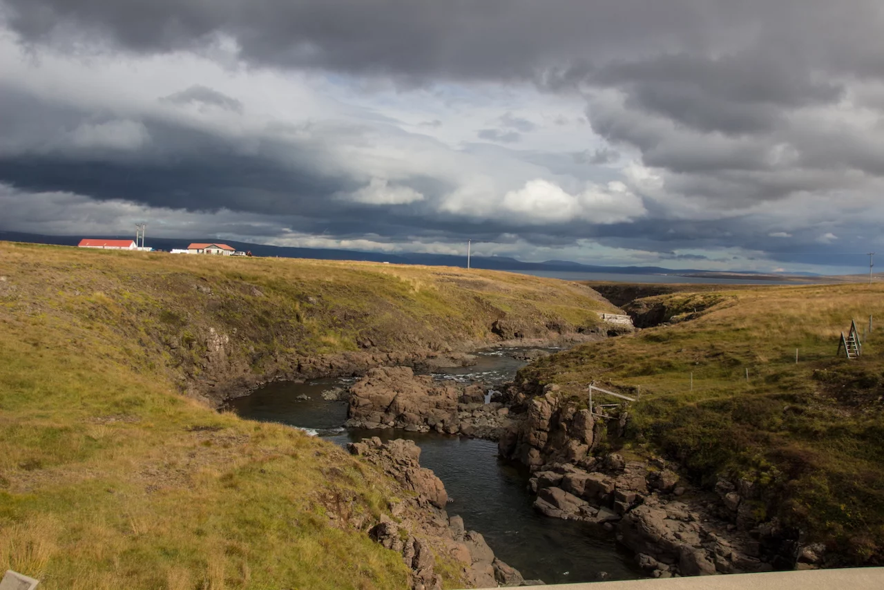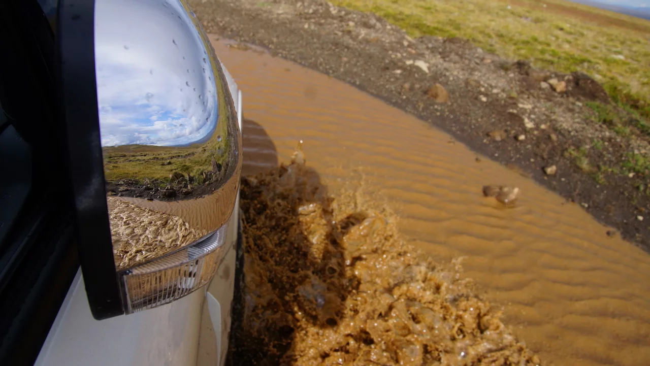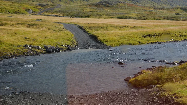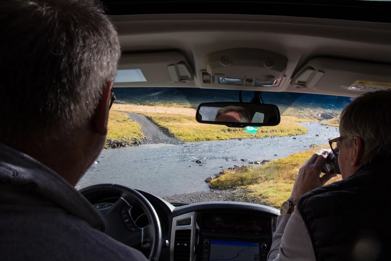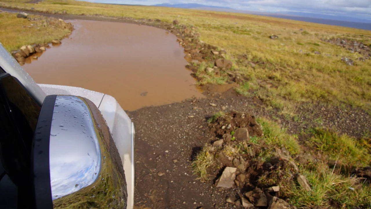 Lucy – ihr wisst schon, das Navi - wollte uns den einfachen, bequemen und deutlich schnelleren Weg über gut ausgebaute Strassen wie die N1 Ringstrasse nach Varmahlid, unserem nächsten Übernachtungsort, führen. Das hätte aber einen Umweg von gut 60km bedeutet. Google bot eine entsprechend kürzere, aber landschaftlich viel interessantere Route über eine nicht asphaltierte Nebenstrasse an, die allerdings für die letzten 27 Kilometern zu einer sogenannte F-Road wurde. F-Roads sind in Island einfache Schotterstraßen mit teilweise Feldweg ähnlichen Charakter, die man ausschließlich nur mit Allradfahrzeugen befahren darf. Und nach gut einem Drittel der Strecke wurde uns endgültig klar, warum das so ist. War die Straße bis dahin schon ziemlich anspruchsvoll für Mensch und Auto, gespickt mit Schlaglöchern und Pfützen so groß wie kleine Seen, welche die gesamte Breite der Fahrbahn bedeckten, standen wir urplötzlich vor einem respektablen Flusslauf. Auf der anderen Seite war der weitere Verlauf der „Strasse“ deutlich zu erkennen, aber die Regenfälle der letzten Tage hatten den Fluß stark anschwellen lassen und für eine ziemlich kräftige Strömung gesorgt. Aufgrund der hohen Fliessgeschwindigkeit des Wassers war die Beschaffenheit des Flussbettes auch nicht wirklich zu erkennen. Also, was tun?? Umkehren war eigentlich schon aufgrund des damit verbundenen Zeitverlustes keine wirkliche Option mehr. Und so kam nach kurzer Beratung die Entscheidung „Augen zu und durch“. Zum Allradantrieb noch die Differentialsperre zuschalten, und dann ab die Post Richtung anderes Ufer. Es war dann doch einfacher als erwartet, aber die Erleichterung war trotzdem groß, als wir sicher und problemlos die andere Seite erreicht hatten.