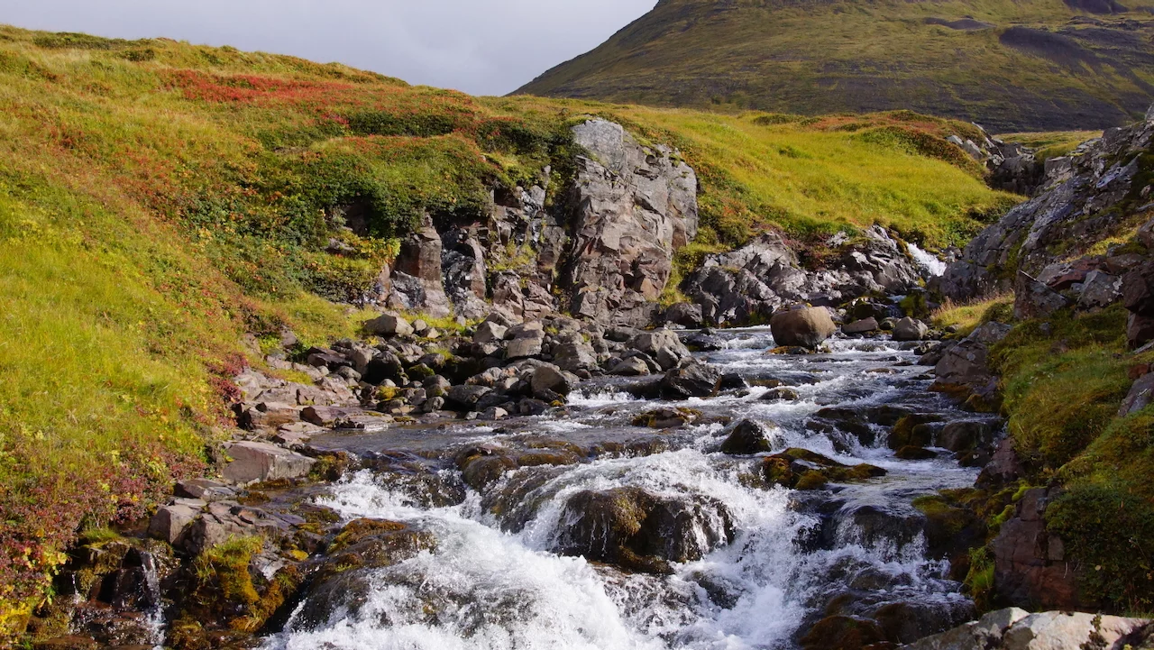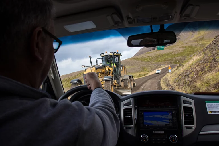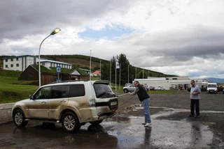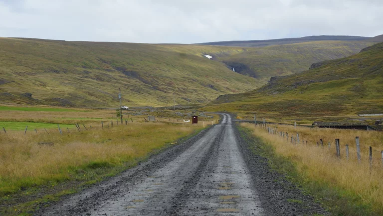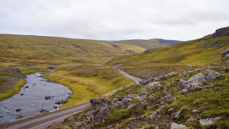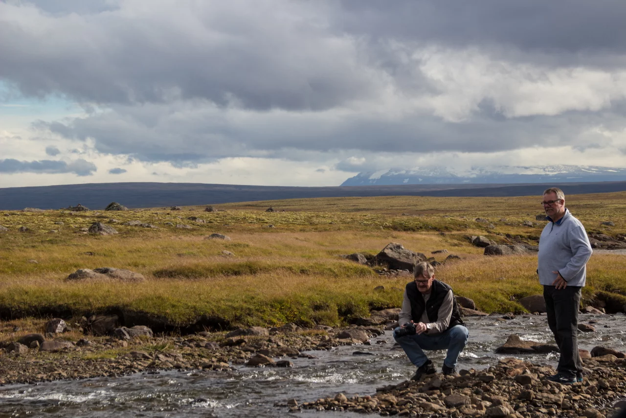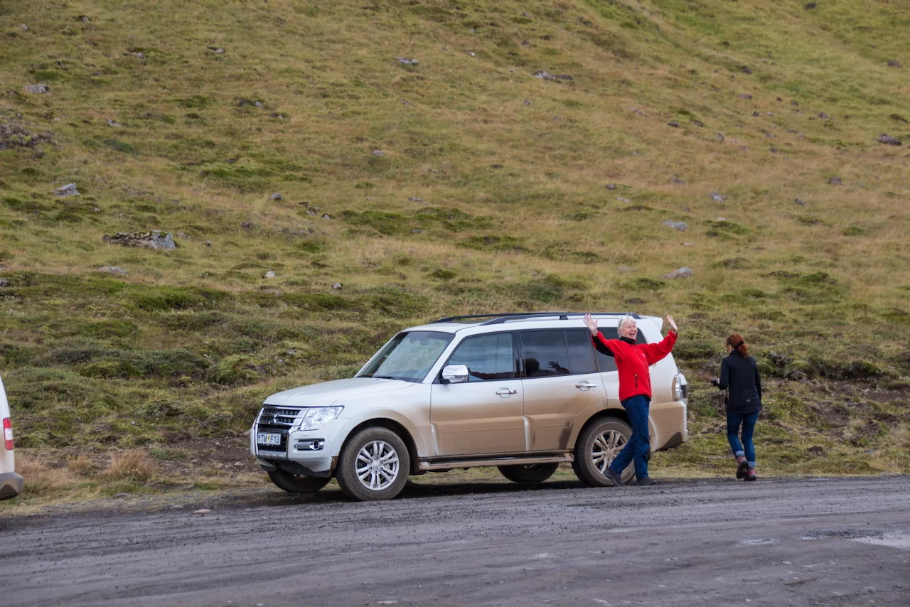 Lucy – ihr wisst schon, das Navi - wollte uns den einfachen, bequemen und deutlich schnelleren Weg über gut ausgebaute Strassen wie die N1 Ringstrasse nach Varmahlid, unserem nächsten Übernachtungsort, führen. Das hätte aber einen Umweg von gut 60km bedeutet. Google bot eine entsprechend kürzere, aber landschaftlich viel interessantere Route über eine nicht asphaltierte Nebenstrasse an, die allerdings für die letzten 27 Kilometern zu einer sogenannte F-Road wurde. F-Roads sind in Island einfache Schotterstraßen mit teilweise Feldweg ähnlichen Charakter, die man ausschließlich nur mit Allradfahrzeugen befahren darf. Und nach gut einem Drittel der Strecke wurde uns endgültig klar, warum das so ist. War die Straße bis dahin schon ziemlich anspruchsvoll für Mensch und Auto, gespickt mit Schlaglöchern und Pfützen so groß wie kleine Seen, welche die gesamte Breite der Fahrbahn bedeckten, standen wir urplötzlich vor einem respektablen Flusslauf. Auf der anderen Seite war der weitere Verlauf der „Strasse“ deutlich zu erkennen, aber die Regenfälle der letzten Tage hatten den Fluß stark anschwellen lassen und für eine ziemlich kräftige Strömung gesorgt. Aufgrund der hohen Fliessgeschwindigkeit des Wassers war die Beschaffenheit des Flussbettes auch nicht wirklich zu erkennen. Also, was tun?? Umkehren war eigentlich schon aufgrund des damit verbundenen Zeitverlustes keine wirkliche Option mehr. Und so kam nach kurzer Beratung die Entscheidung „Augen zu und durch“. Zum Allradantrieb noch die Differentialsperre zuschalten, und dann ab die Post Richtung anderes Ufer. Es war dann doch einfacher als erwartet, aber die Erleichterung war trotzdem groß, als wir sicher und problemlos die andere Seite erreicht hatten.