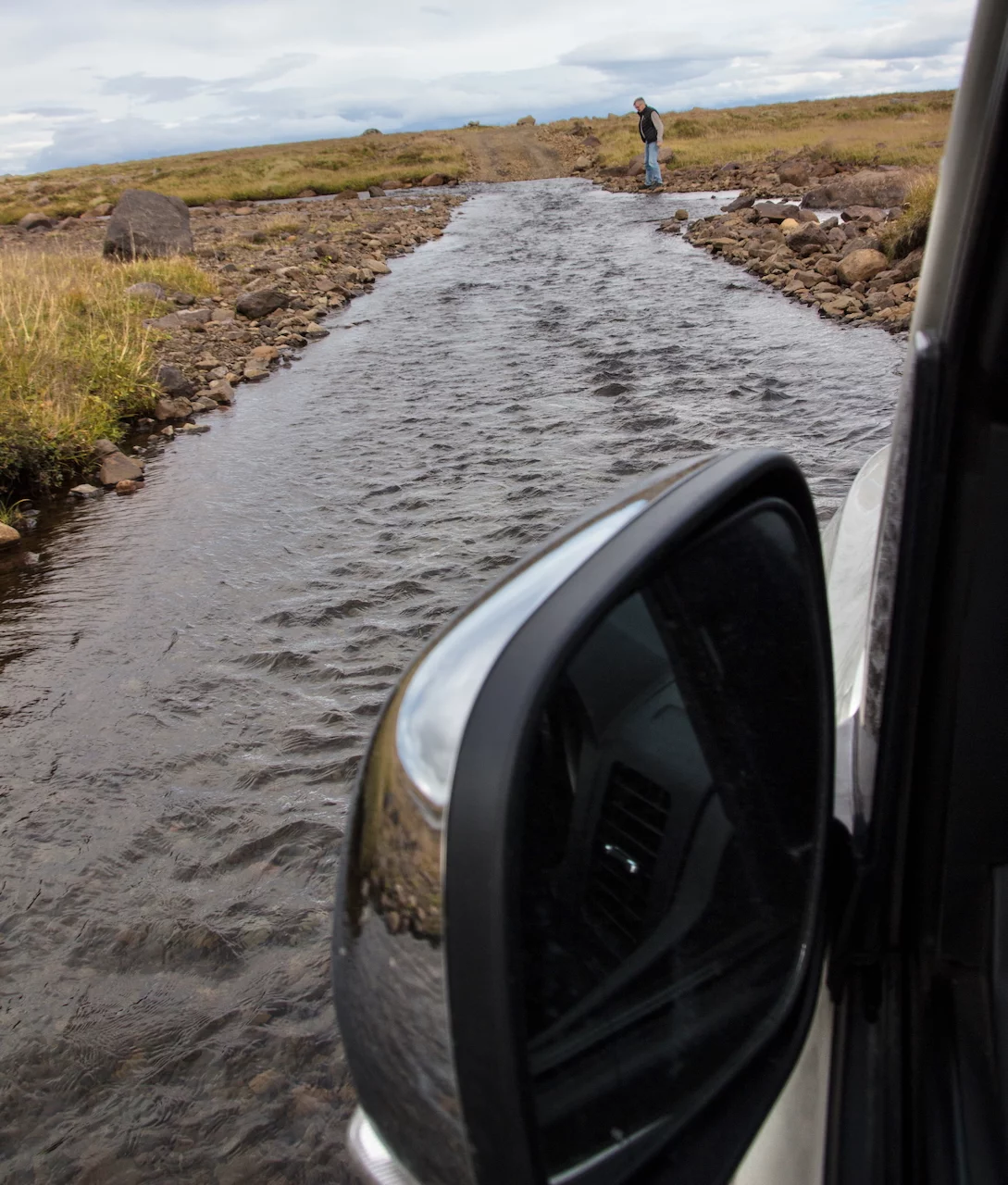 Der erste Teil bis zur Linkskurve sah noch relativ einfach aus. Das Wasser war hier nicht sehr hoch, und auch das Flussbett sah gut aus. Doch wie es nach der Kurve bis zum gegenüberliegenden Ufer aussah, war nicht auszumachen. Dazu mussten wir irgendwie an den Uferbereich nach der Linkskurve kommen, was zu Fuss aber nicht möglich war. Das bedeutete, entweder einfach drauf los zufahren ohne zu schauen wie das Flussbett aussieht und zu hoffen, dass wir nicht stecken bleiben, oder den Wagen in der Linkskurve so dicht an das Ufer zu steuern, das Hartmut aussteigen konnte um den Rest der Strecke im Flussbett zu begutachten und mich quasi von der anderen Seite durch den Fluss zu dirigieren. Es hieß aber auch, im Fluss anzuhalten, Hartmut rauszulassen und anschließend wieder anzufahren und den entsprechenden Schwung aufzunehmen um auf der anderen Seite heil aus dem Wasser zu kommen. Wir haben uns dann für diese Option entschieden, und es hat dann auch prima geklappt. Hartmut konnte sogar noch ein paar schöne Bilder von der Durchfahrt im Fluss machen.