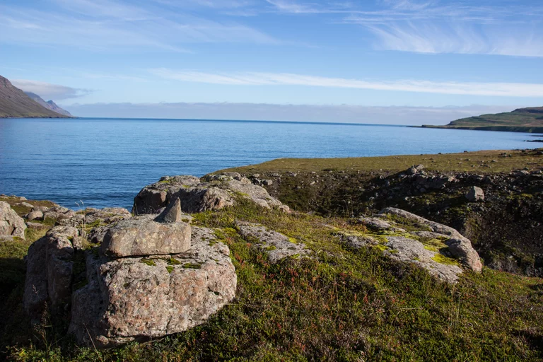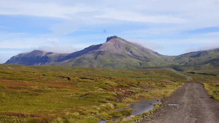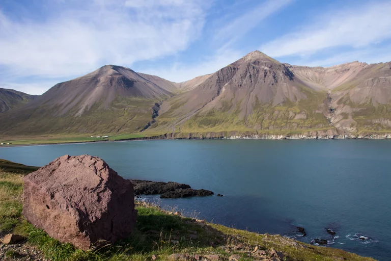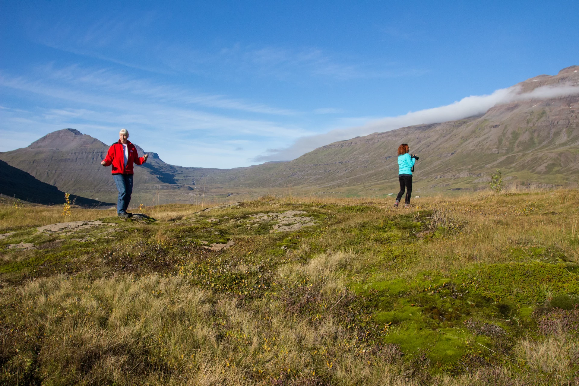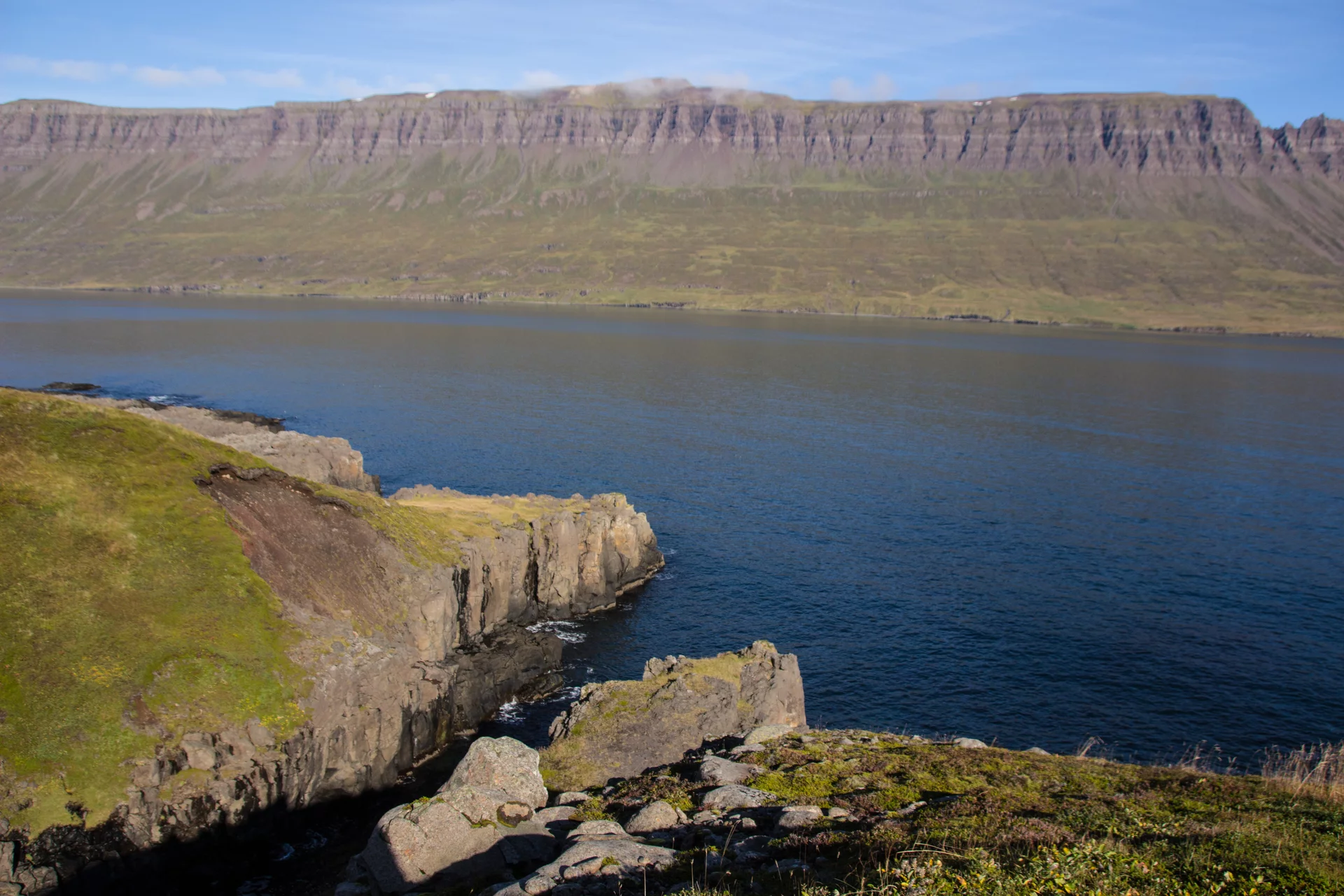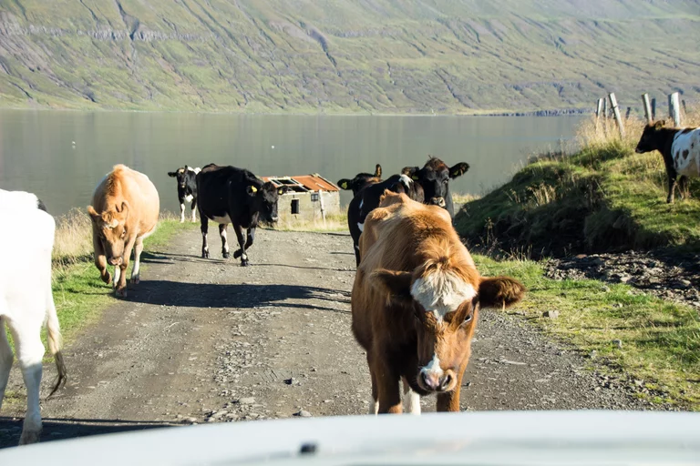 Endlich ist sie da, die Sonne. Die perfekte Kulisse für unsere Tagestour durch den Nordosten. Es galt zunächst, "unseren" Fjord zu erkunden und so sind wir dann langsam über die Schotterstraße am rechten Ufer bis zur Fjordmündung gefahren. Langsam war hier das Zauberwort, denn abgesehen von dem schlechten Zustand der Straße (ohne 4x4 geht da nix), können einem auch schnell mal unvorhergesehene tierische Hindernisse den Weg versperren, zumindest temporär. Es hat schon eine geraume Zeit gedauert, bis wir die sture Kuh zur Freigabe der Straße bewegen konnten. Hier zeigt sich Mutter Natur von Ihrer schönsten Seite und natürlich sind die Kameras fast heiß gelaufen.