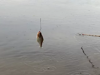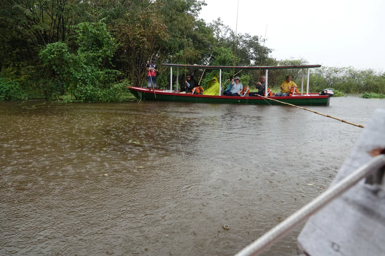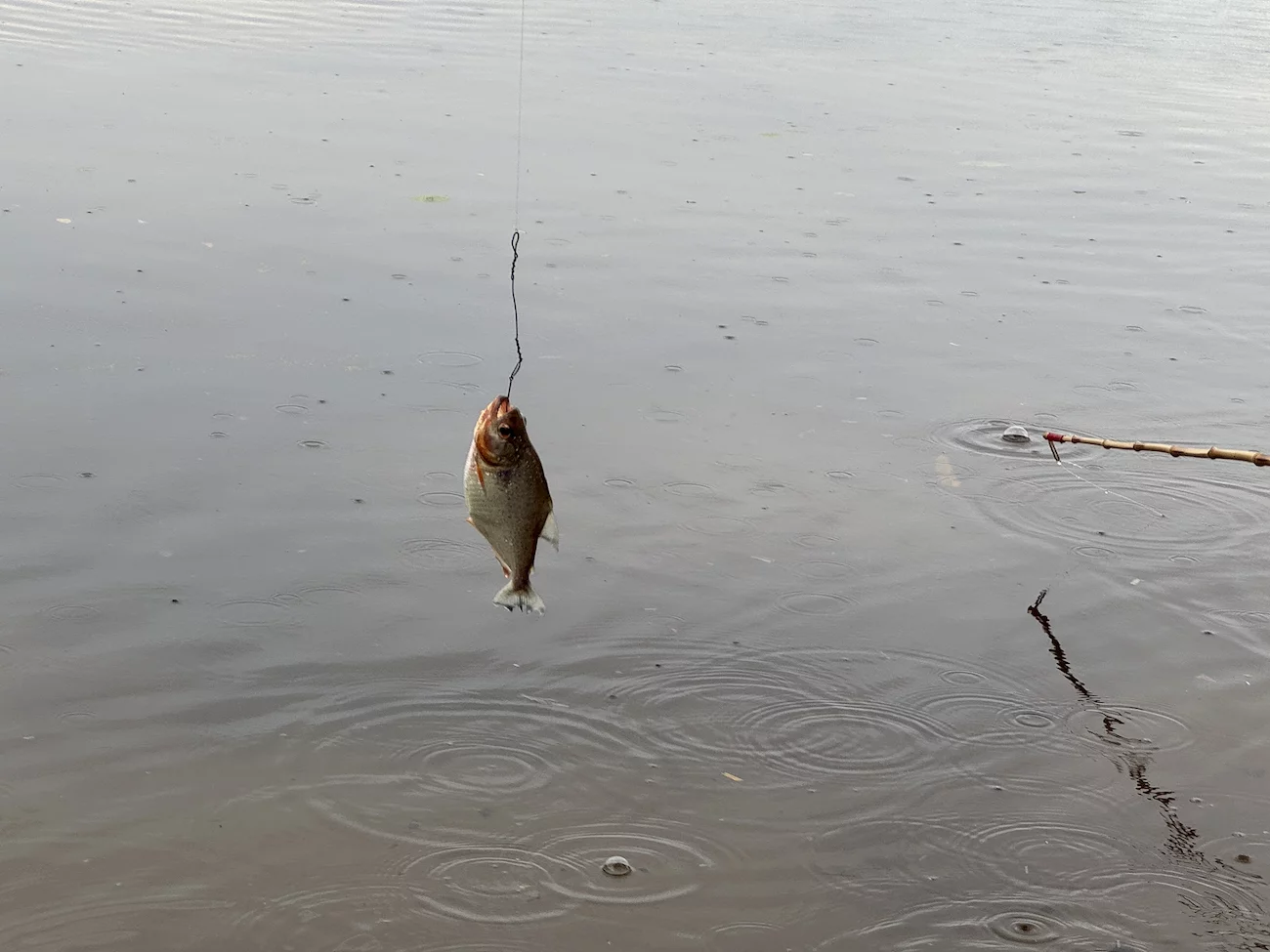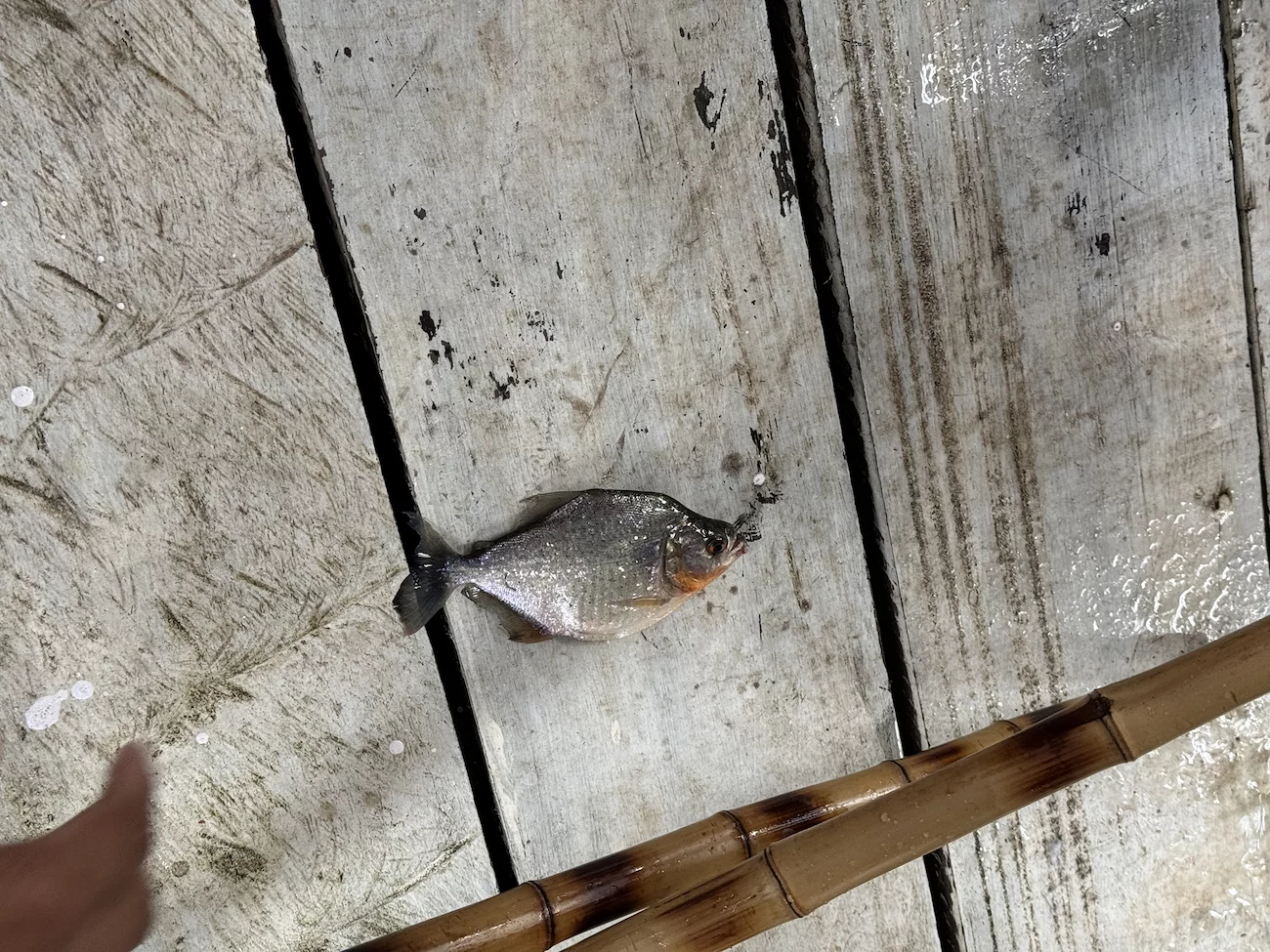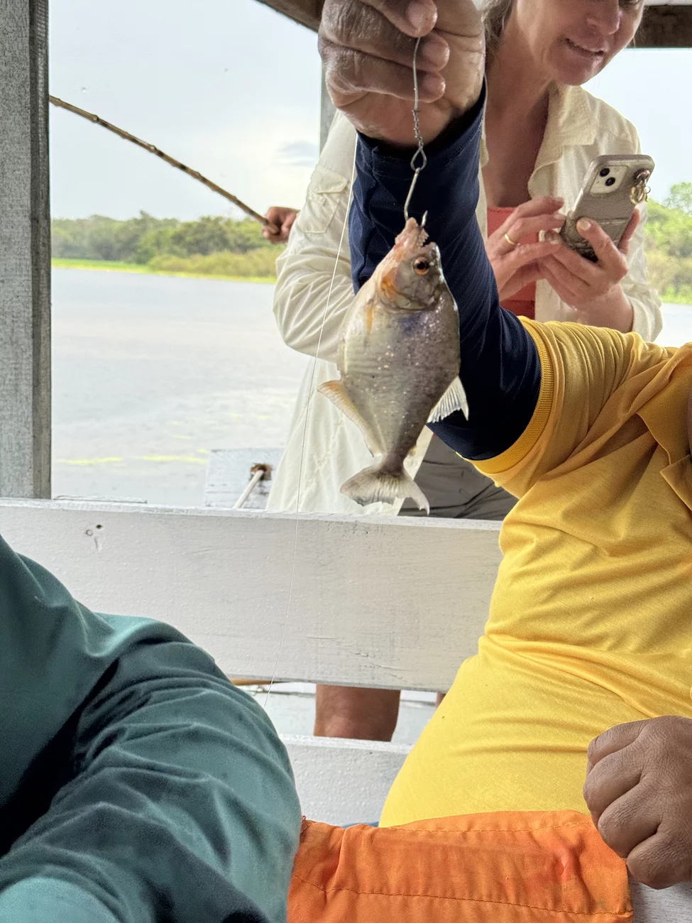 Schlußendlich hat es aber doch gekappt und die Angeln konnten ausgeworfen werden. Wobei es sich bei der “Angelrute” um einen simplen Rohrstock mit einem Stück Seil und einem Haken am Ende handelt. Anfangs biss nicht allzu viel an, doch als der Regen aufhörte, hingen ruck zuck einige dieser scharfzahnigen Vertreter am Haken.