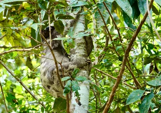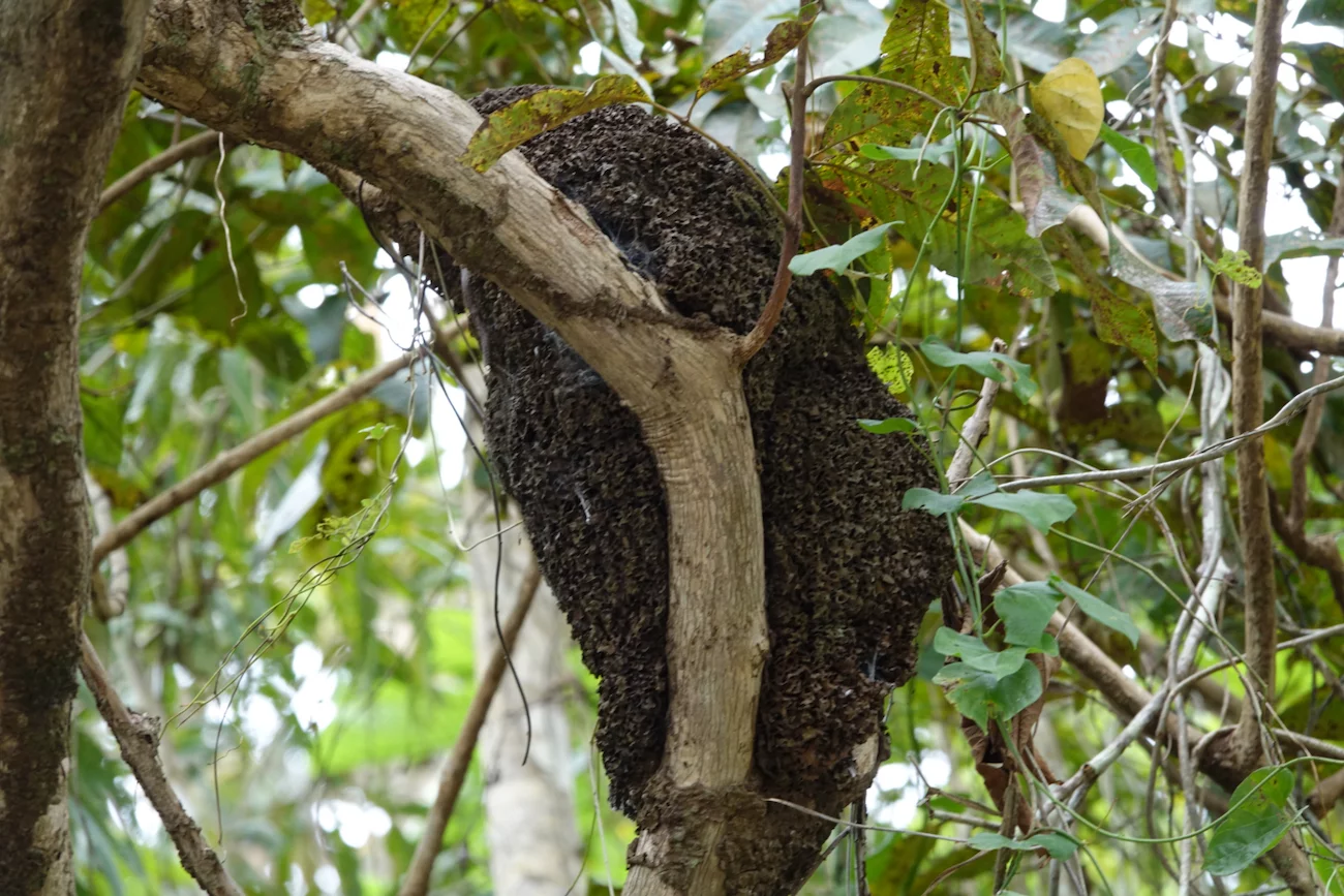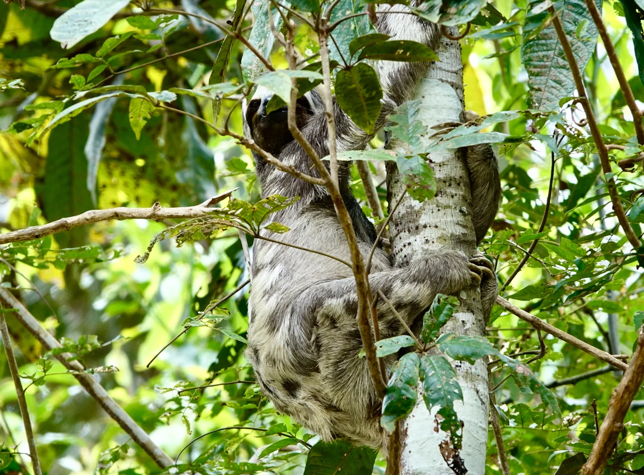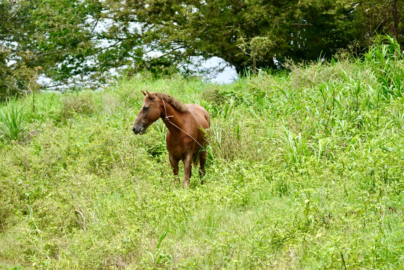 Nach der “Dorfbesichtigung” ging es dann weiter. Wir sind durch kleine Kanalöffnungen in den Schwarzwasser-Überschwemmungspark Igapo eingefahren. Ab dann hieß es nur noch Augen und Ohren auf, um ja nichts in dieser faszinierenden Flora und Fauna zu verpassen. Immer wieder waren am Ufer auch noch ein paar “Häuser” zu sehen. Doch dann war uns das Fotografenglück hold. Erst kam ein Iguana in Sicht, der sich oben im Baum ganz flach an einen Ast drückte, und kurze Zeit später kam uns ein Faultier vor die Linse, welches es sich direkt neben einem großen Termitennest gemütlich gemacht hatte. Da wir mit mehreren kleinen Booten unterwegs waren, führte die Sichtung der Tiere natürlich zu einem kleinen “Verkehrsstau” auf dem schmalen Kanal, der von einem Pferd am anderen Ufer mit großen Augen etwas verwundert beobachtet wurde.