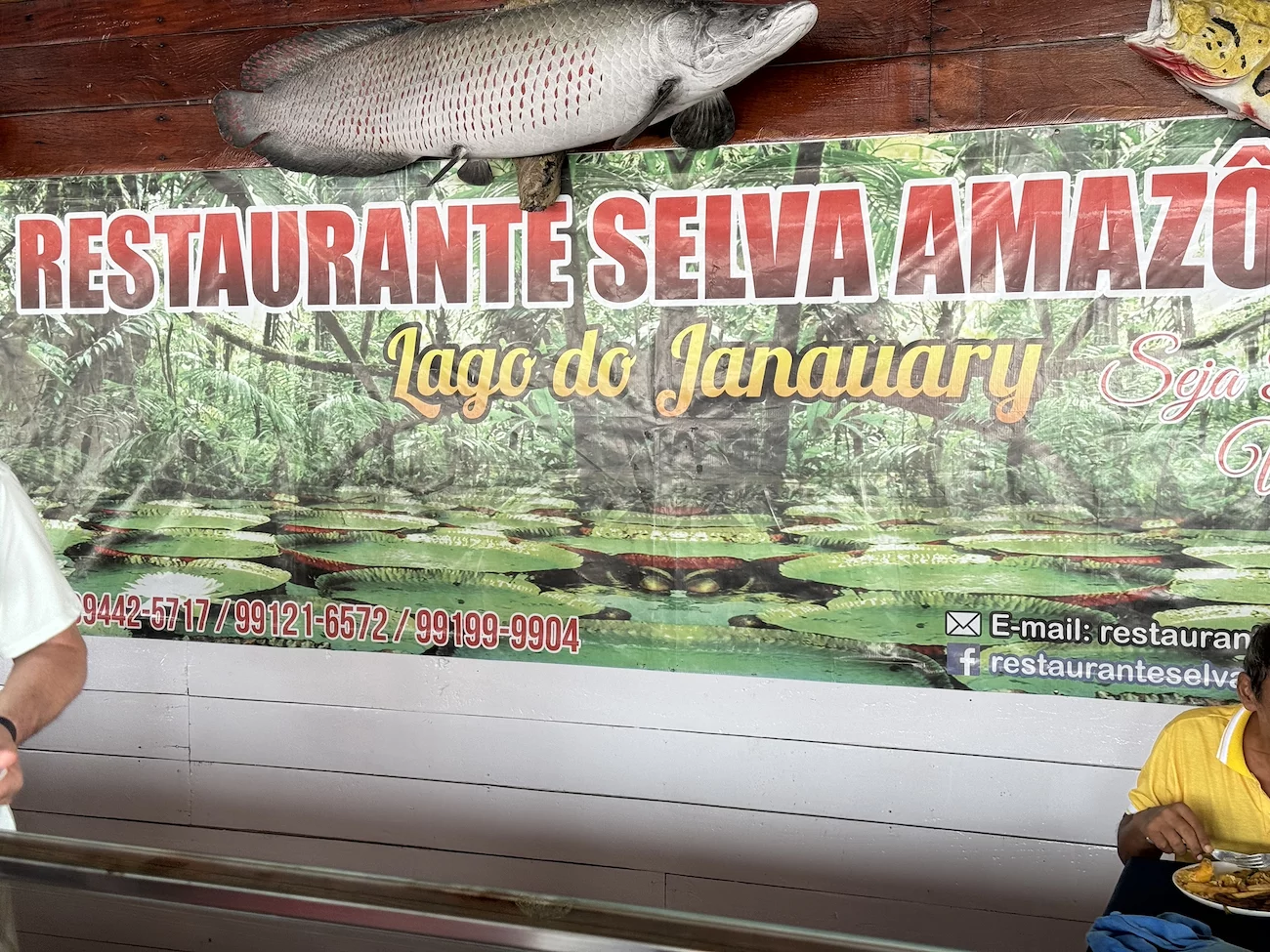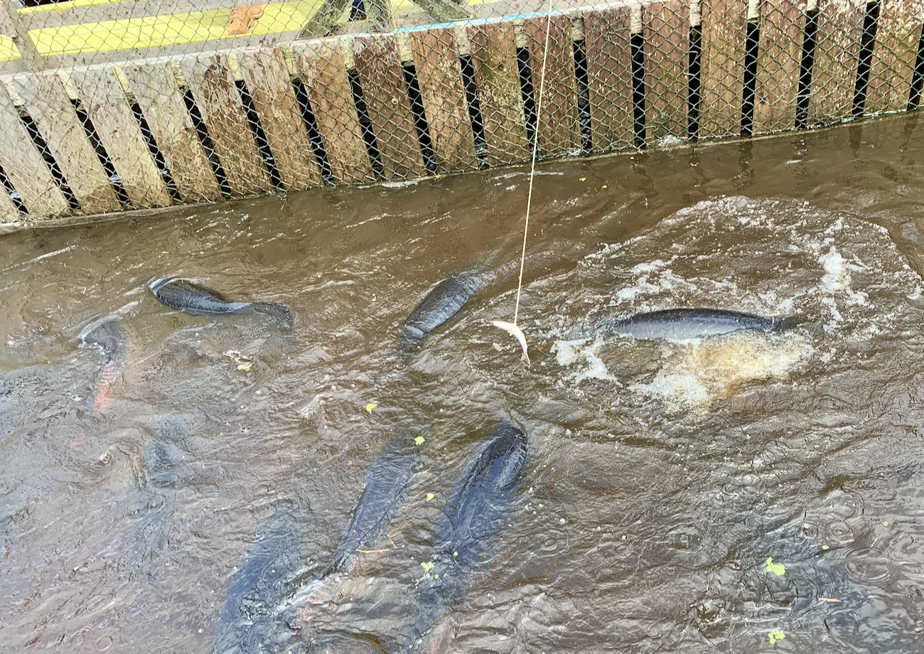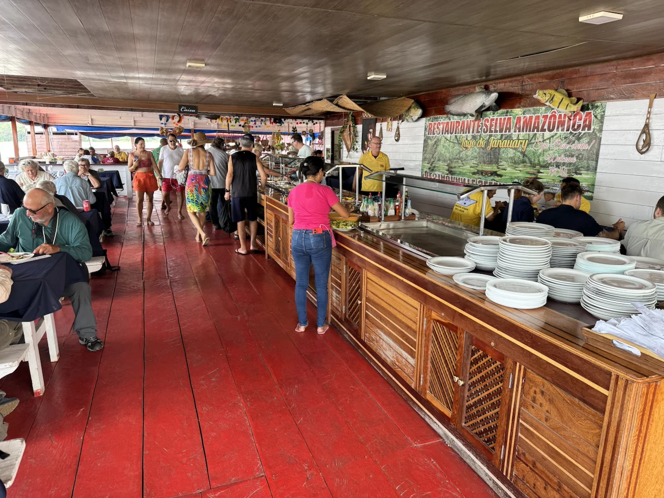 Zur Bootswechselstation gehört natürlich auch ein Souvenirladen, Attraktion ist aber ein eingezäunter Pool, in dem mehrere Arapaima’s schwammen. Der Arapaima, oder wie er hier in Brasilien auch genannt wird, der Pirarucu, ist der größte Fisch des Amazonas und kann über 2 Meter lang und über 130 Kilogramm schwer werden. Wer wollte, konnte eine Angel an der ein Fisch mit einem Seil befestigt ist knapp über die Wasseroberfläche halten. Dann bekommt man sehr schnell zu sehen und zu spüren, warum der Arapaima als der gefährlichste Fisch im Amazonas angesehen wird. Das Wasser brodelt kurz auf, dann tut es einen Knall wenn die Kiefer zusammen klappen und an der Angel hängt nur noch ein kurzes Stück Seil. Lottchen hat einen Versuch unternommen und war nicht nur den Fisch an ihrer Angel direkt wieder los, sondern hatte auch Glück, das ihr die selbige nicht aus den Händen gerissen wurde. Neben Touristen 😉, gehören Piranhas zu seiner Leibspeise. Umgekehrt können die Piranhas ihm nichts anhaben, da die Schuppen des Arapaima extrem dicht und hart sind.